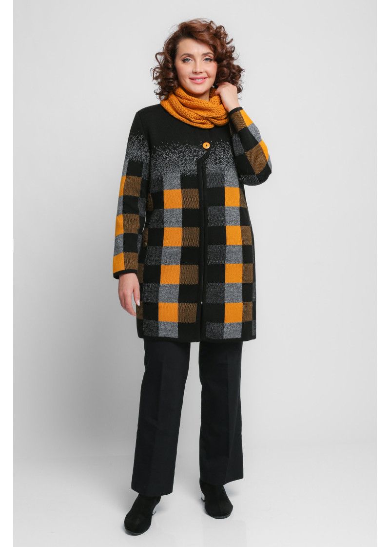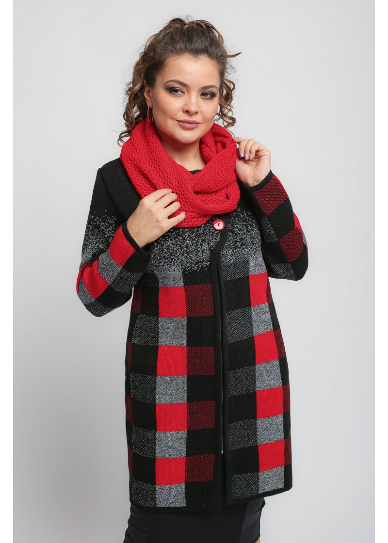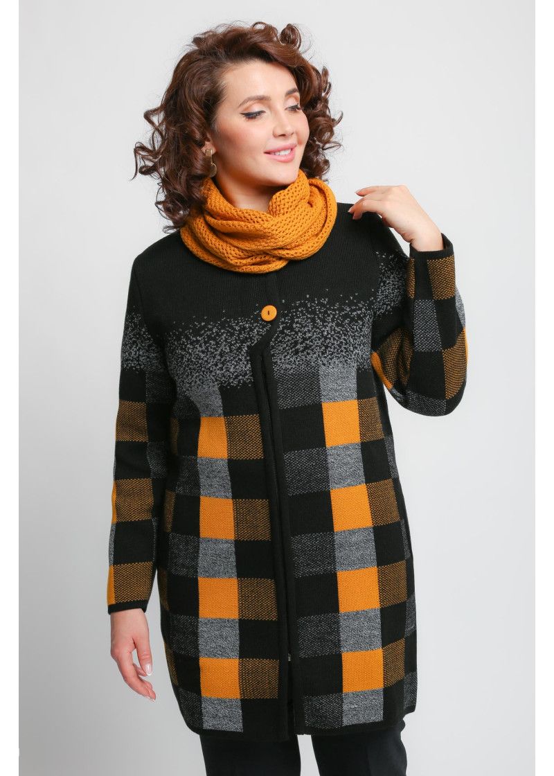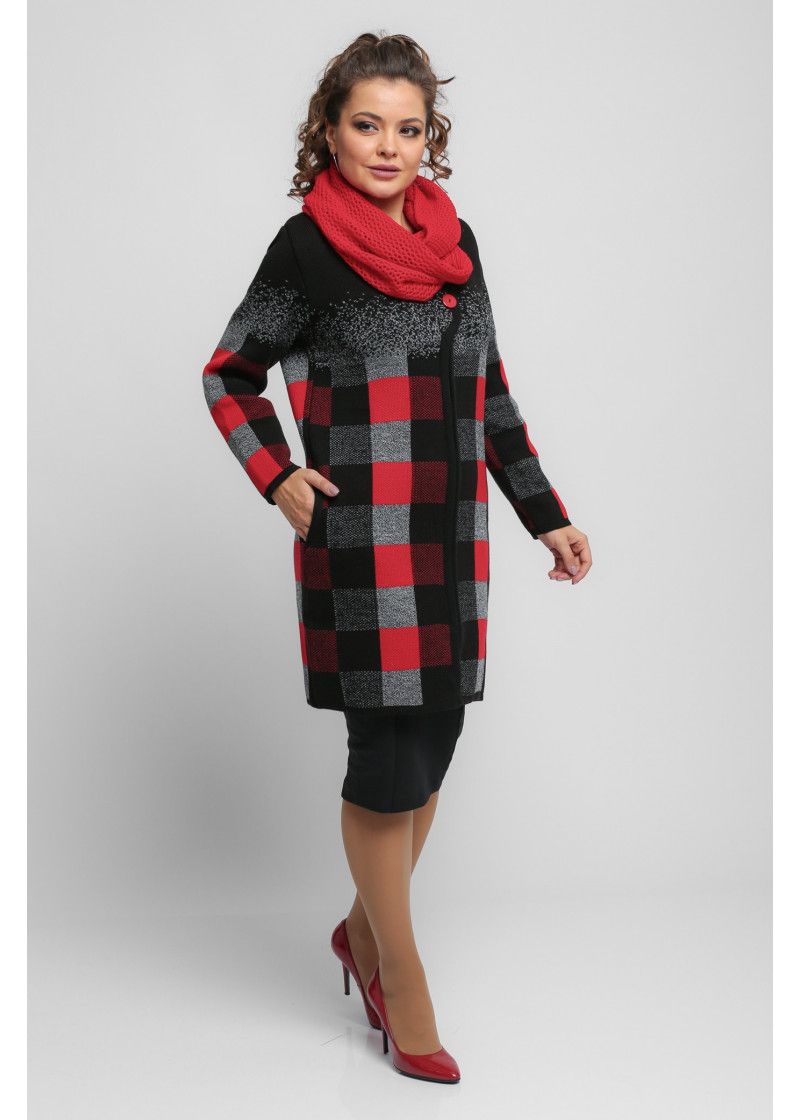 Женский эффектный вязанный кардиган с ассиметричным бортом. Кардиган на молнии по всей длине издели и декоративными застежками пуговицами по верху изделия.Рукава втачные длинные. Два прорезных кармана. Кардиган вывязан жаккардовым переплетением образующим геометрический рисунок. Он согреет вас в прохладный день и подарит ощущение невероятного комфорта. В комлект входит съемный ажурный шарф-снуд.
