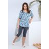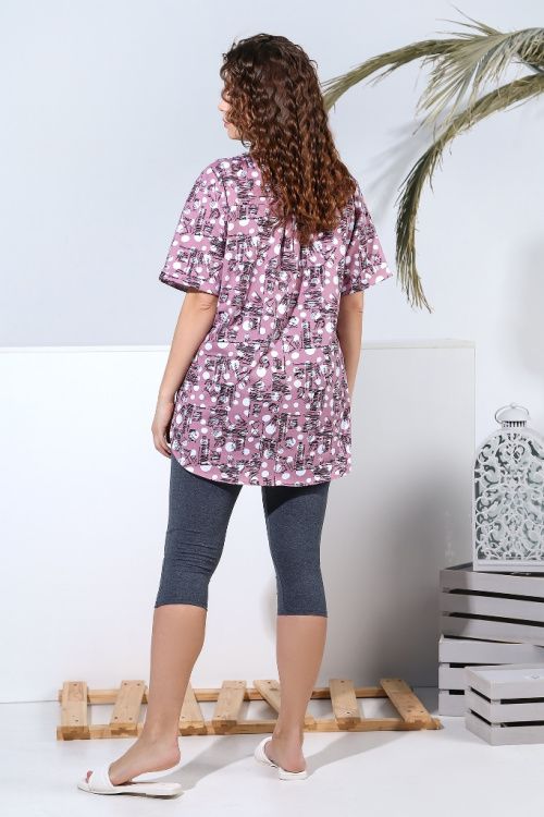 Из трикотажного полотна «кулирка» в комбинации двух видов в единой цветовой гамме: с набивным рисунком и гладкокрашеного, состоящий из туники и бриджей.
