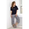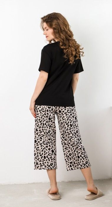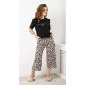 Брюки - из полотна с набивным рисунком, широкие, с карманами в боковых швах и притачным поясом с эластичной тесьмой внутри.