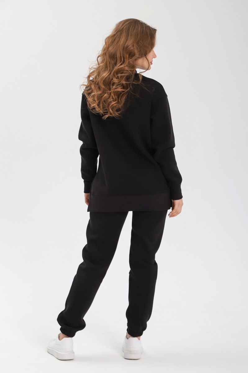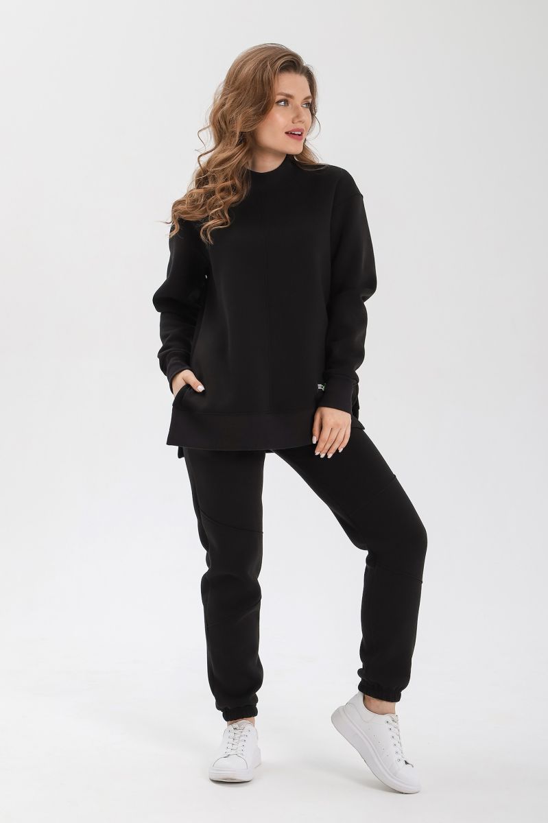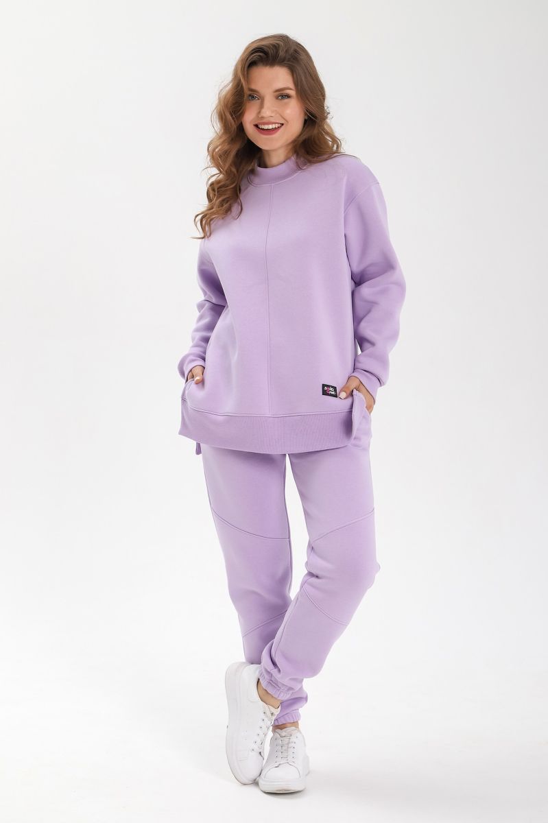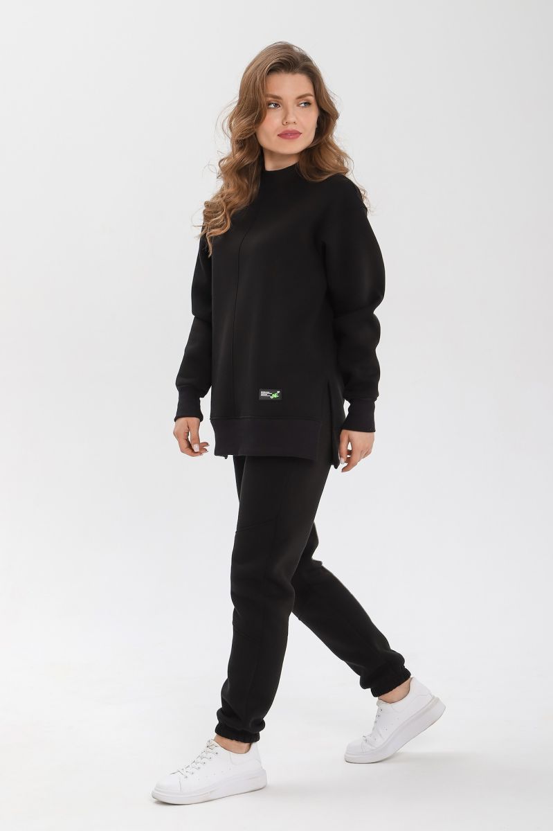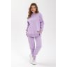 Костюм молодежный из гладкокрашеного трикотажного полотна «футер-трехнитка», состоящий из джемпера и брюк. Джемпер- удлиненный, прямого силуэта, с длинными втачными рукавами с притачными манжетами и полупоясами, воротником-стойкой и разрезами в боковых швах. Полочка – из двух деталей, со швом по центру. В нижней части левой полочки настрочен декоративный элемент прямоугольной формы. Манжеты, воротник и полупояса выполнены из трикотажного полотна «кашкорсе» в цвет основного материала. Брюки – длинные, с эластичной тесьмой по талии и низу, с карманами в боковых швах. Передние половины брюк – из трех частей каждая. В шве подгибки верхнего среза – шнурок, продетый через две петли в центре переда.