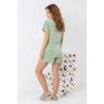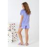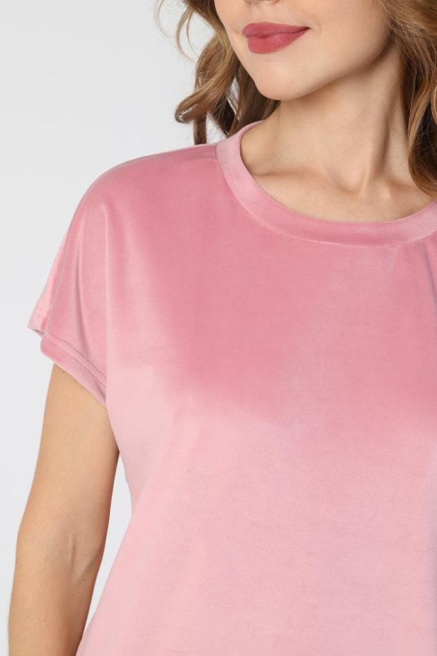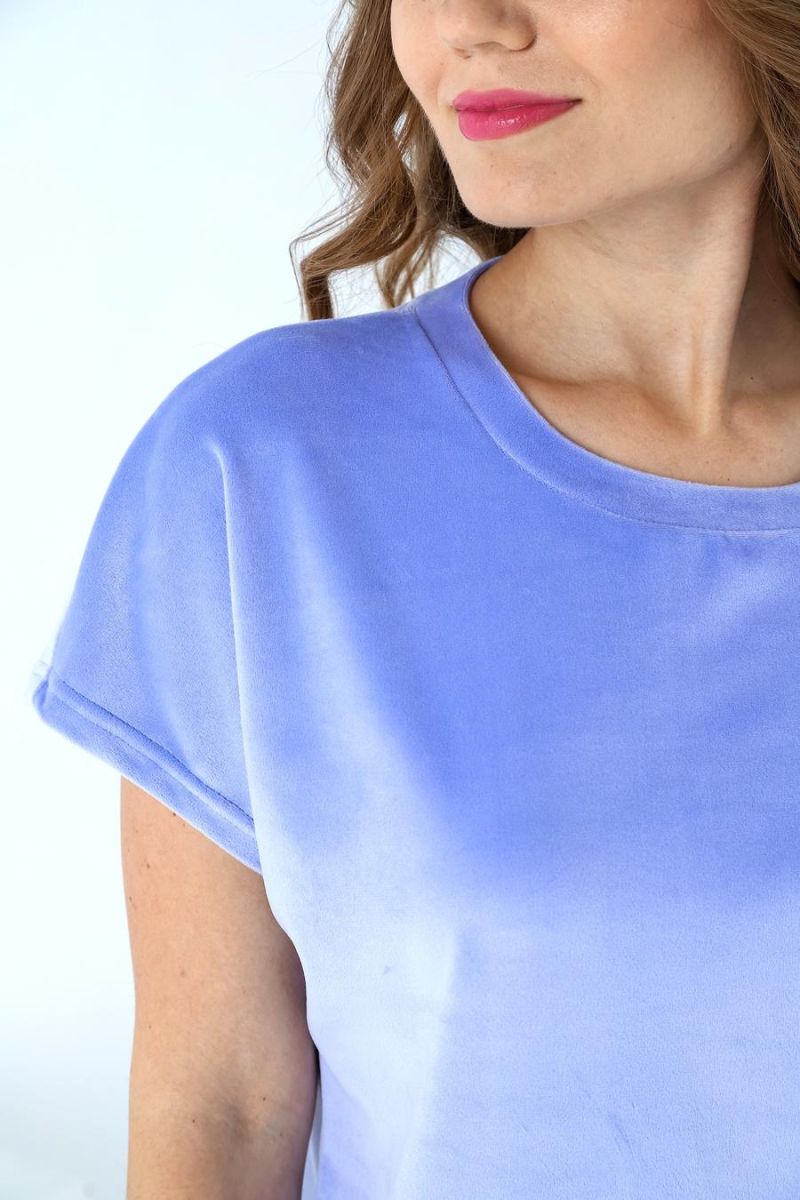 Костюм молодежный из трикотажного полотна «велюр-стрейч», состоящий из футболки и шорт. Футболка – классического покроя, с короткими цельнокроеными рукавами и горловиной овальной формы, обработанной втачной планкой. Шорты - средней длины, расширенные книзу, с эластичной тесьмой по талии.