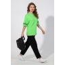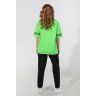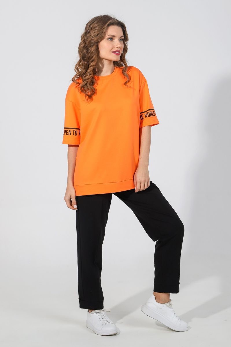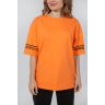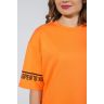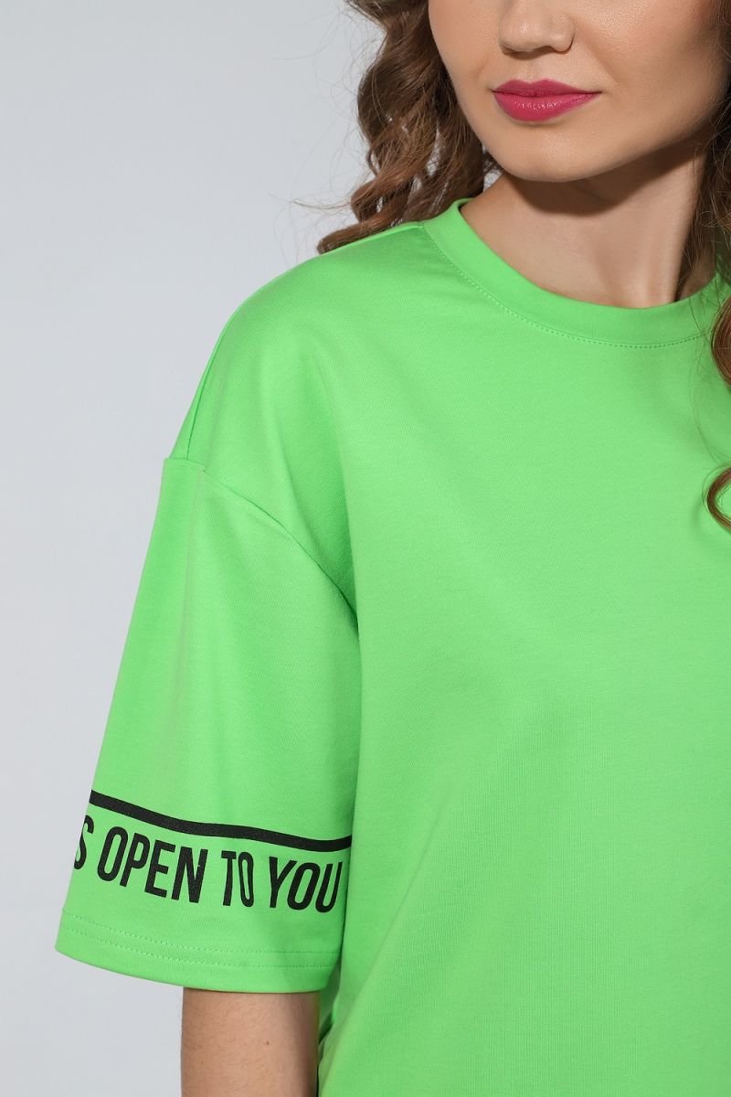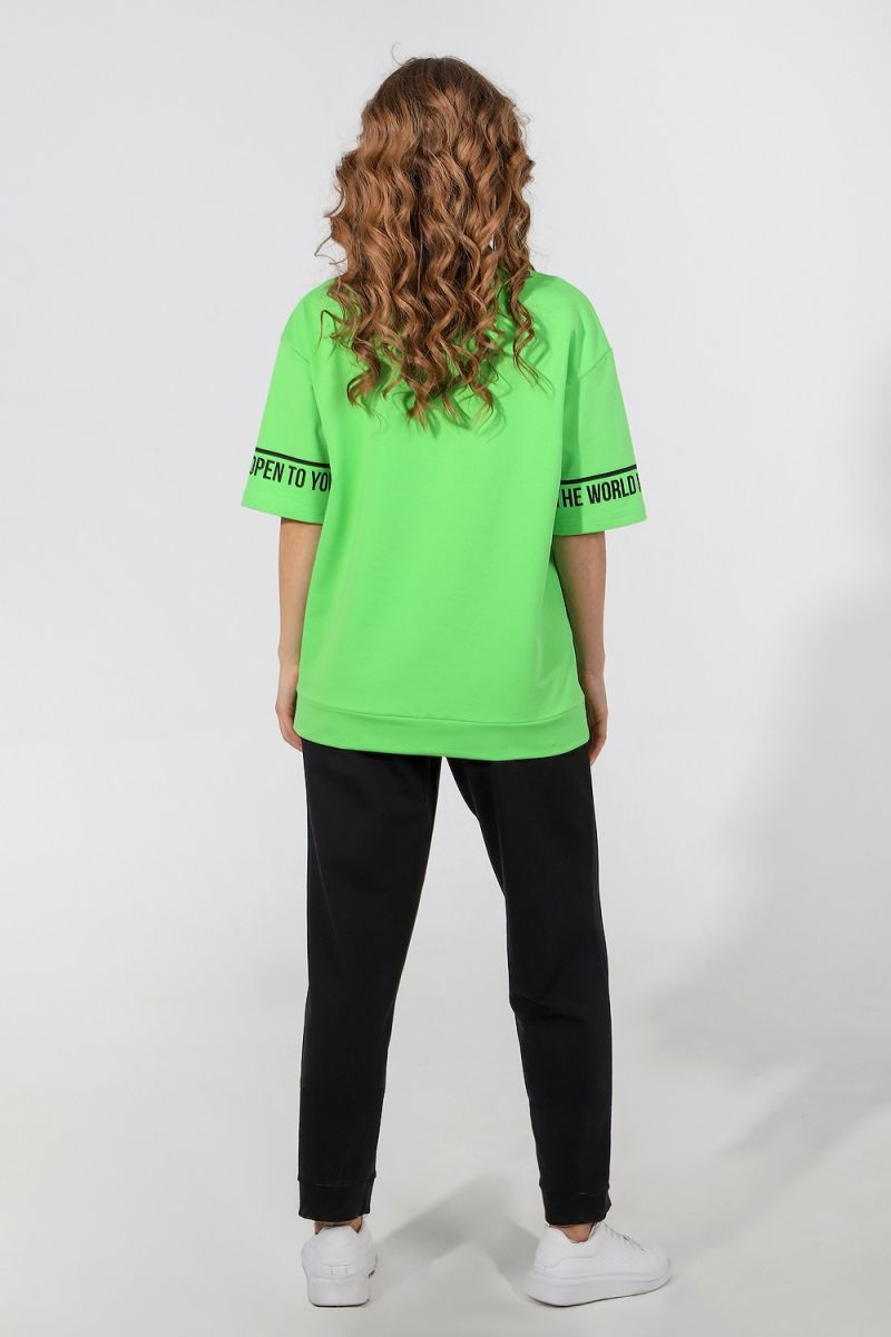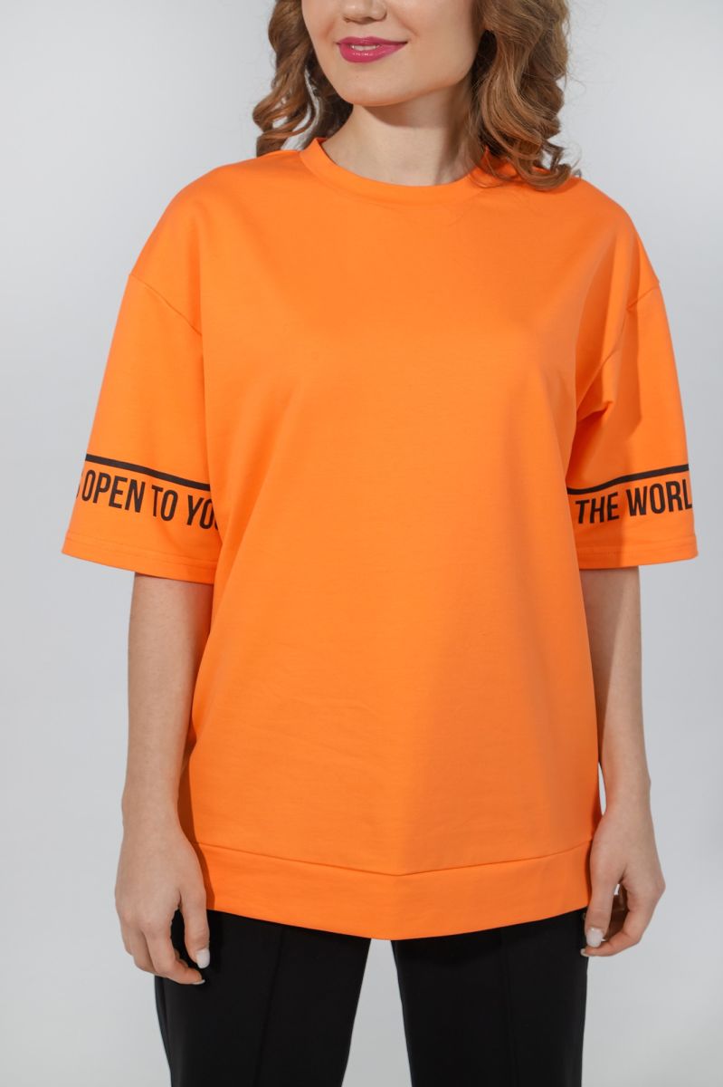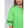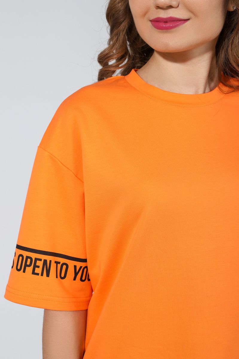 Футболка – прямого силуэта, с короткими втачными рукавами, горловиной овальной формы, обработанной втачной планкой, притачным поясом по низу и принтом на рукавах, выполненным в технике шелкографии.