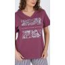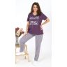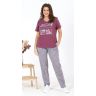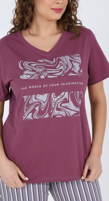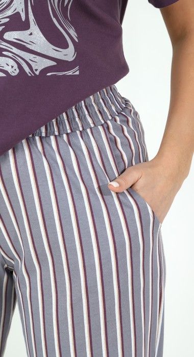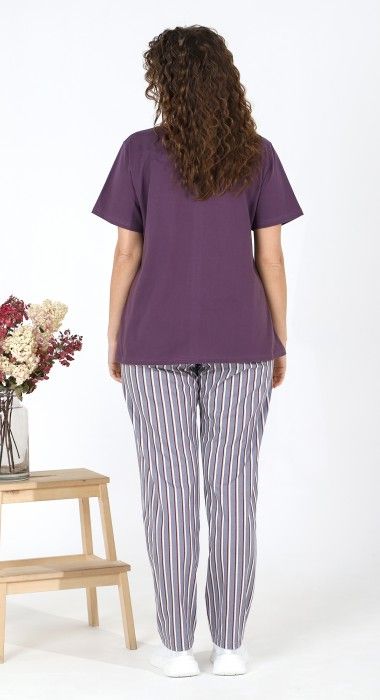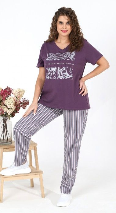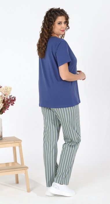 Костюм женский из трикотажного полотна «кулирка» в комбинации двух видов в единой цветовой гамме: гладкокрашеный и с набивным рисунком, состоящий из футболки и брюк. Футболка - из гладкокрашеного трикотажного полотна «кулирка» классического покроя, с короткими втачными рукавами, горловиной V-образной формы, обработанной втачной планкой и принтом на полочке. Брюки – из полотна в полоску, длинные, слегка зауженные книзу, на притачном поясе с эластичной тесьмой внутри, с карманами в боковых швах.