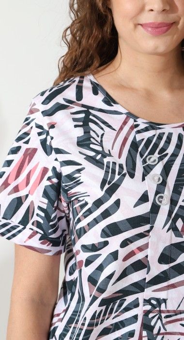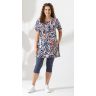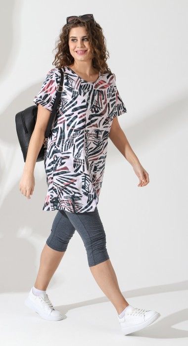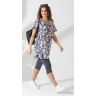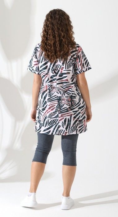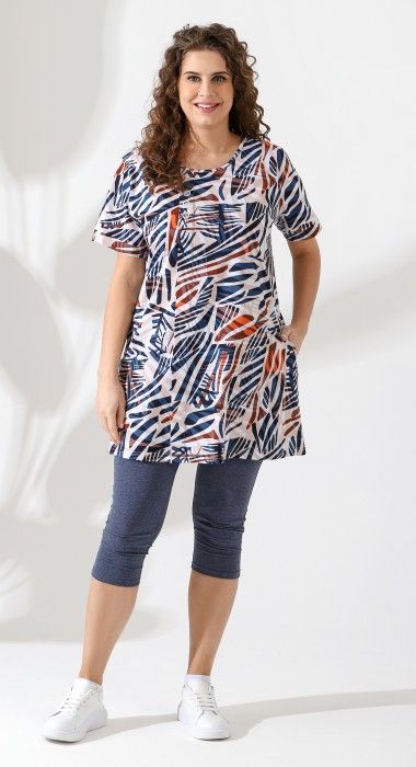 Костюм женский из трикотажного полотна «кулика» в комбинации двух видов: с набивным рисунком и гладкокрашеного меланжированного, состоящий из туники и бриджей-велосипедок. Туника – из полотна с набивным рисунком, свободного покроя, укороченная, с втачными короткими рукавами, карманами в боковых швах и горловиной овальной формы, окантованной основным материалом. Перед – с застроченной складкой, расположенной асимметрично относительно центра и имитирующей застежку на пуговицы. Рукава – с притачными манжетами. Бриджи-велосипедки – из меланжированного полотна «кулирка» классического покроя, плотного прилегания, с эластичной тесьмой по талии.