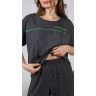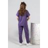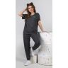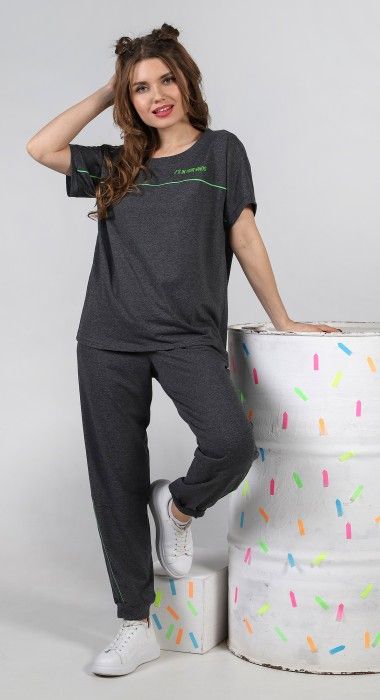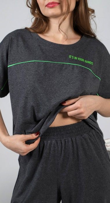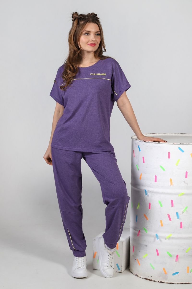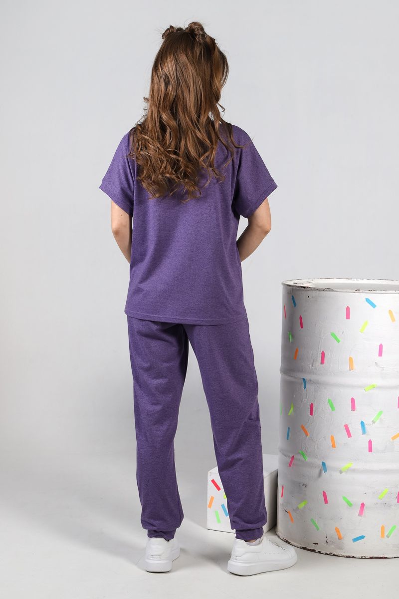 Костюм молодежный из гладкокрашеного меланжированого полотна «кулирка», состоящий из футболки и брюк. Футболка – с цельнокроеными короткими рукавами и горловиной овальной формы, обработанной втачной планкой. Основная деталь переда – отрезная выше линии груди, с кантом контрастного цвета в соединительном шве и принтом, выполненным в технике шелкографии. Нижние срезы рукавов - с притачными манжетами.