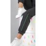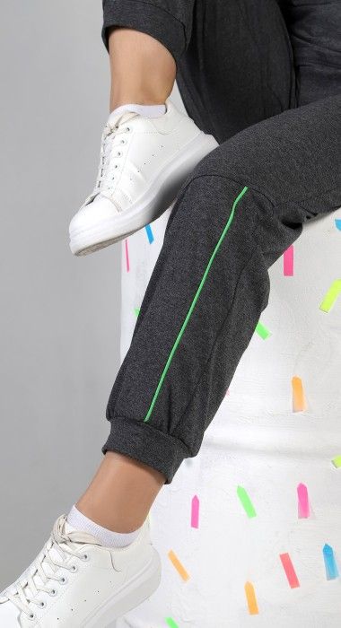 Брюки – длинные, на притачном поясе с эластичной тесьмой внутри, с карманами в боковых швах и притачными манжетами по низу. Передние половины брюк – из трех частей, с кантом контрастного цвета в вертикальных соединительных швах.