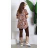 Костюм из трикотажного вискозного полотна в комбинации двух видов в единой цветовой гамме: гладкокрашеного и с набивным рисунком, состоящий из туники и леггинсов.