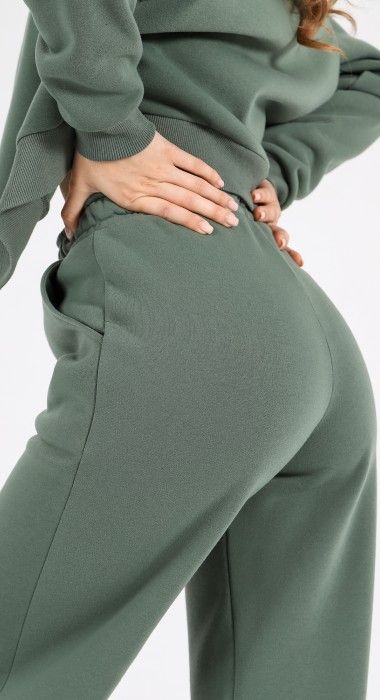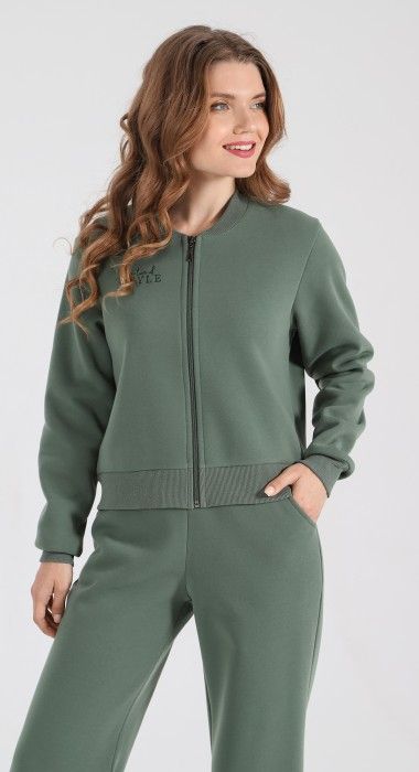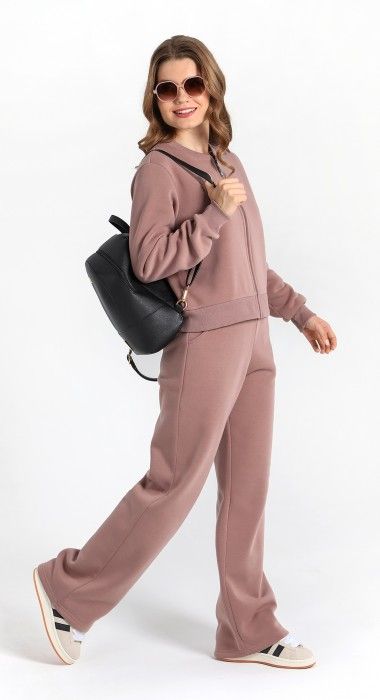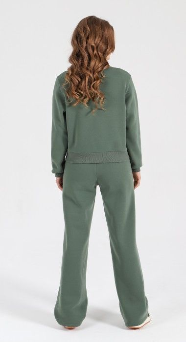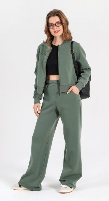 Костюм молодежный из гладкокрашенного полотна «футер» с начесом с отделкой трикотажным полотном «кашкорсе», состоящий из куртки и брюк. Куртка - прямого силуэта, укороченная, с длинными втачными рукавами, горловиной овальной формы, обработанной втачной планкой, центральной бортовой застежкой на тесьму «молния», притачным поясом и принтом на полочке, выполненным в технике «шелкографии». Притачной пояс, планка горловины, манжеты рукавов выполнены из «кашкорсе». Брюки – длинные, свободного покроя, на притачном поясе с эластичной тесьмой и карманами в боковых швах.