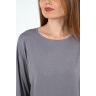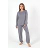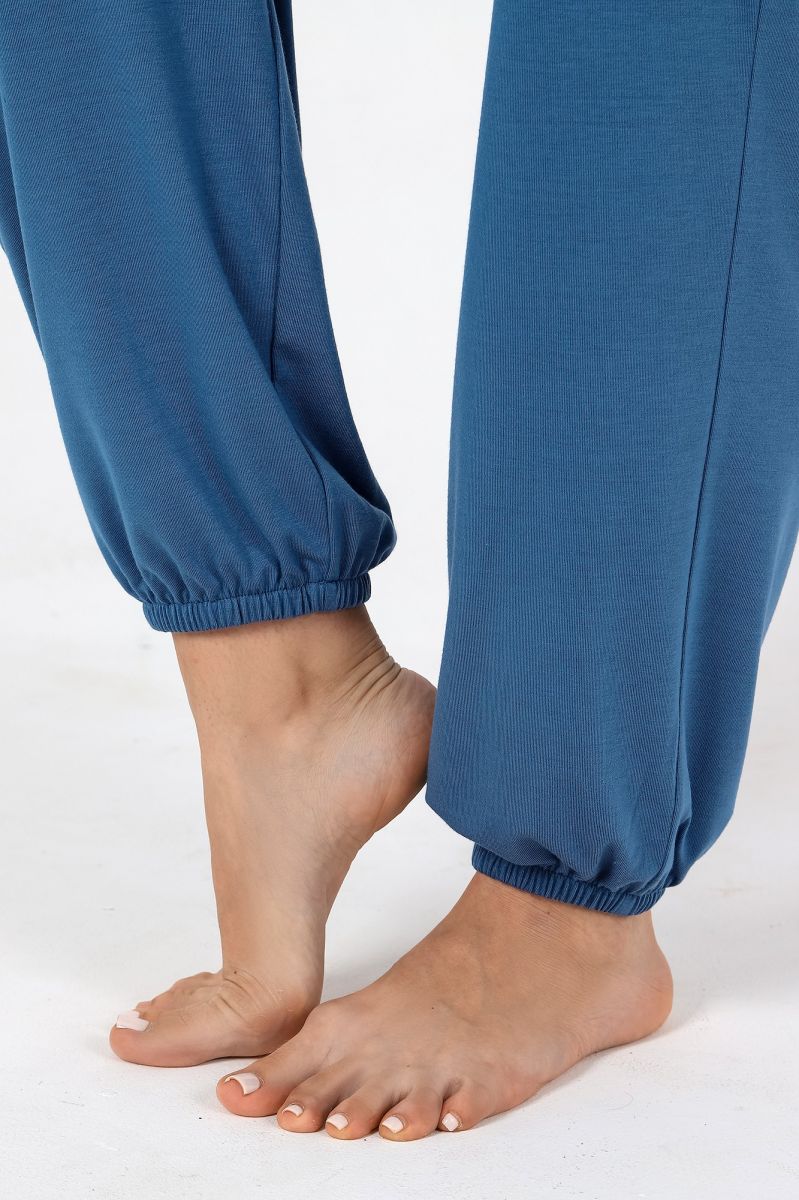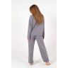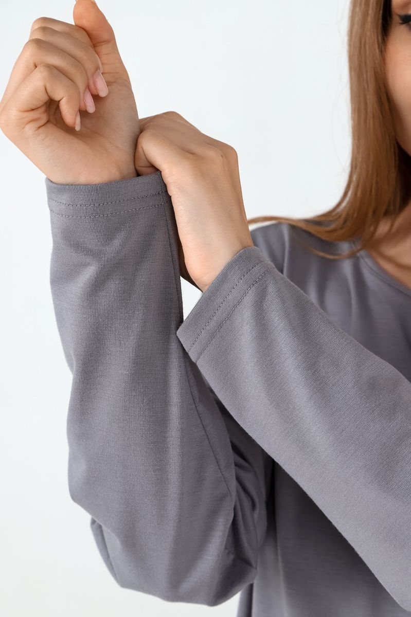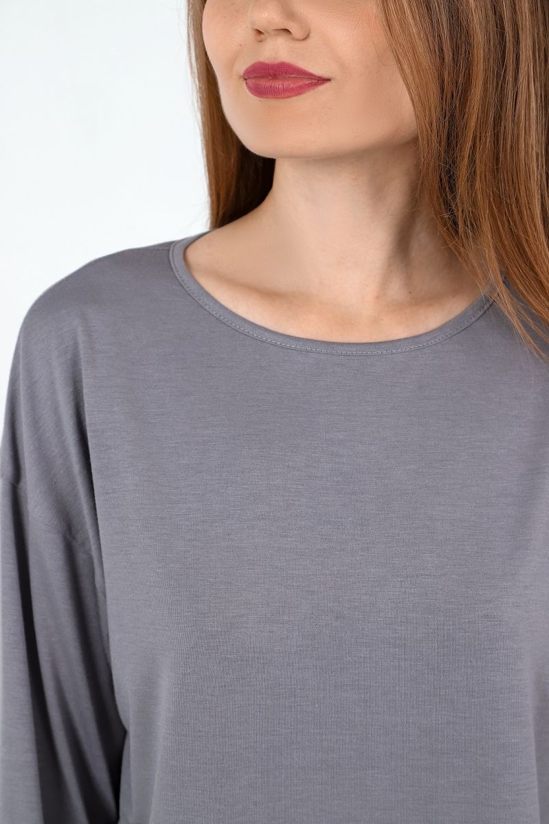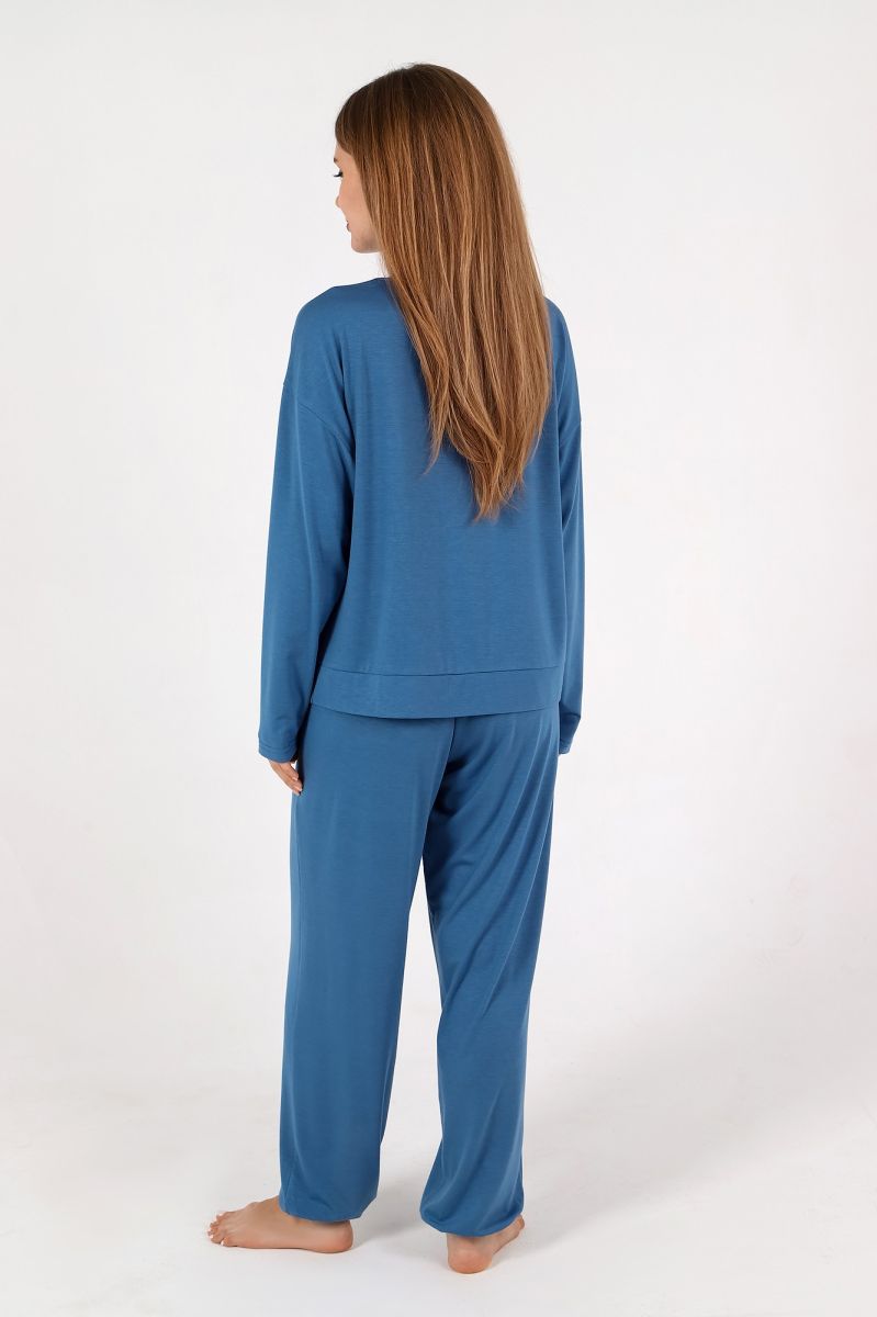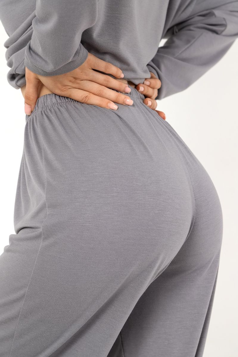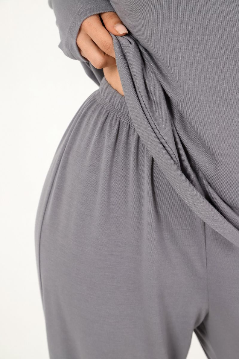 Пижама молодежная из гладкокрашеного трикотажного полотна «джерси», состоящая из лонгслива и брюк. Лонгслив - свободного покроя, с длинными втачными рукавами и горловиной овальной формы. Горловина окантована основным материалом, низ изделия с притачным поясом.Брюки – свободного покроя, с эластичной тесьмой по талии и нижним срезам.