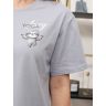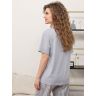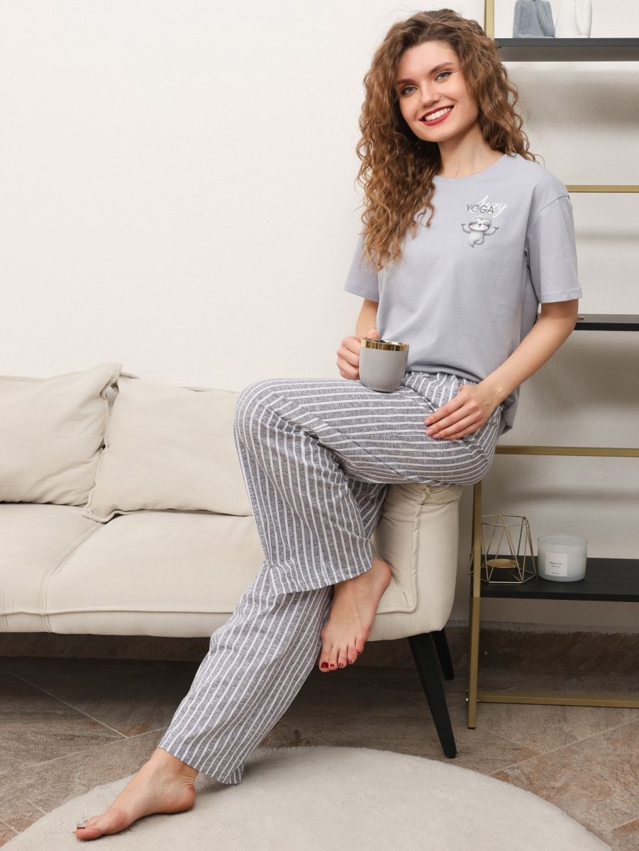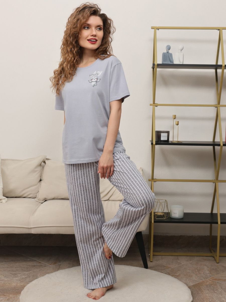 Футболка - из гладкокрашенного полотна, классического покроя, с короткими втачными рукавами, горловиной овальной формы и принтом на полочке, выполненным в технике «шелкографии». Горловина обработана втачной планкой из основного материала. Брюки - из полотна с набивным рисунком, длинные, слегка расширенные книзу, с карманами в боковых швах, на притачном поясе с эластичной тесьмой внутри.