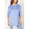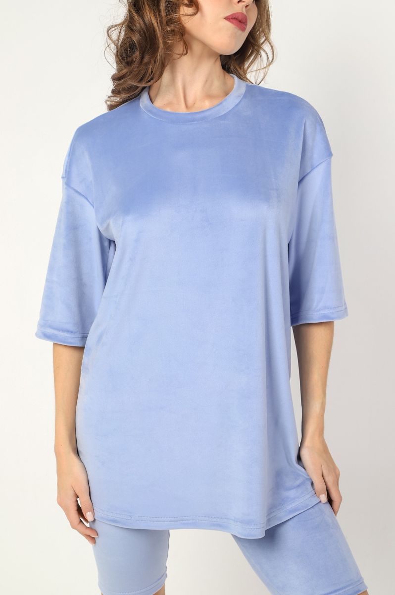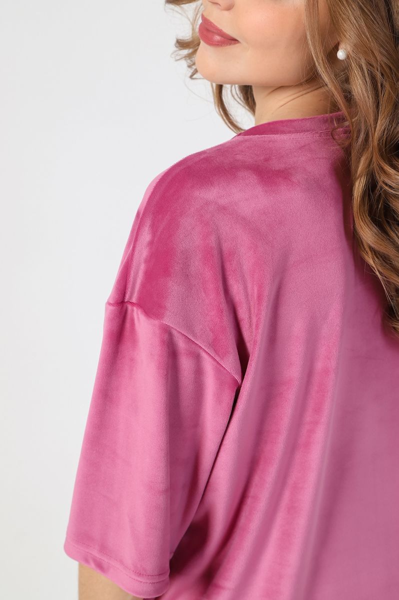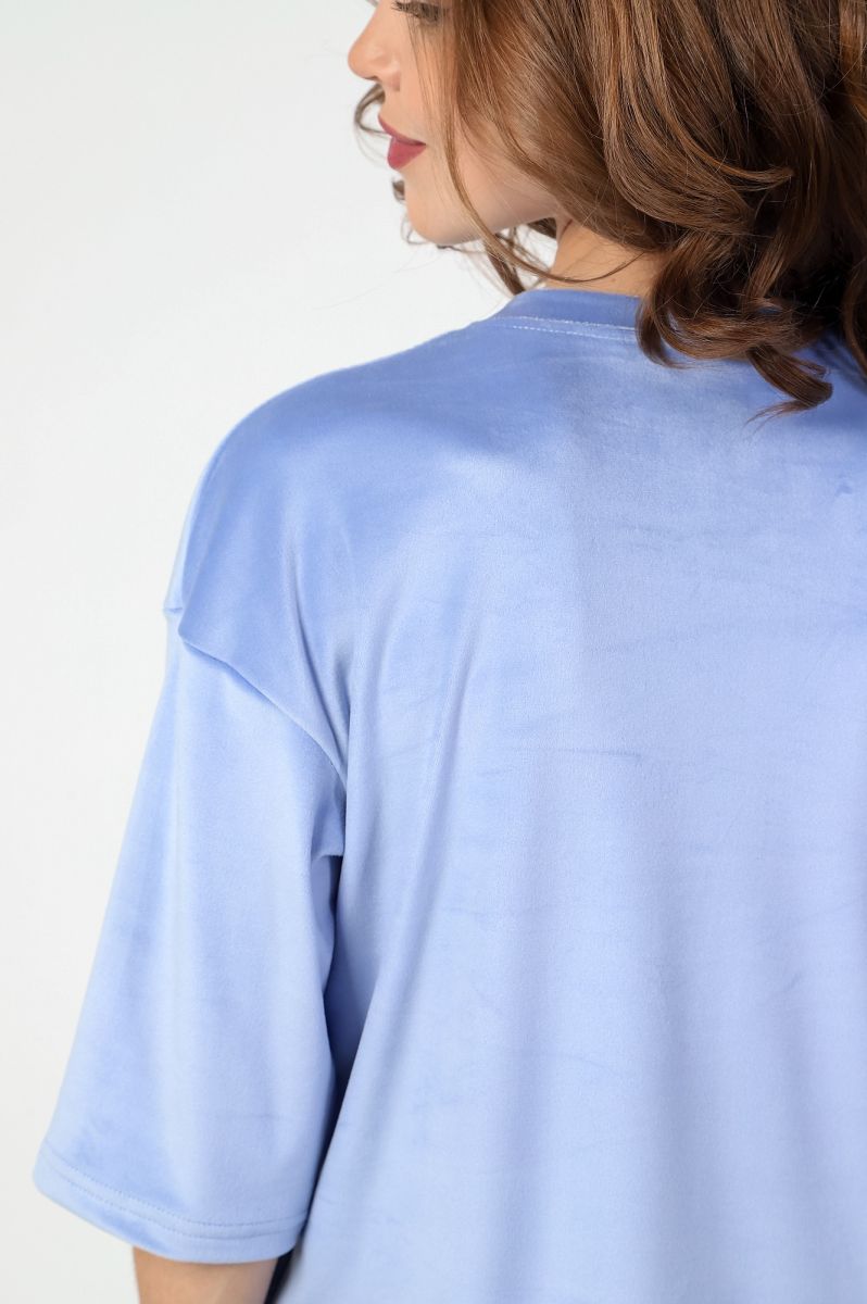 Костюм из гладкокрашеного трикотажного полотна «велюр стрейч», состоящий из футболки и леггинсов. Футболка – удлиненная, свободного покроя, со спущенной, линией плеча, короткими втачными рукавами, горловиной овальной формы, обработанной втачной планкой.Леггинсы – длиной до колен, с эластичной тесьмой по талии.