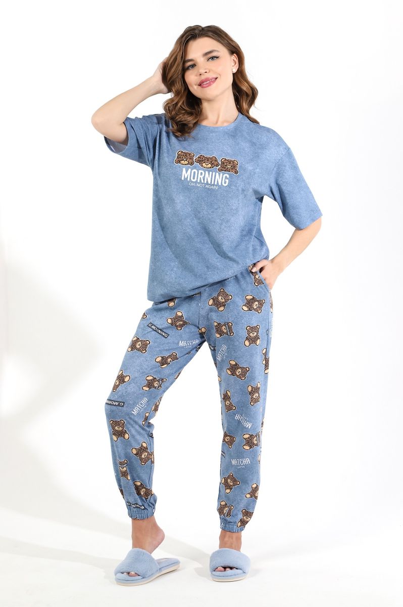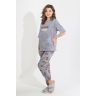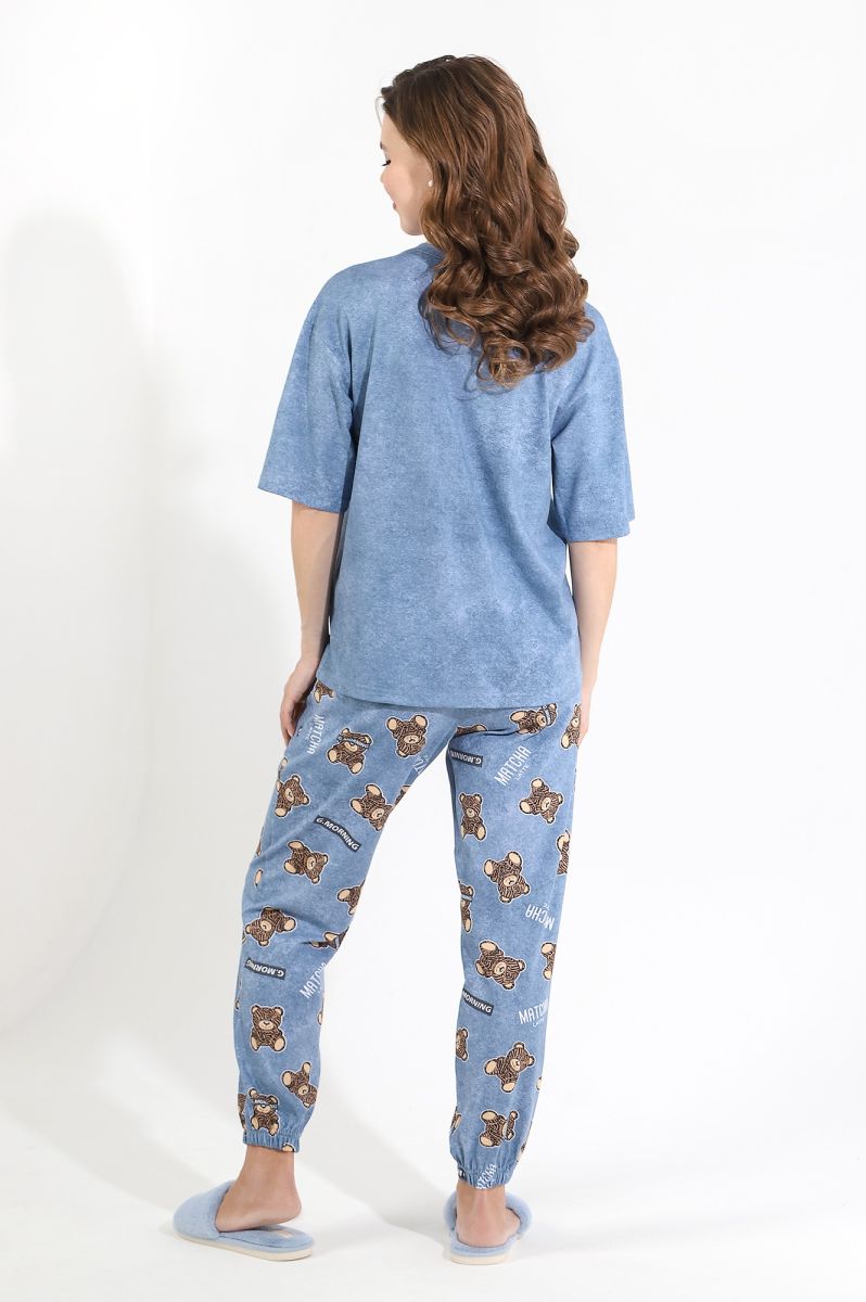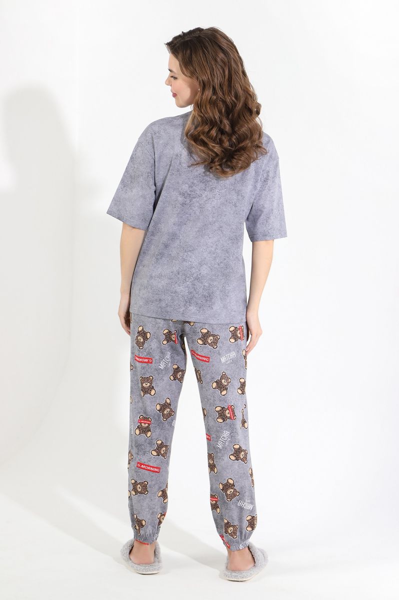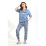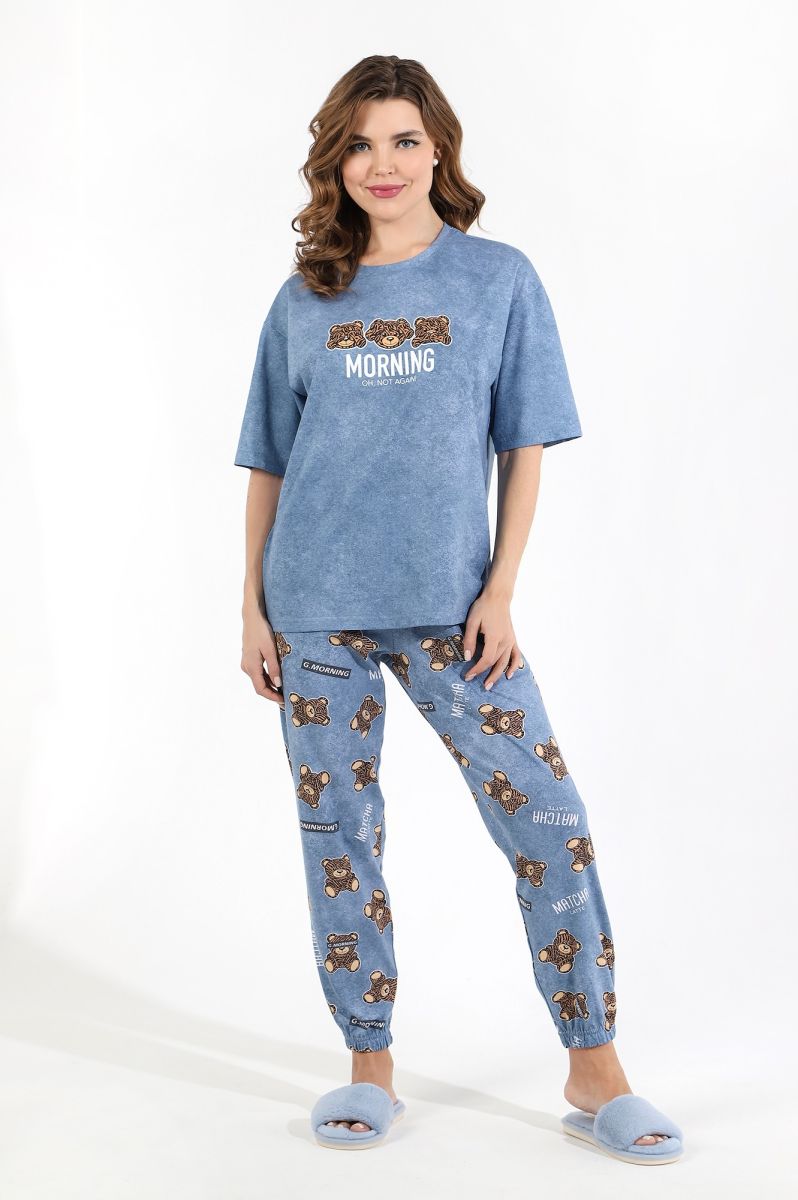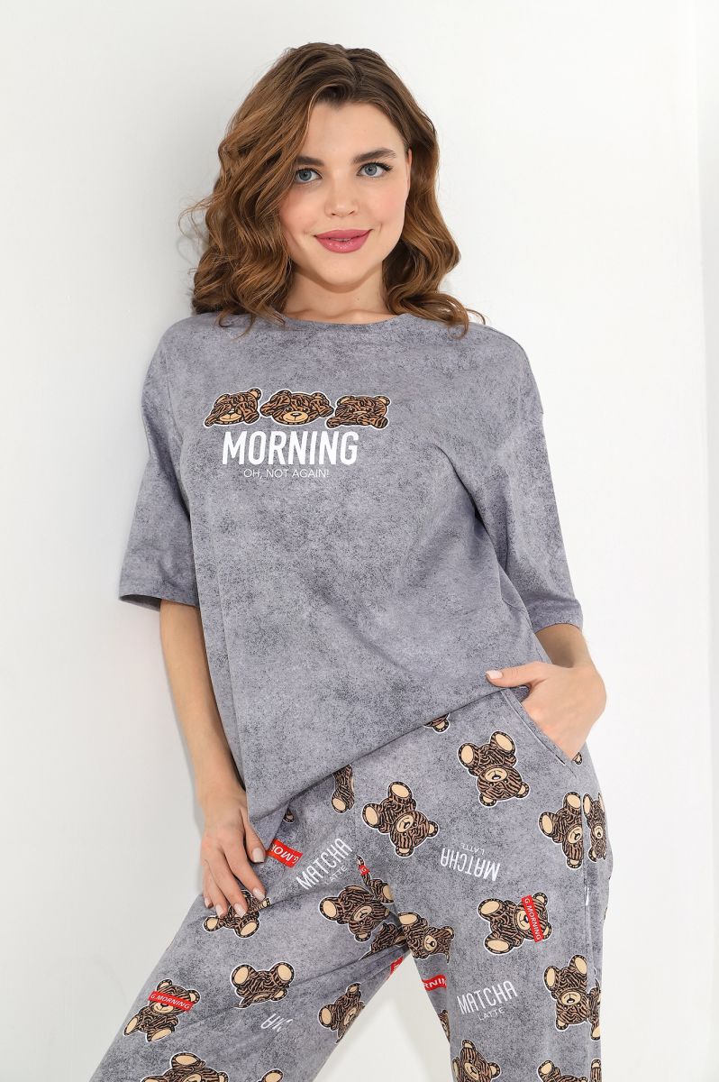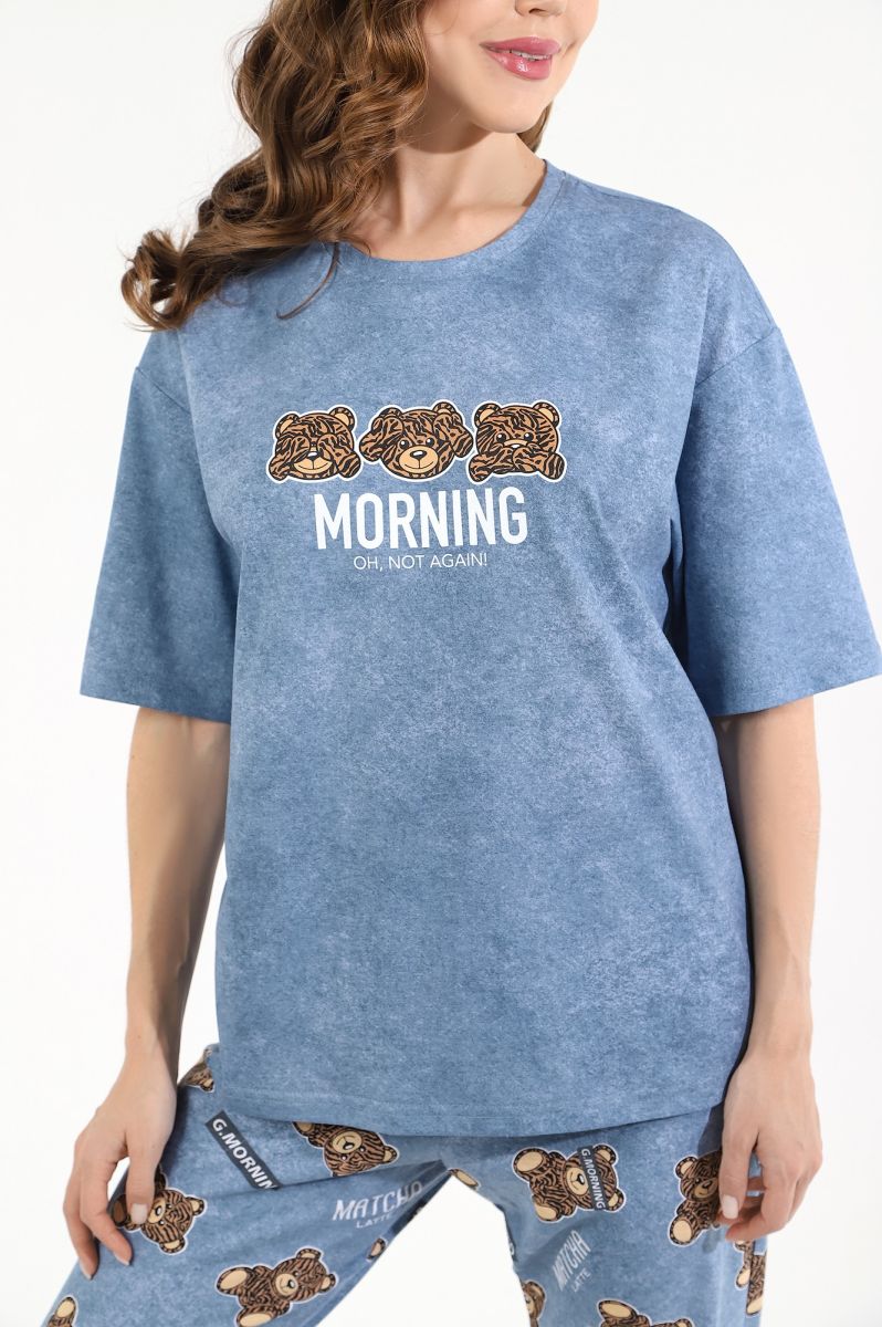 Костюм молодежный из трикотажного полотна «кулирка» в сочетании двух видов: гладкокрашеного с эффектом «варенки» и с набивным рисунком, состоящий из футболки и шорт.