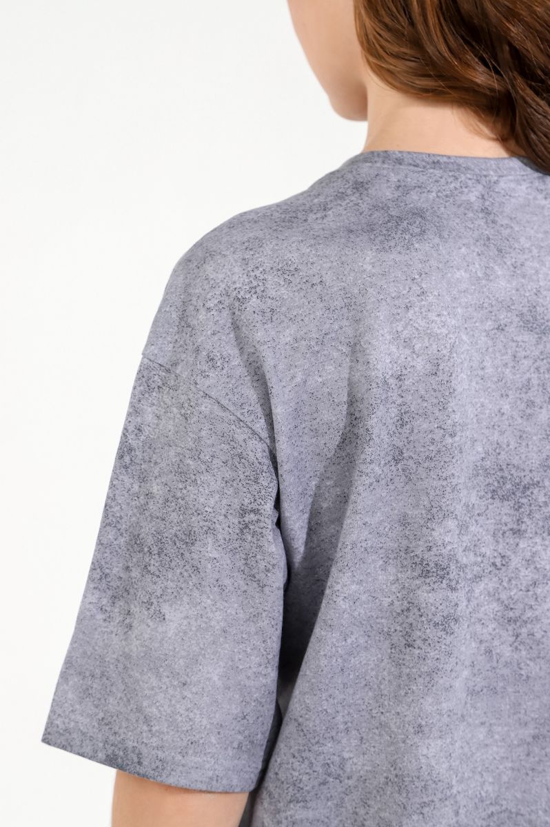 Футболка – с короткими втачными рукавами, свободного покроя, горловиной овальной формы, обработанной притачной бейкой из основного материала и принтом в центре полочки, выполненным в технике «шелкографии».