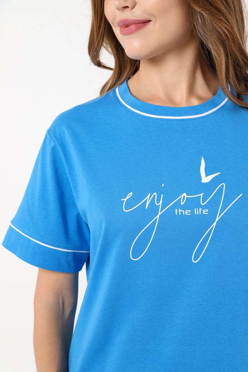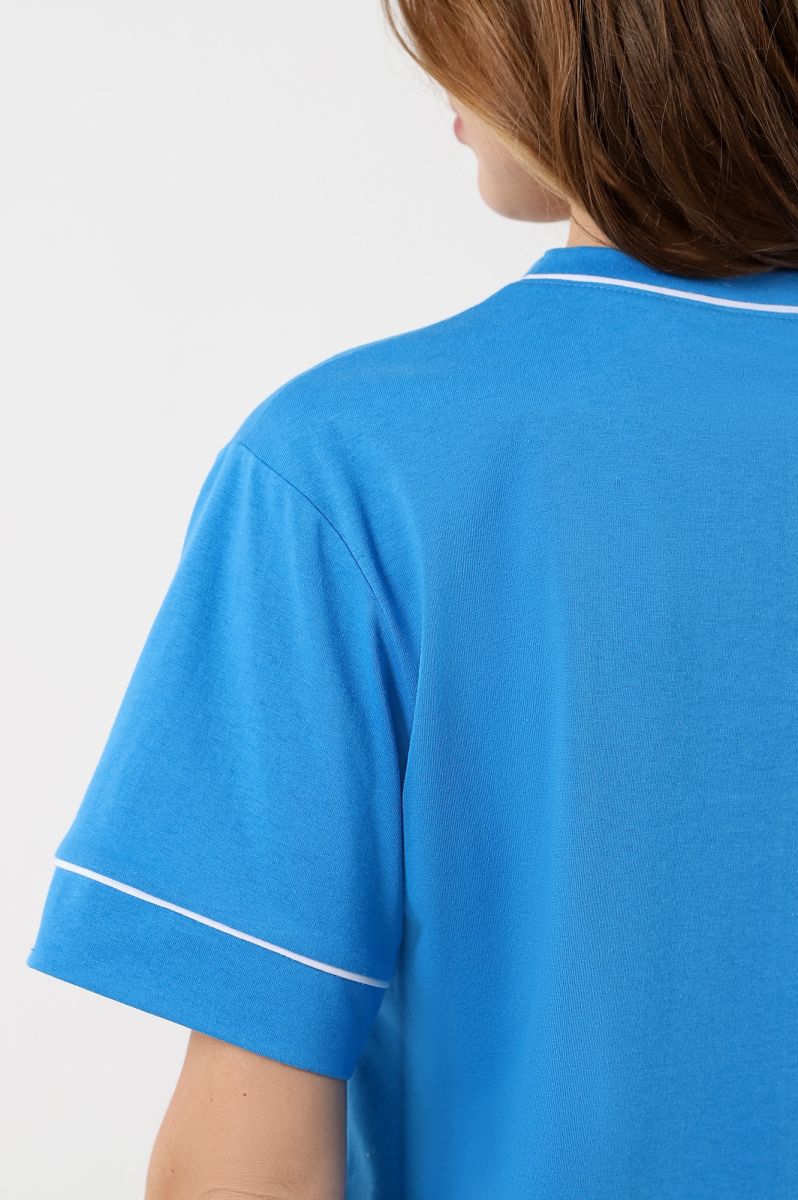 Футболка – из полотна с набивным рисунком, свободного покроя, с короткими втачными рукавами, горловиной овальной формы, обработанной двойной притачной бейкой из контрастного материала. На полочке принт, выполненный в технике «шелкографии», рукава с отделочными манжетами и кантом.