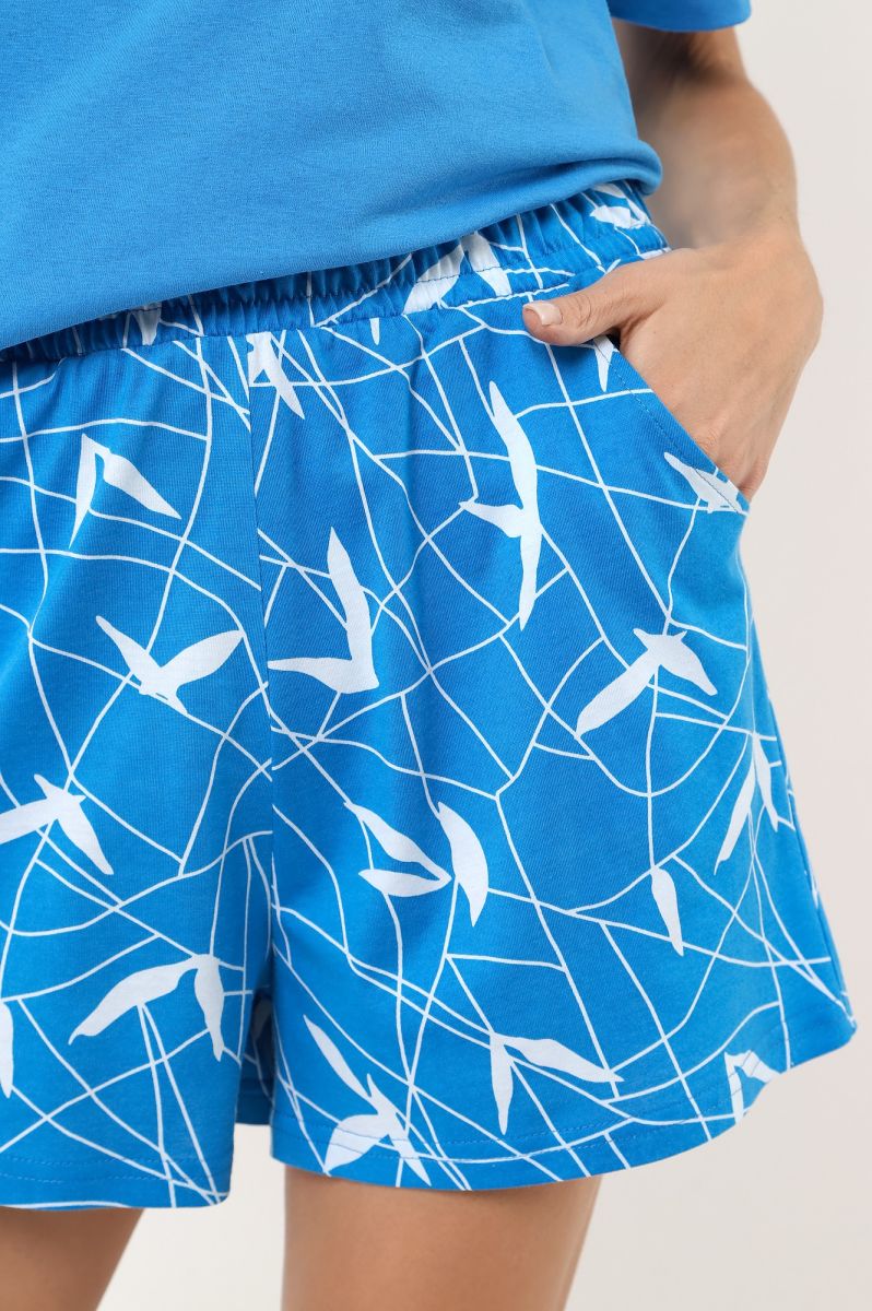 Шорты – из полотна с набивным рисунком, свободные, с карманами в боковых швах, на притачном поясе с эластичной тесьмой внутри.