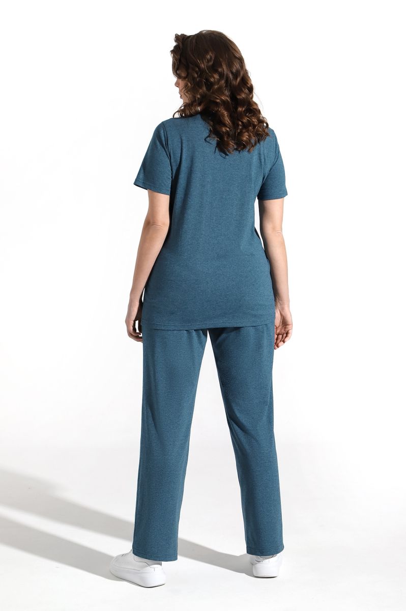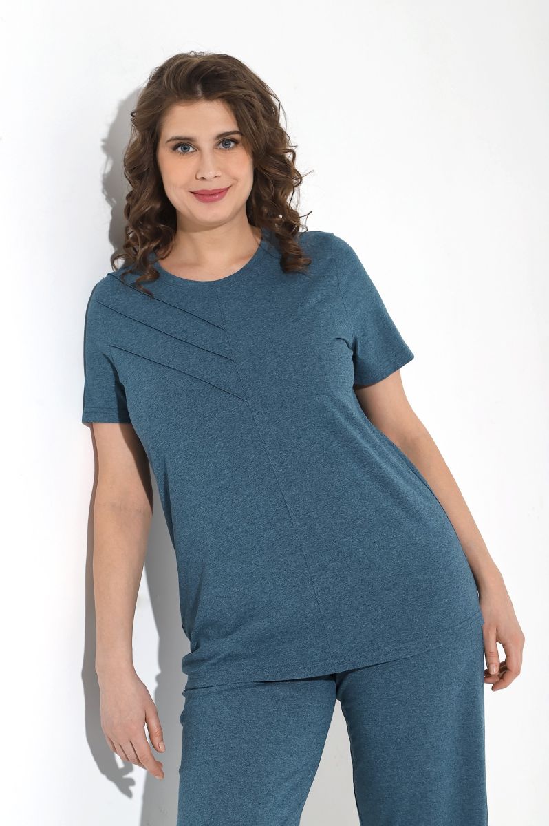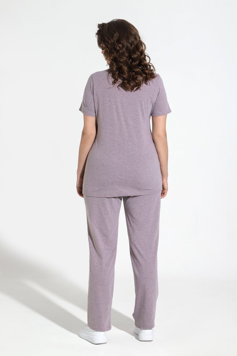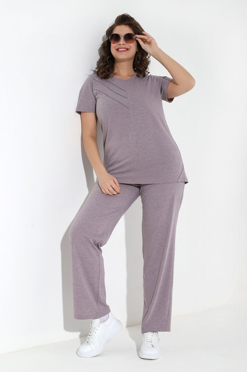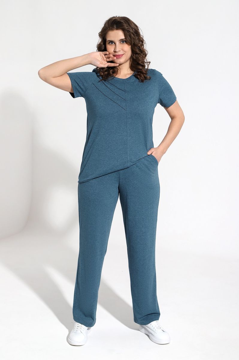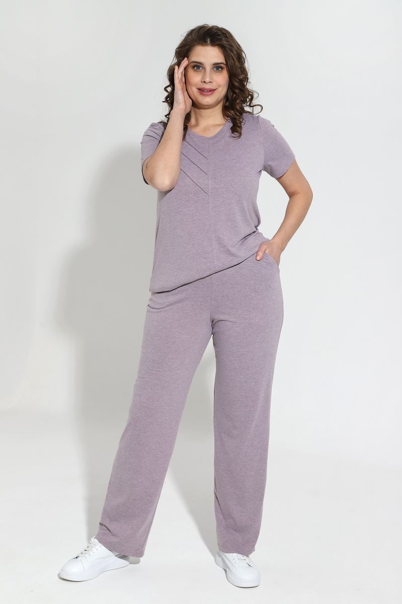 Костюм женский из гладкокрашенного трикотажного меланжированого полотна «кулирка», состоящий из футболки и брюк. Футболка с короткими втачными рукавами, горловиной овальной формы, обработанной притачной бейкой. Деталь переда отрезная по центру, на левой половине по диагонали выполнены отделочные строчки – «защипы».