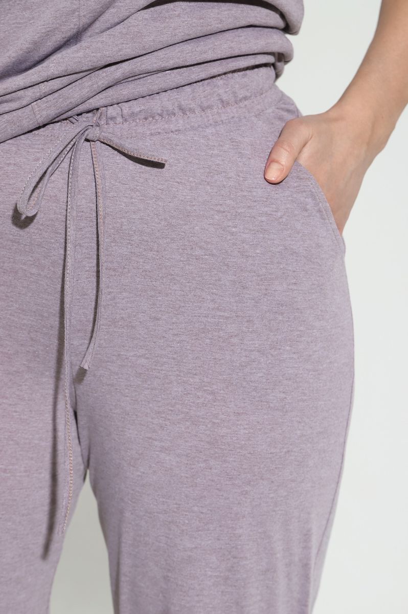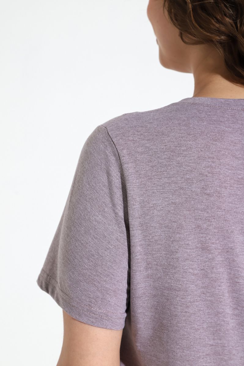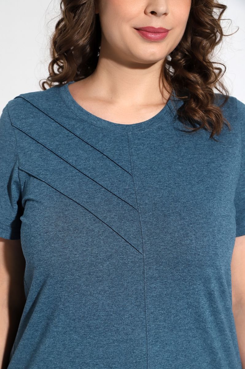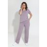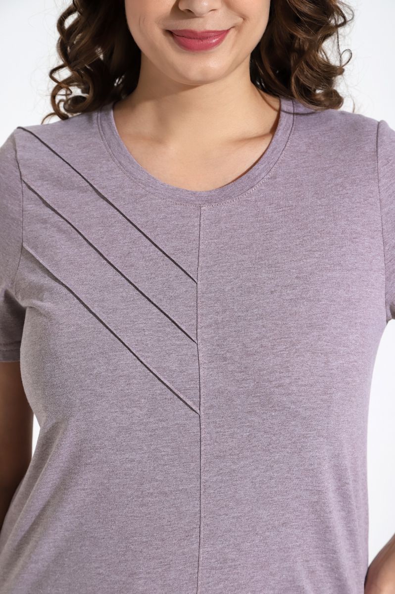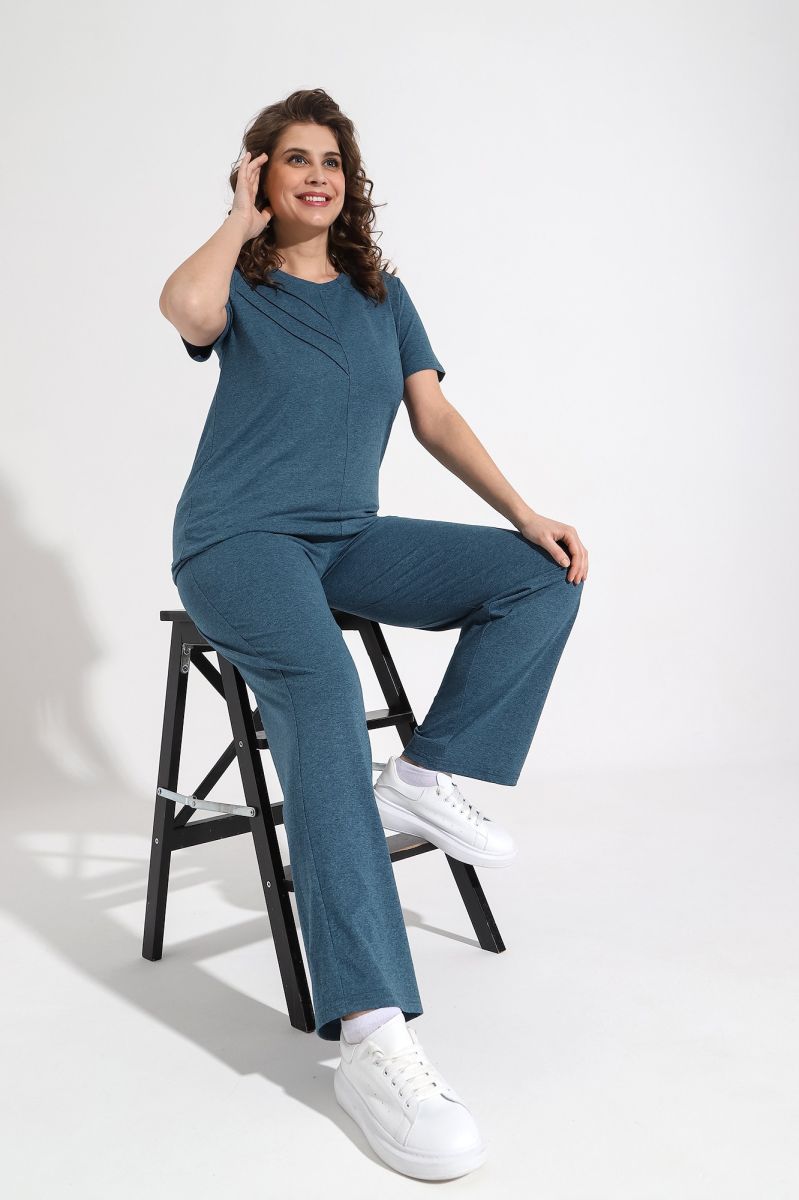 Костюм женский из гладкокрашенного трикотажного меланжированого полотна «кулирка», состоящий из футболки и брюк. Футболка с короткими втачными рукавами, горловиной овальной формы, обработанной притачной бейкой. Деталь переда отрезная по центру, на левой половине по диагонали выполнены отделочные строчки – «защипы».