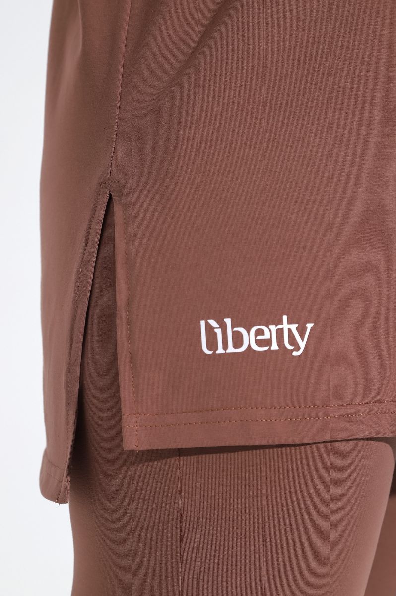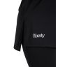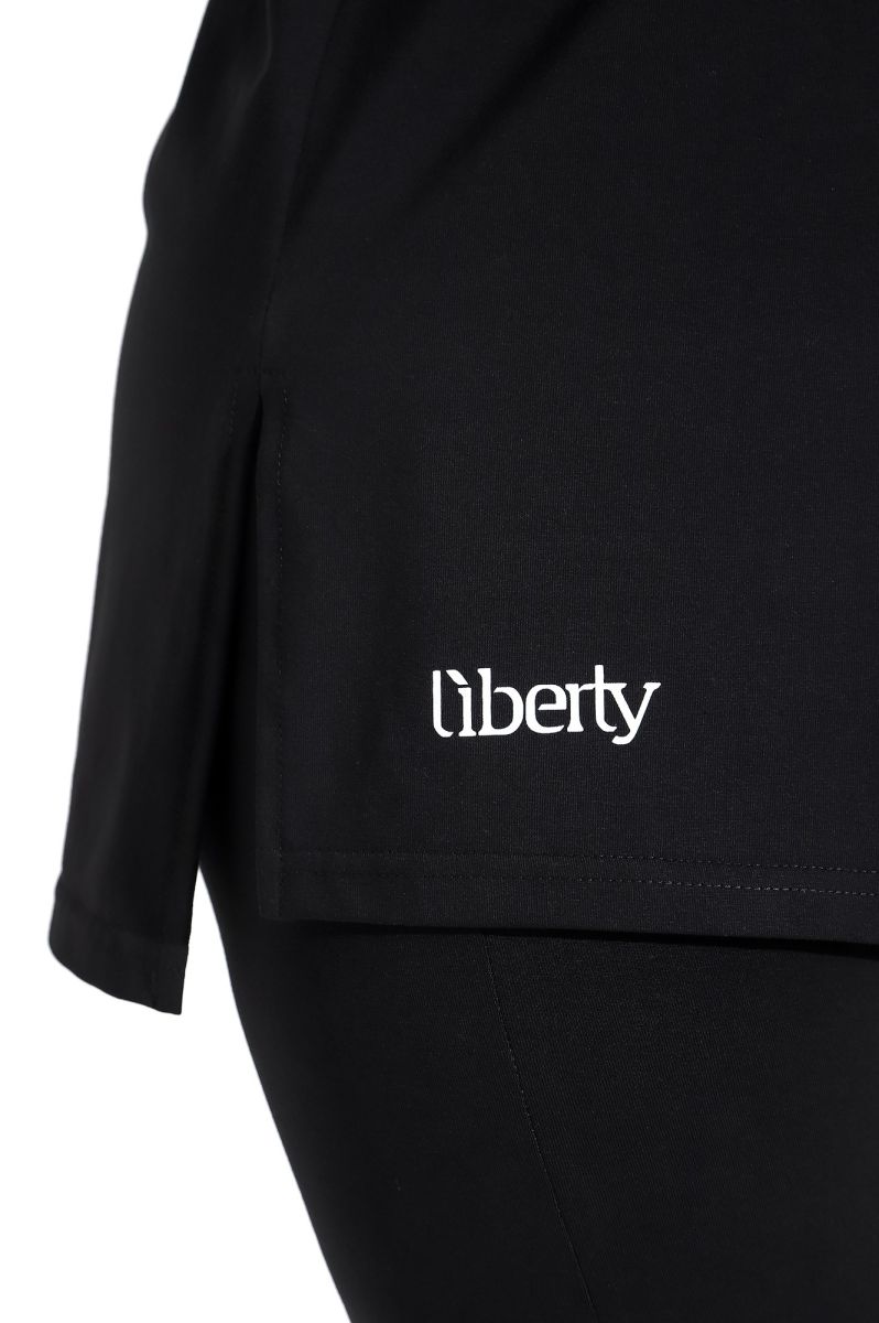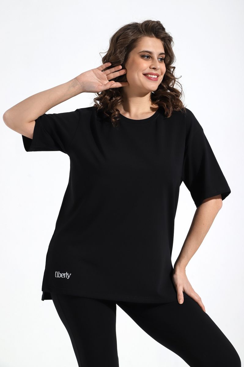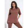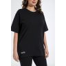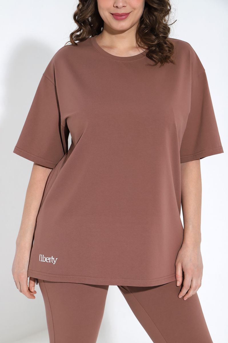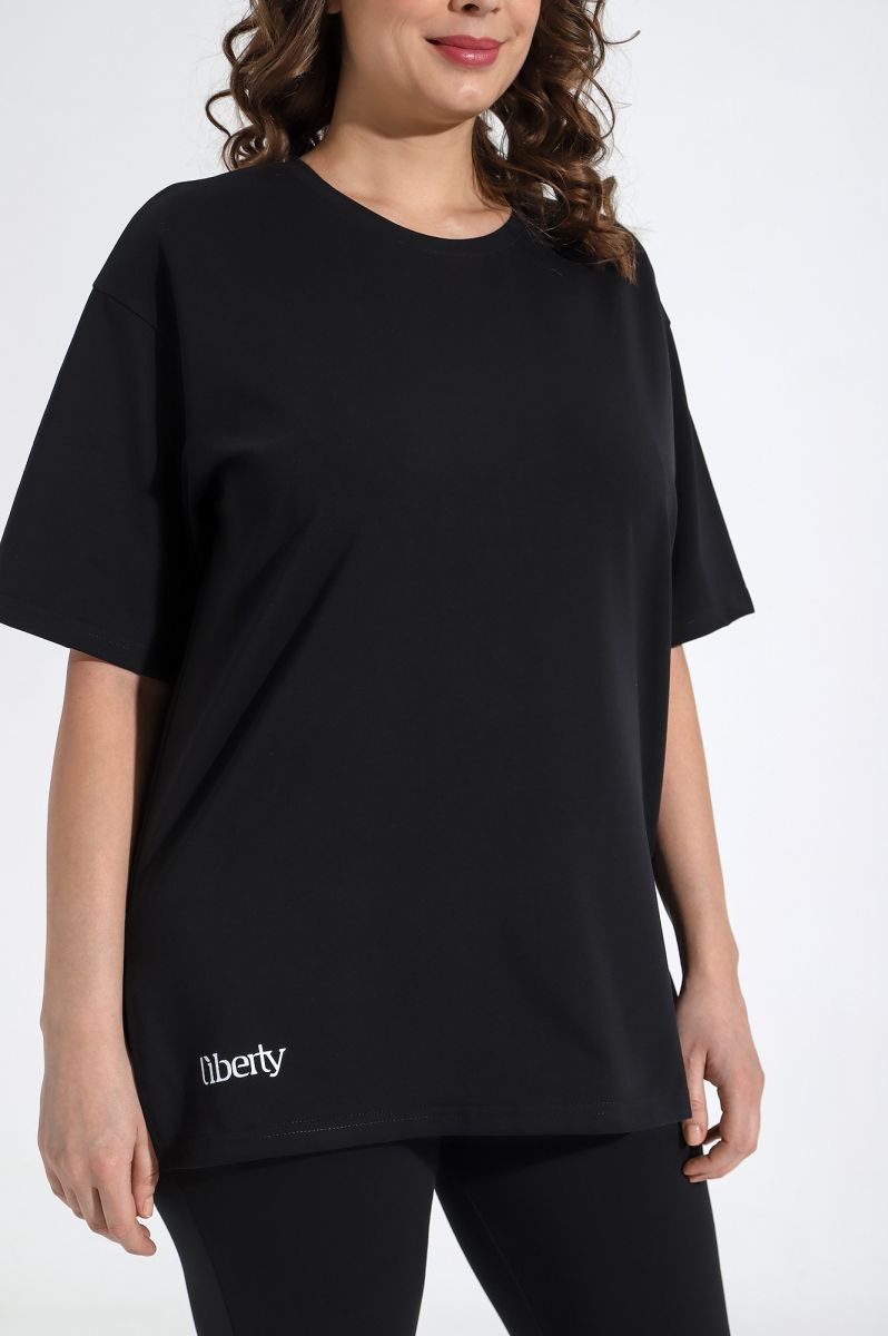Футболка свободного покроя, со спущенным плечом и втачными рукавами длиной до локтя, горловиной овальной формы, обработанной втачной планкой и принтом на полочке, выполненным в технике «шелкографии».