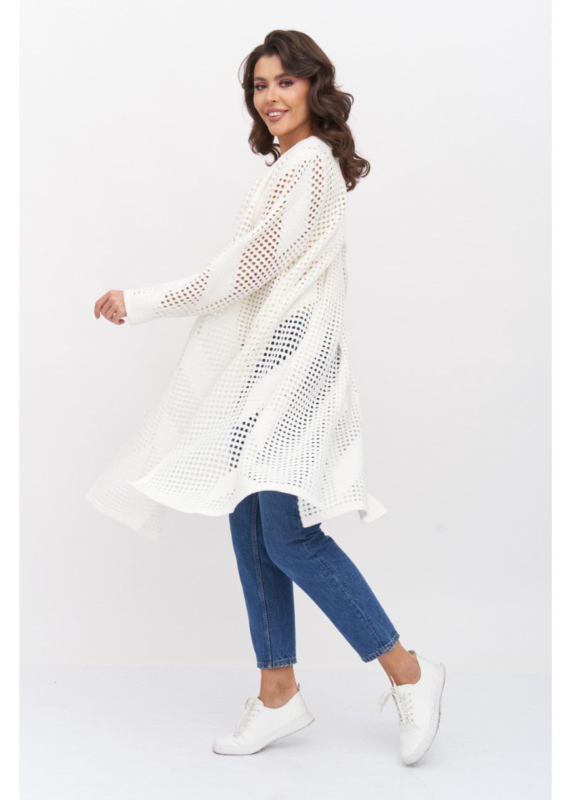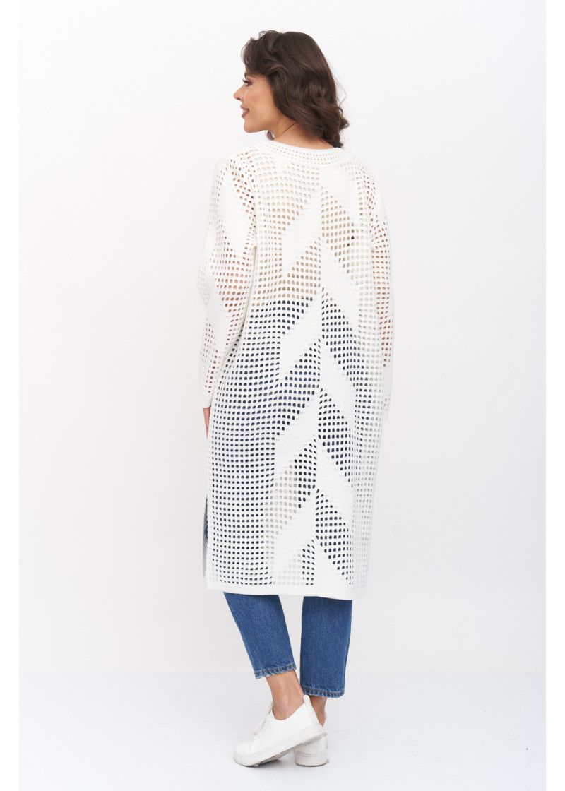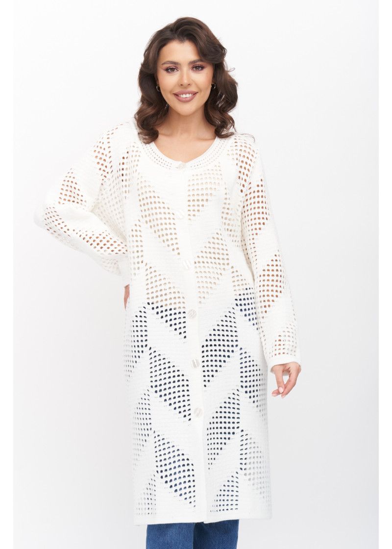 Ажурный кардиган с круглой горловиной. Рукава втачные длинные. Кардиган застегивается по переду на крупные пуговицы.