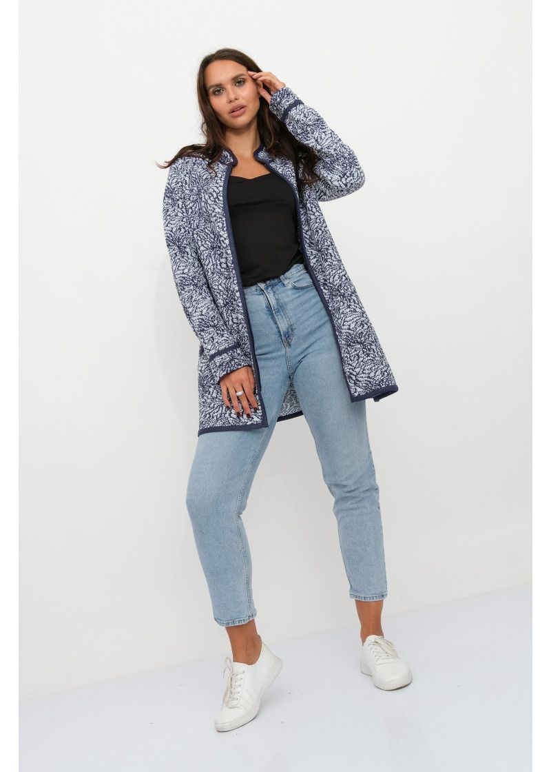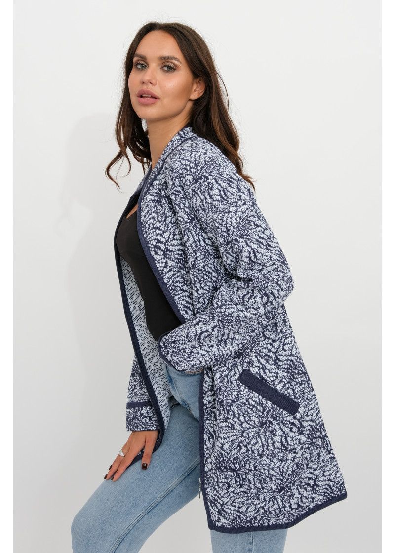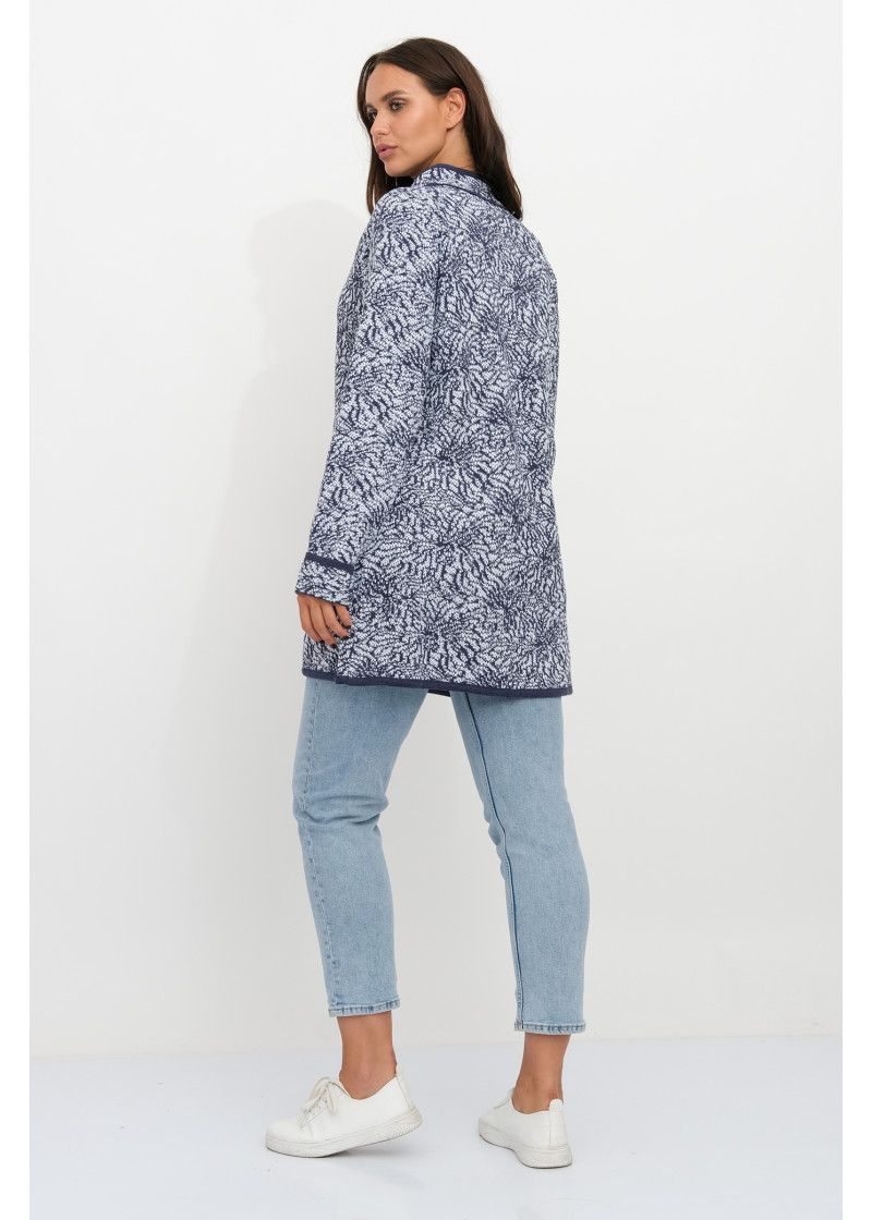 Кардиган прямого силуэта с воротником стойкой, на молнии. Рукава втачные длинные. По бокам два прорезных кармана с листочкой. Кардигант выполнен жаккардовым переплетением. Контур воротника, низ рукавов, вход в карман, низ изделия и планка выполнены контрастной отделкой. Новинка сезона.
