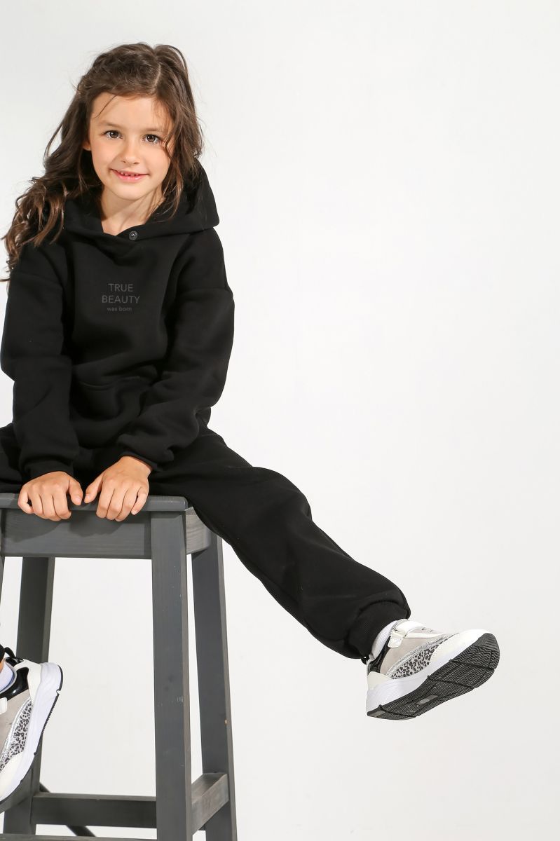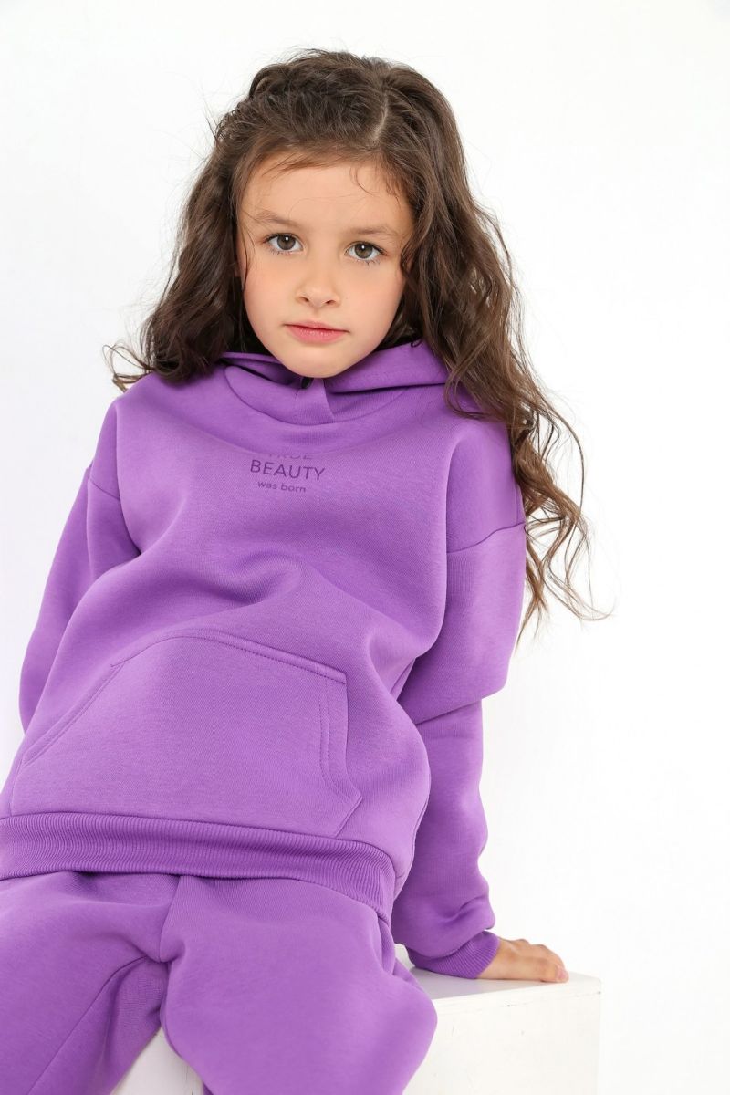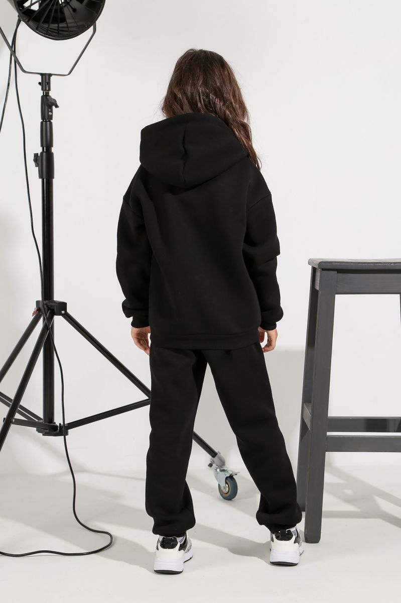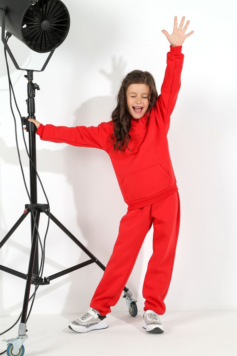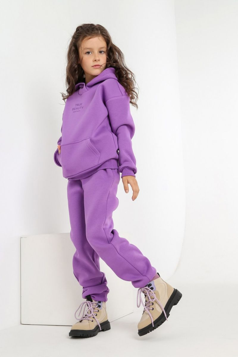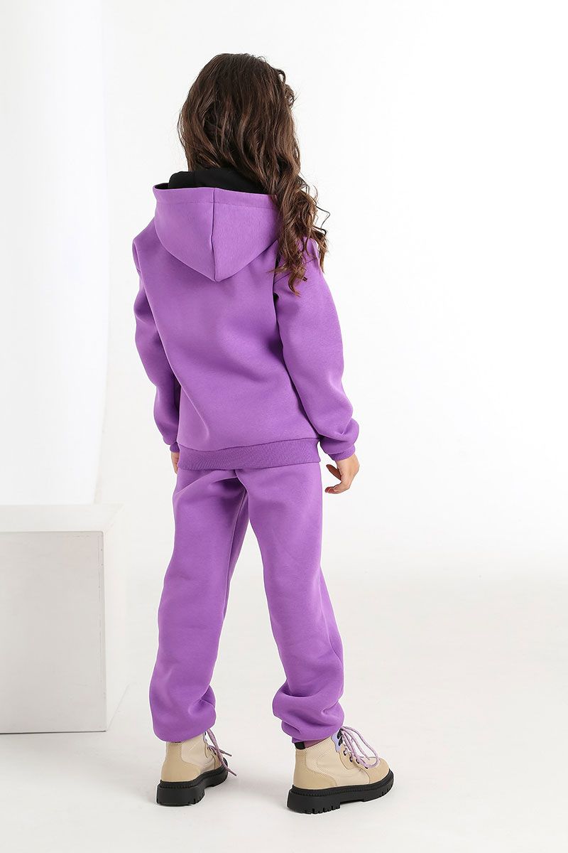 Костюм из футера с начесом для девочки. Джемпер с капюшоном на кнопке, карманом "кенгуру", на поясе из кошкорсе. Брюки на поясе с резинкой. Низ рукавов и низ брюк на манжетах из кошкорсе. Полочка и карман деорированы принтом. В коллекции представлен аналогичный женский костюм!