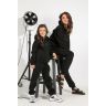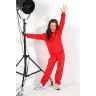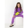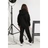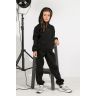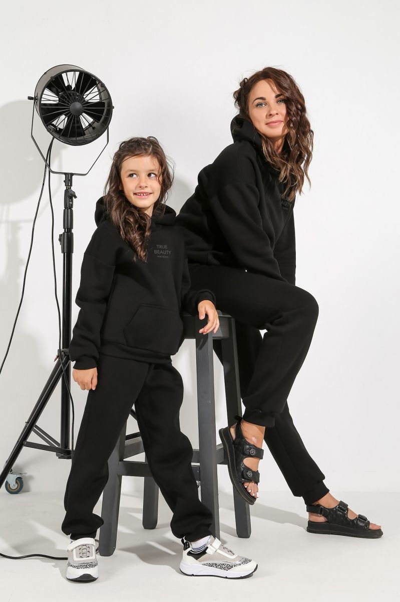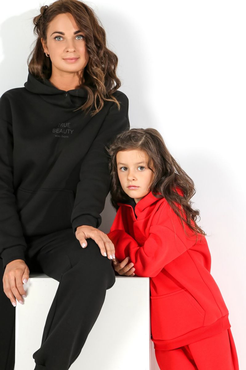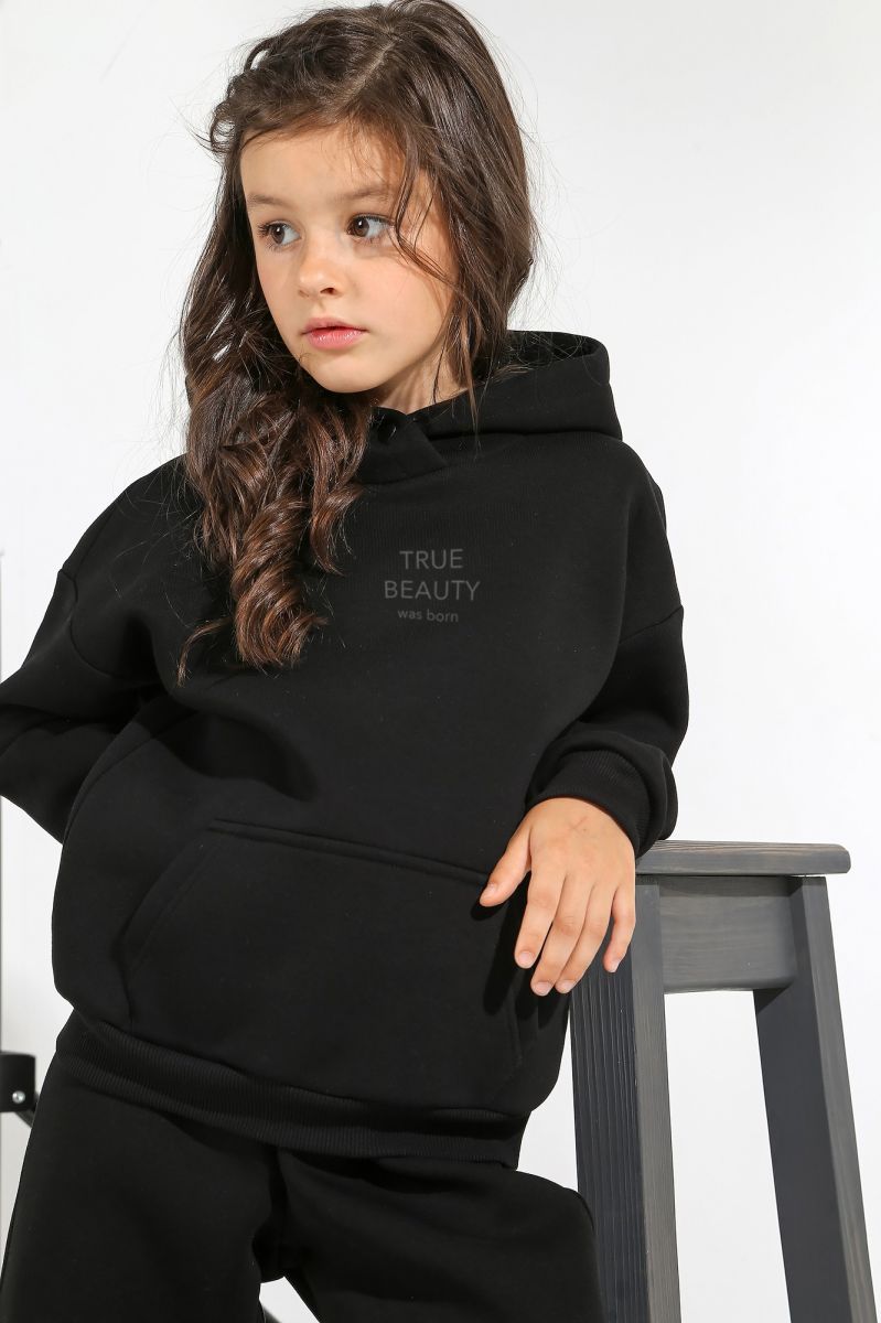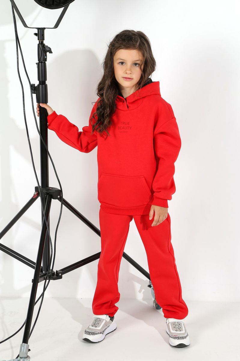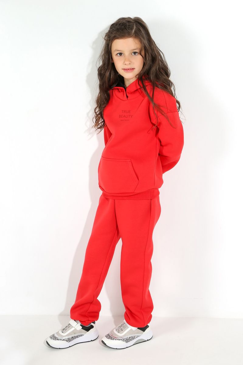 Костюм из футера с начесом для девочки. Джемпер с капюшоном на кнопке, карманом "кенгуру", на поясе из кошкорсе. Брюки на поясе с резинкой. Низ рукавов и низ брюк на манжетах из кошкорсе. Полочка и карман деорированы принтом. В коллекции представлен аналогичный женский костюм!
