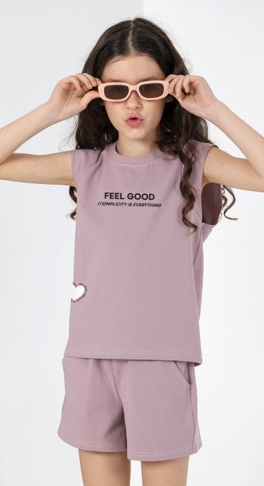 Модный костюм для девочки. Футболка с небольшими рукавами оригинального покроя и актуальным принтом. Шорты с боковыми карманами, на притачном поясе с отстроченной эластичной тесьмой, слега расширенные книзу.