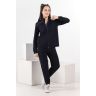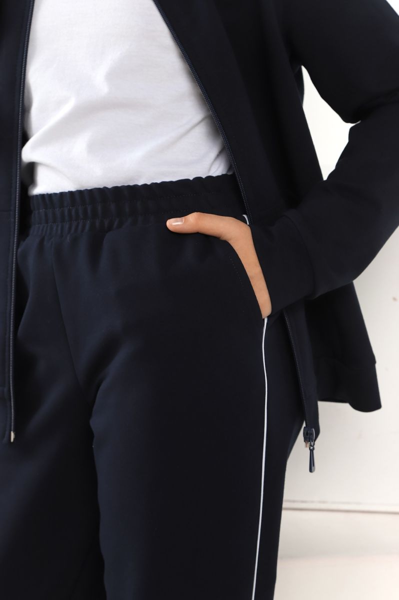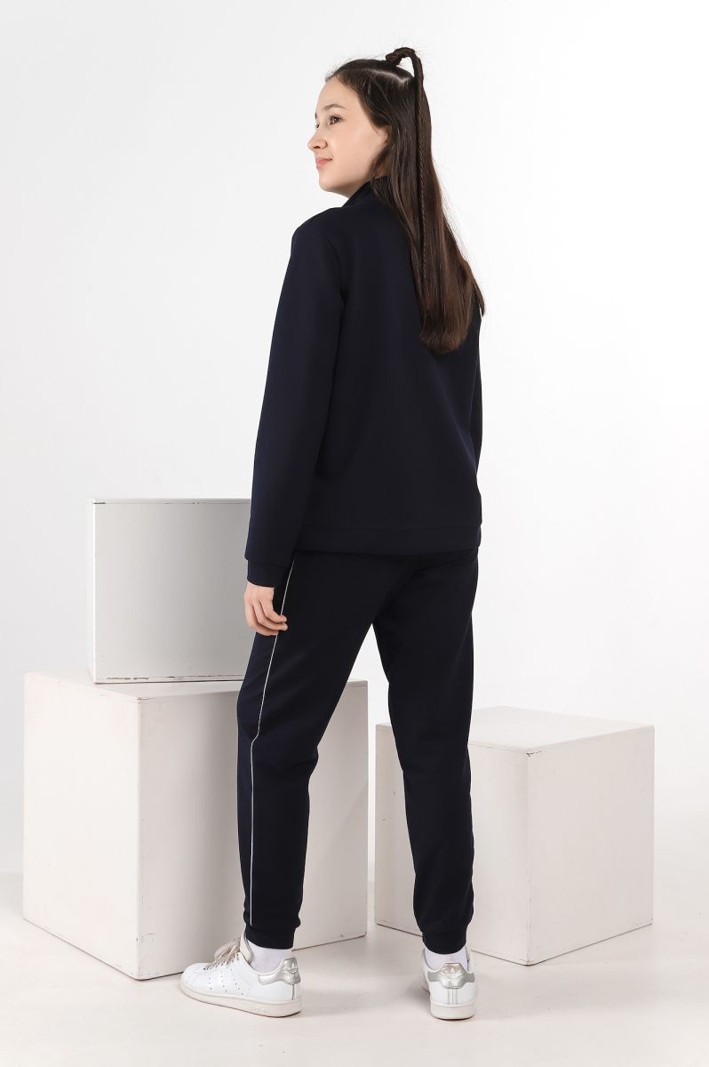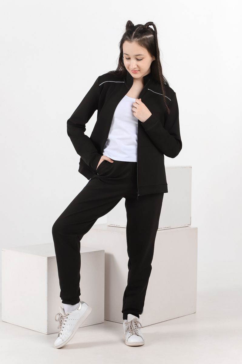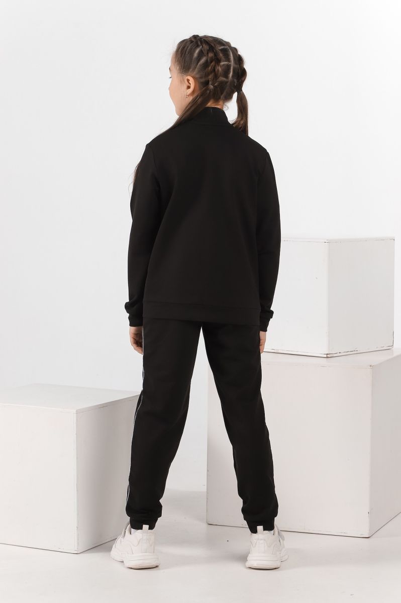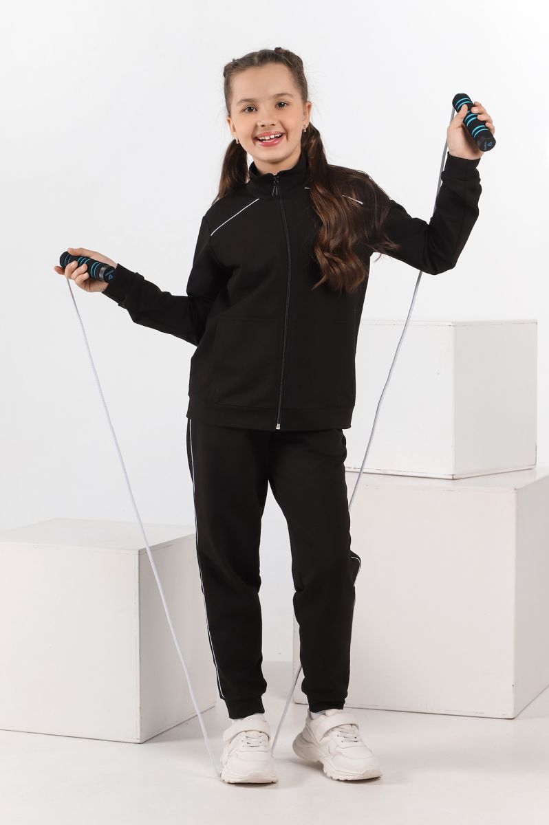 Костюм из футера с лайкрой для девочки. Джемпер с кокеткой с кантом, рукавами на манжетах, карманом "кенгуру". Брюки с карманами, кантом по боку, на притачном поясе с отстроченной эластичной тесьмой и внутренним шнуром для регулировки плотности посадки на талии.