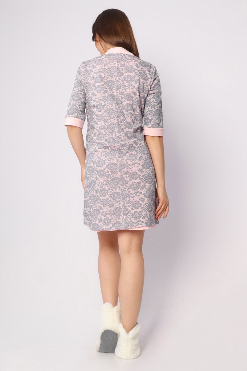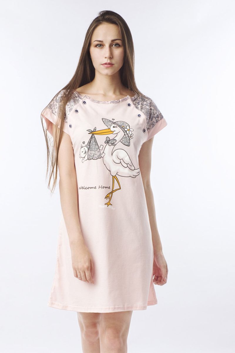 Уютный комплект Аист понравится не только молодым девушкам, но и новоиспеченным мамам. Материал – кулирка. В комплект входят : платье и халат с поясом. Легкое платье выполнено из приятного материала. Крой свободный. Рукава не облегают руку. Передняя часть украшена изображением аиста с кулечком. Сверху платья накидывается легкий халатик из такого же материала. Рукав ниже локтя. Накидка фиксируется пояском. Удобная модель для отдыха после работы или просмотра любимых сериалов.