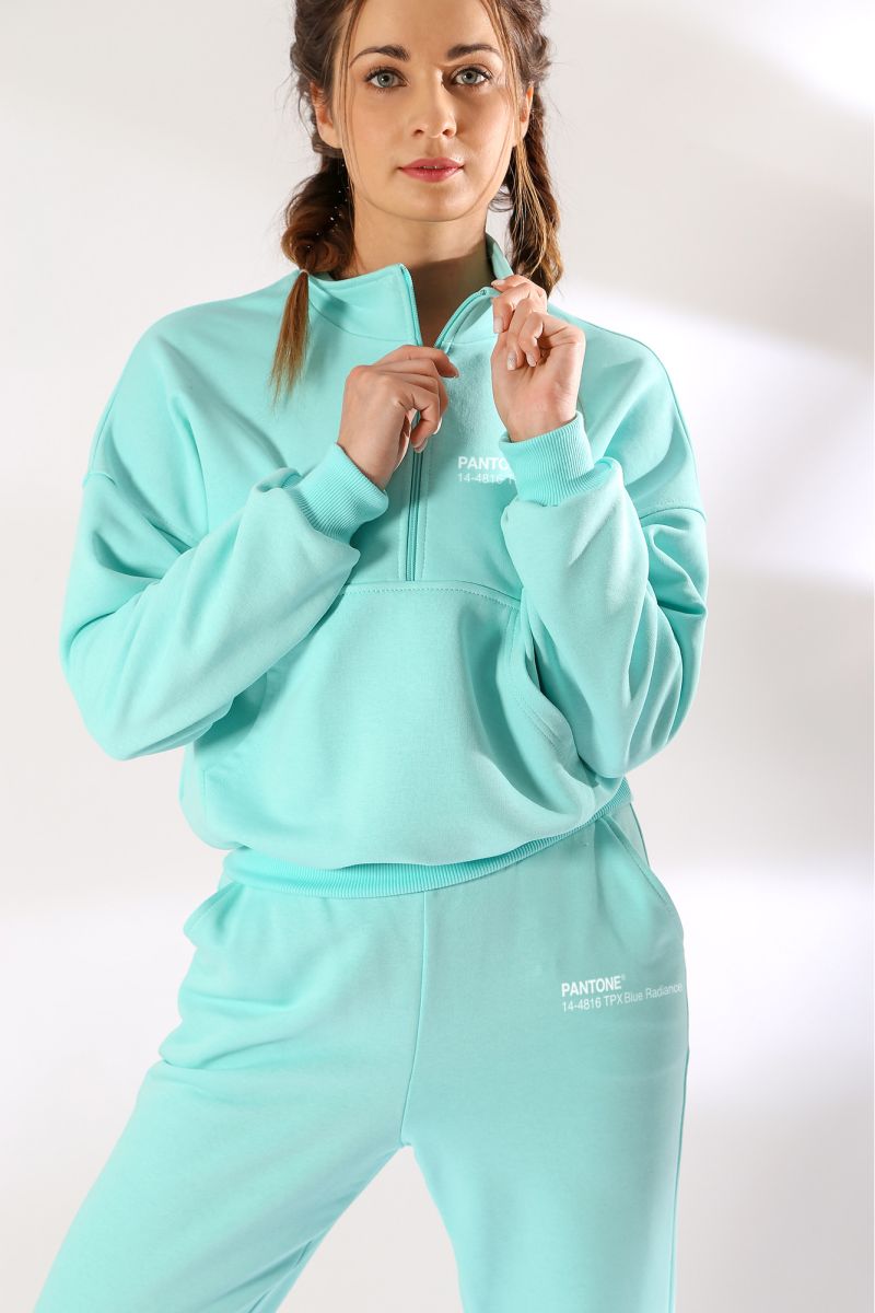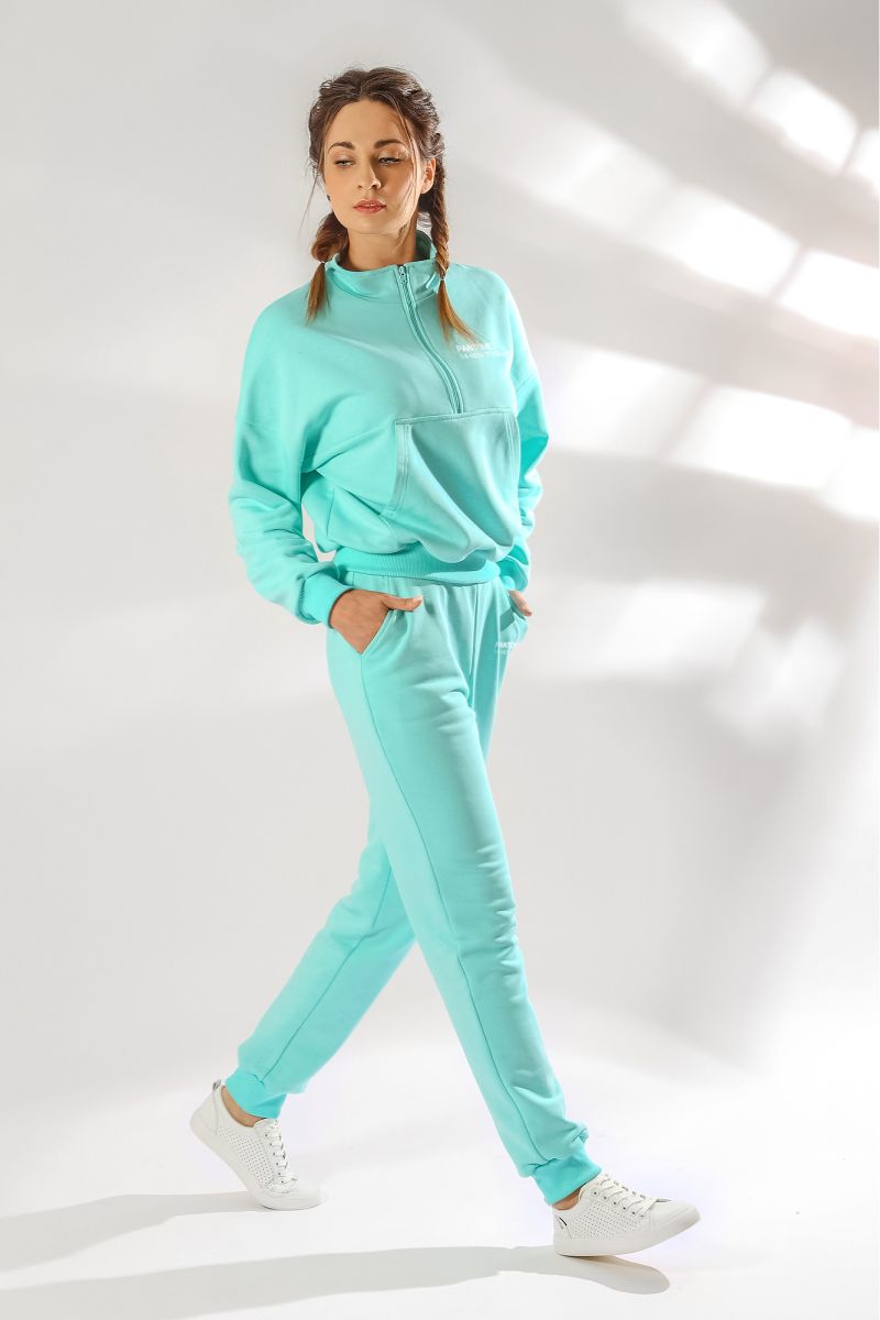 Джемпер с застёжкой "молнией" в верхней части, с воротником стойкой, карманом "кенгуру", лаконичным принтом. Брюки с боковыми карманами, на притачном поясе с эластичной тесьмой.