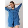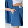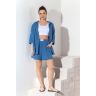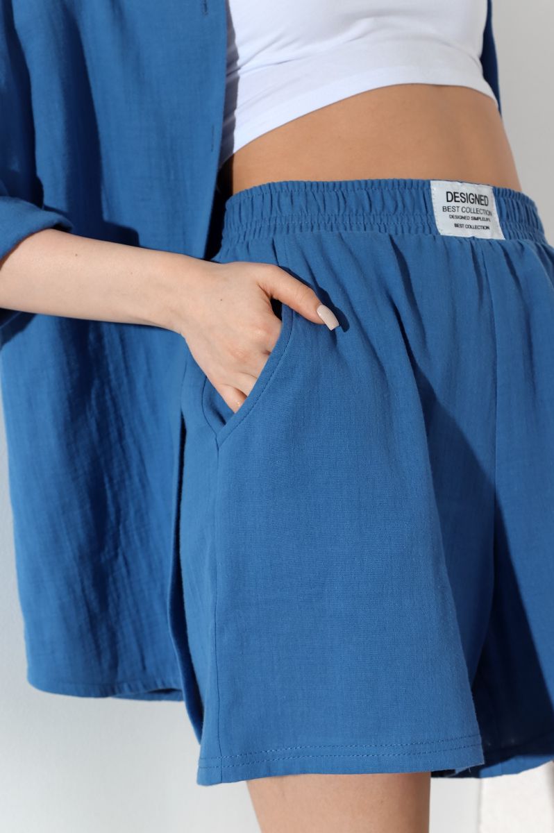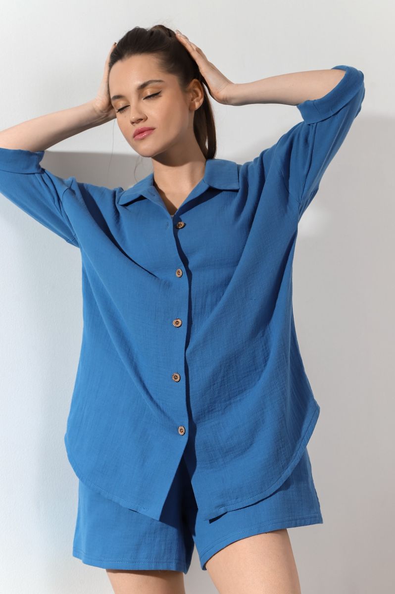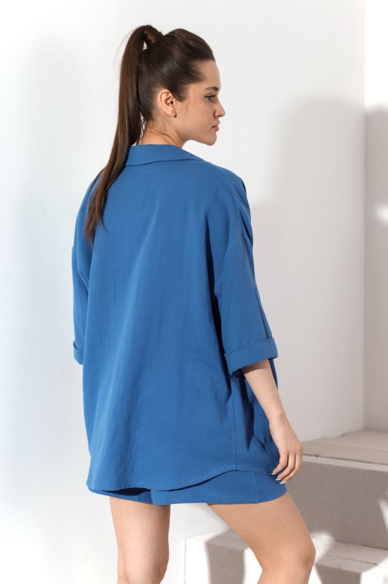 Костюм женский из МУСЛИНА, свободный, состоящий из сорочки и шорт. Сорочка со спущенной линией плеч, с отложным воротником, застежкой на пуговицы, фигурной линией низа, рукавами средней длины, закрывающими локти. Шорты с боковыми карманами, на притачном поясе с нашивкой и отстроченной эластичной тесьмой.