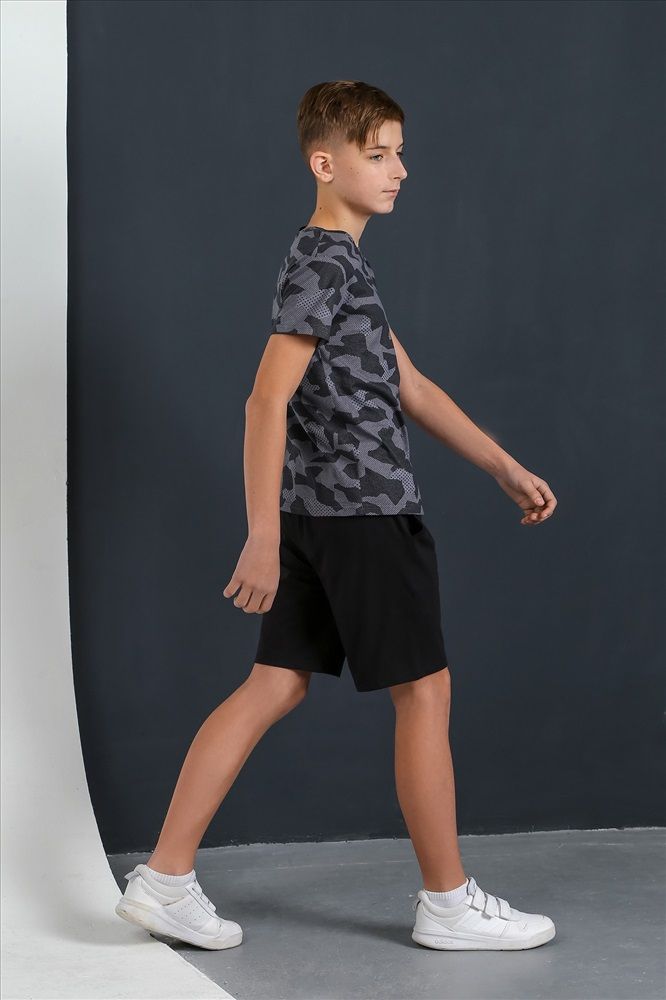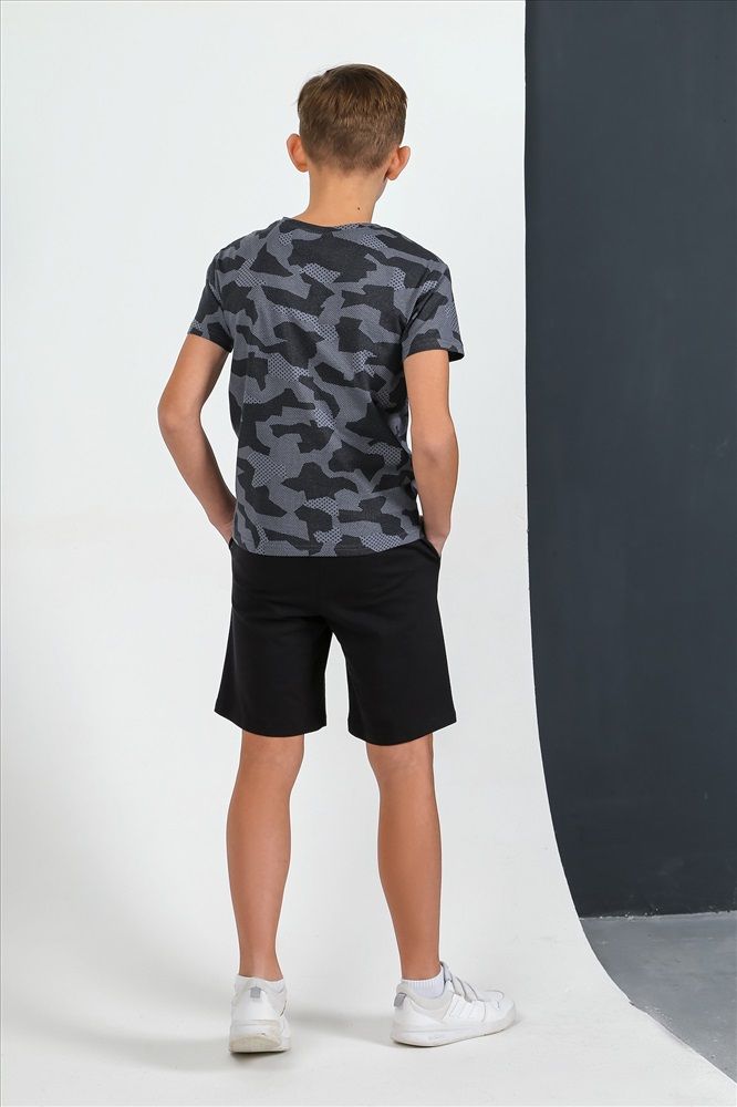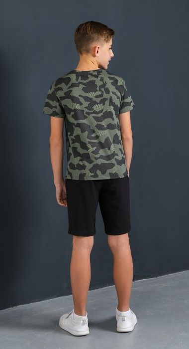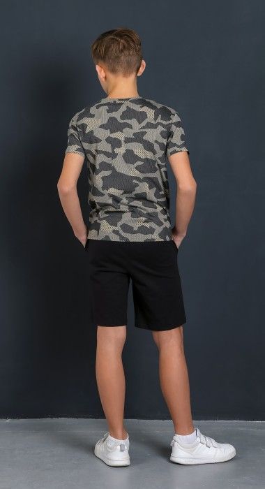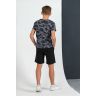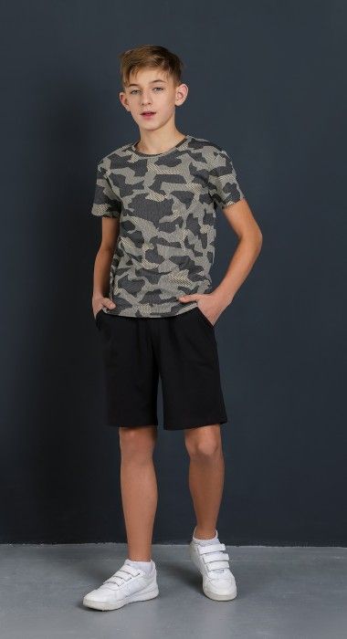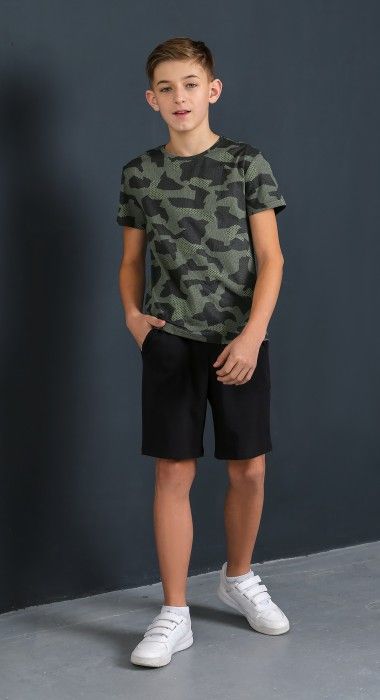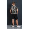 Костюм для мальчика, состоящий из футболки и шорт. Футболка из х/б полотна с набивным рисунком эксклюзивного дизайна. Шорты однотонные с боковыми карманами, на притачном поясе с отстроченной эластичной тесьмой и с внутрнним шнуром.