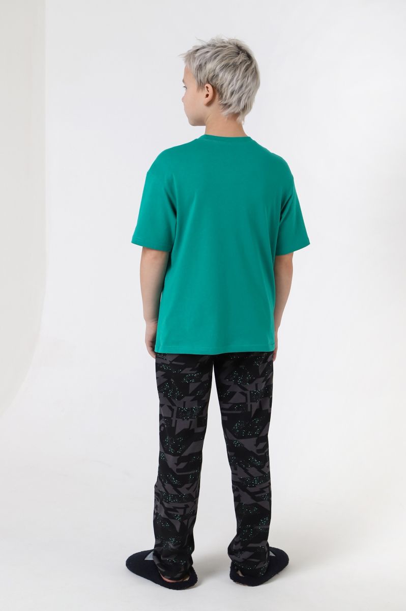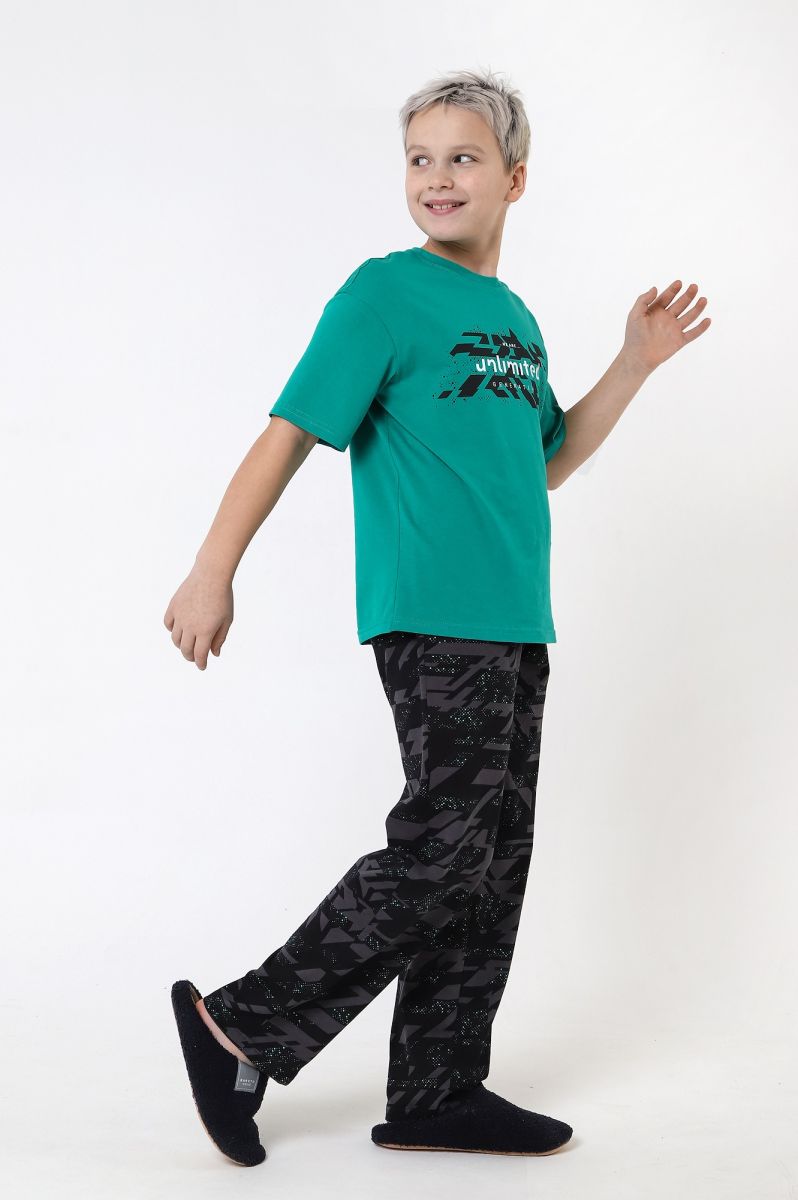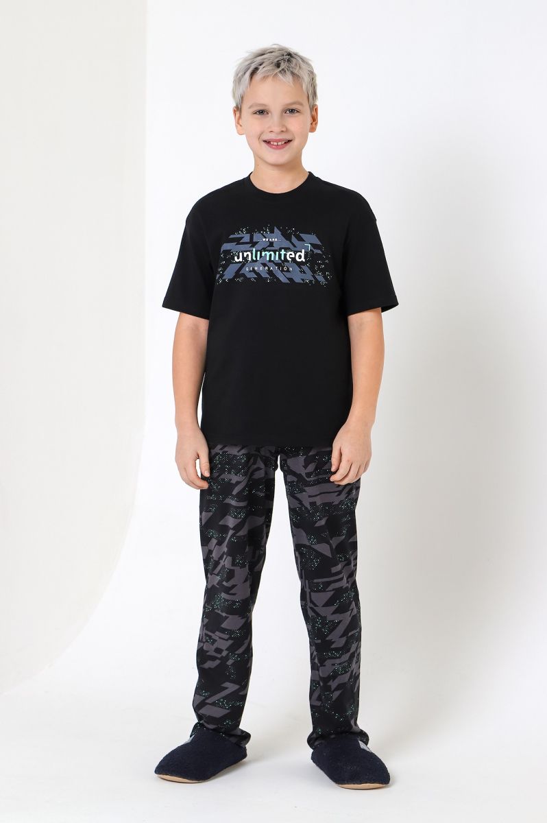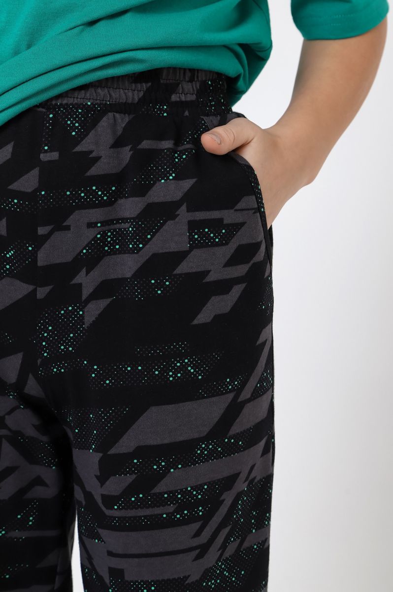 Нижние срезы рукавов и изделия обработаны швом вподгибку. Брюки - из полотна с набивным рисунком, длинные, на притачном поясе с эластичной тесьмой внутри и карманами в боковых швах с окантованными срезами Нижние срезы обработаны швом вподгибку.