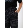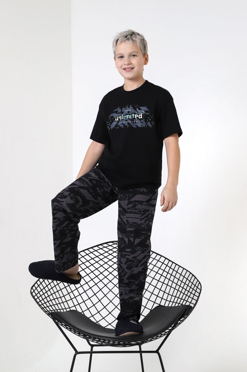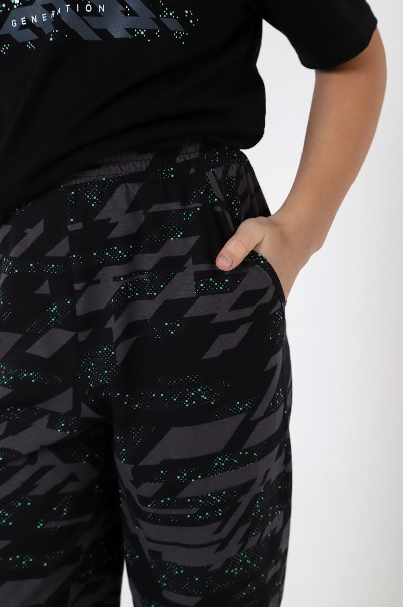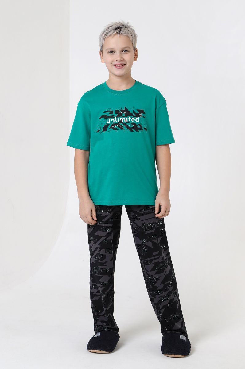 Нижние срезы рукавов и изделия обработаны швом вподгибку. Брюки - из полотна с набивным рисунком, длинные, на притачном поясе с эластичной тесьмой внутри и карманами в боковых швах с окантованными срезами Нижние срезы обработаны швом вподгибку.