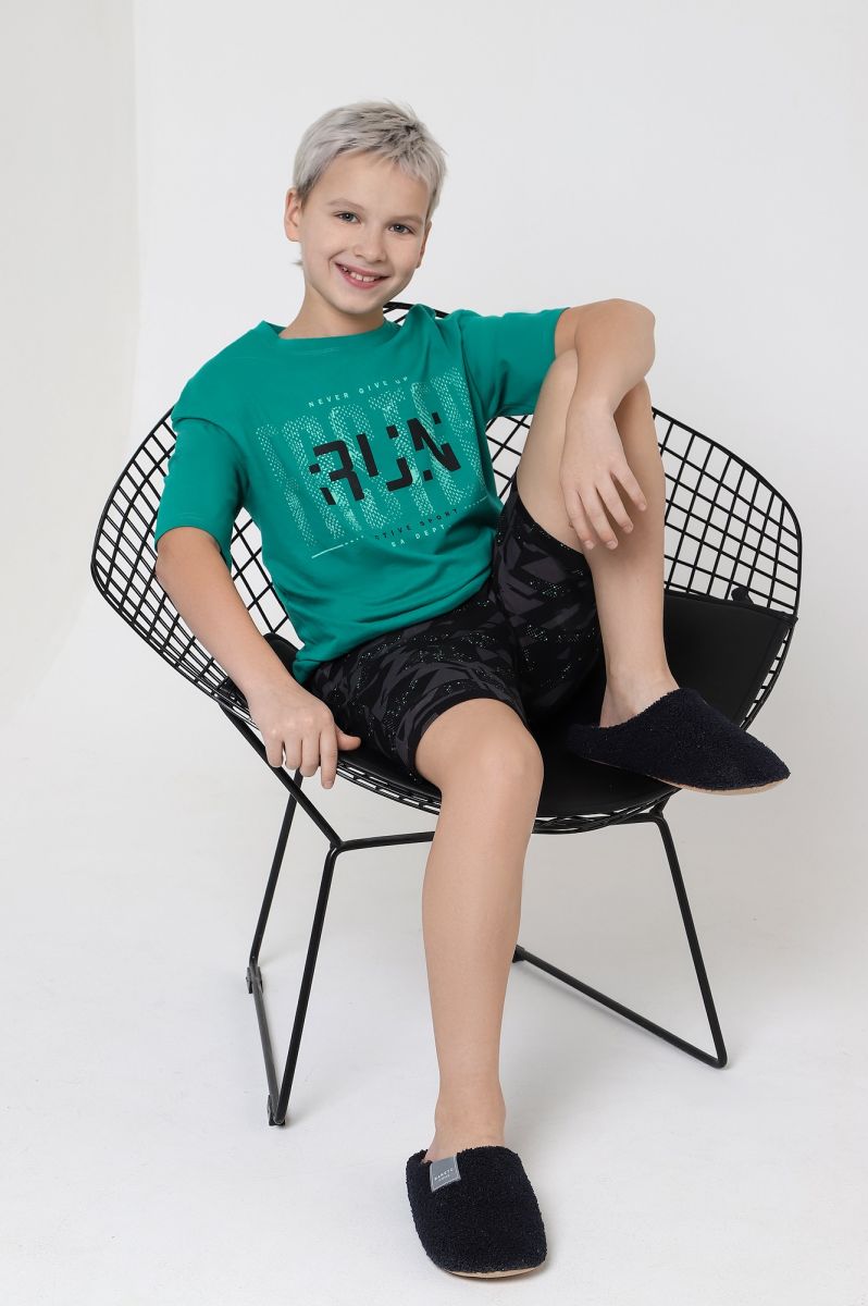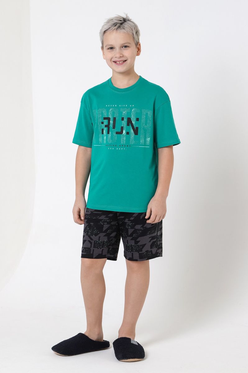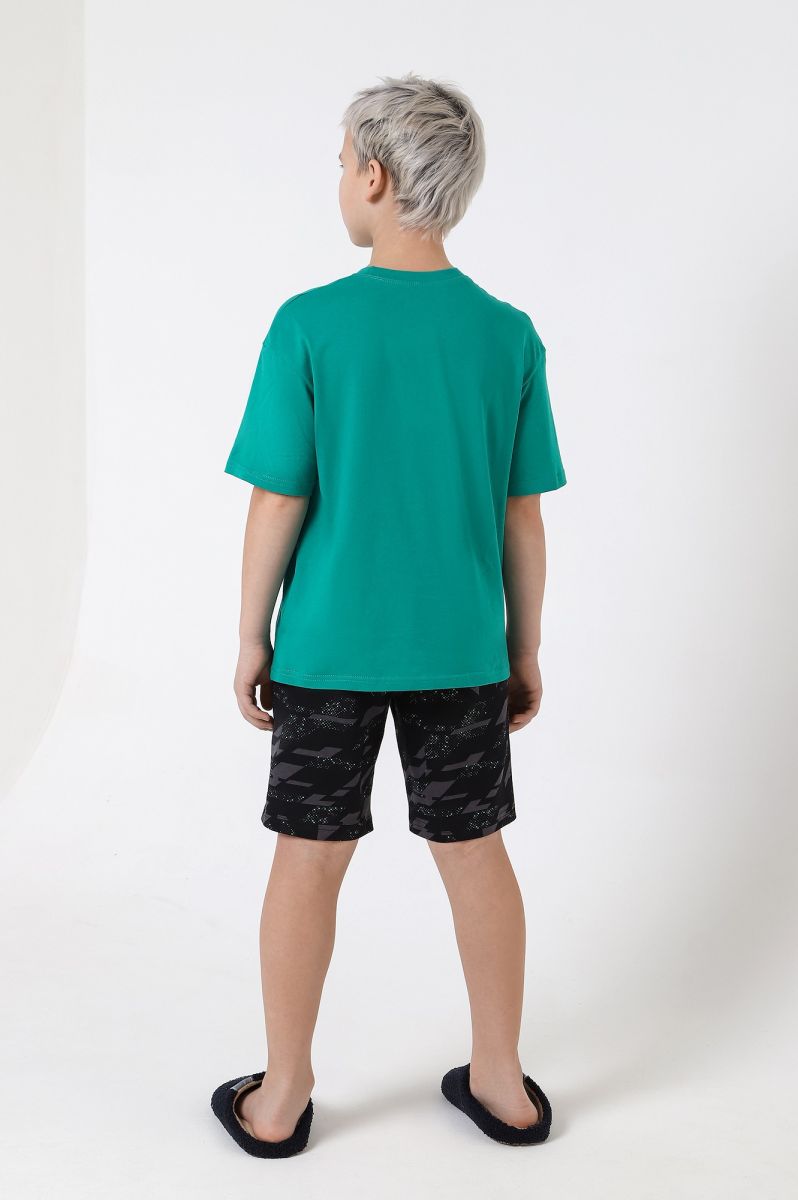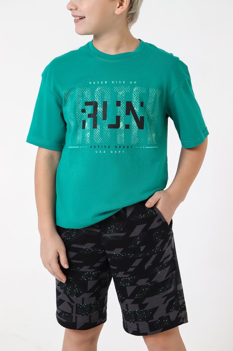 Костюм для мальчика, состоящий из футболки и шорт.Футболка - из гладкокрашеного полотна с принтом на детали переда, классического покроя, с короткими втачныыми рукавами, удлиненными плечевыми швами и горловиной овальной формы, обработанной втачной планкой. По шву втачивания планки в горловину настрочена отделочная строчка. Нижние срезы рукавов и изделия обработаны швом вподгибку.Шорты - из полотна с набивным рисунком,средней длины , на притачном поясе с эластичной тесьмой внутри и карманами в боковых швах с окантованными срезами Нижние срезы обработаны швом вподгибку.