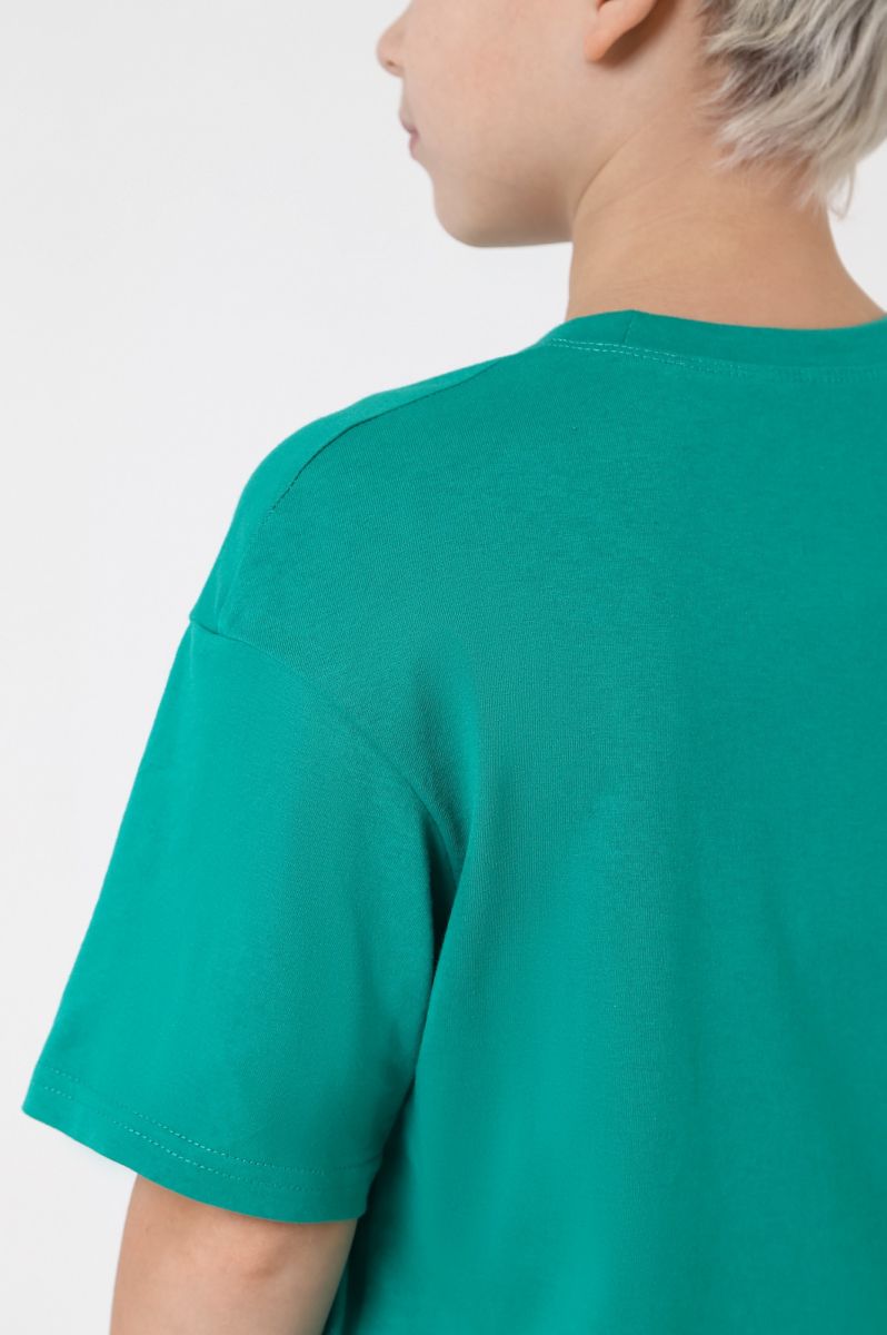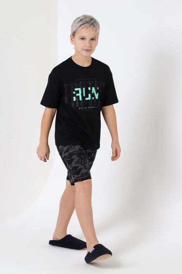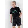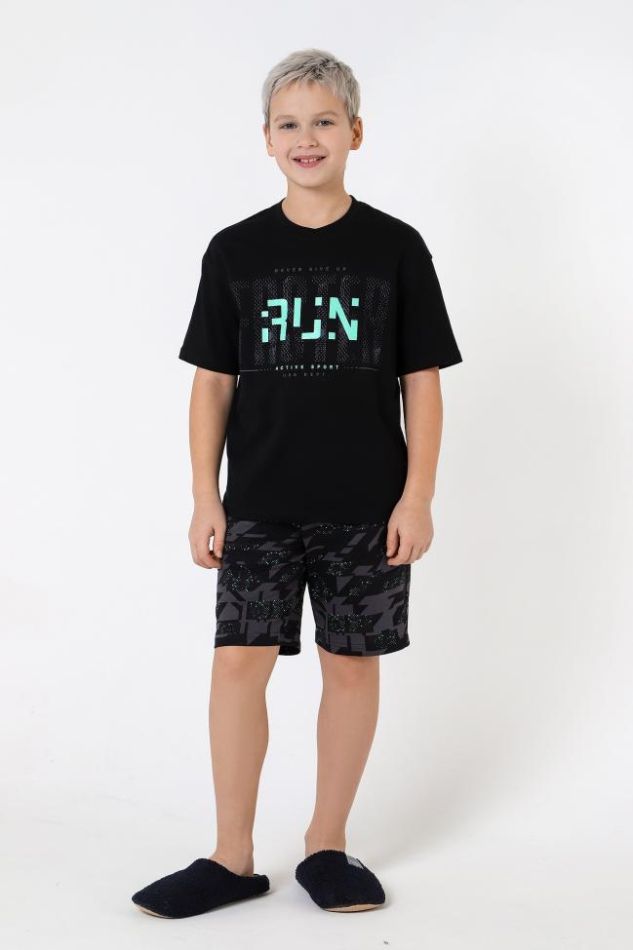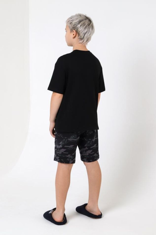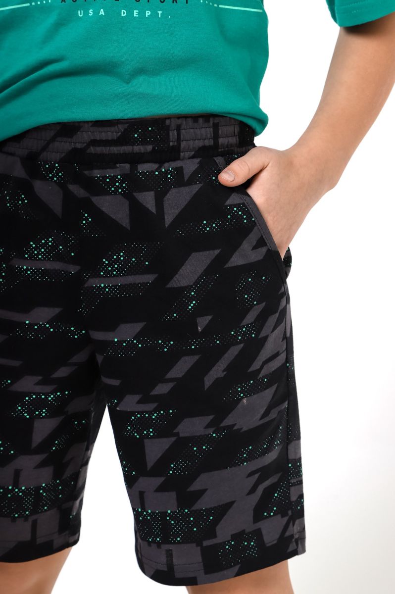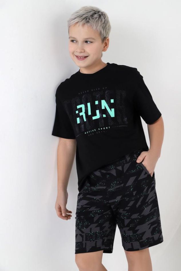 Костюм для мальчика, состоящий из футболки и шорт.Футболка - из гладкокрашеного полотна с принтом на детали переда, классического покроя, с короткими втачныыми рукавами, удлиненными плечевыми швами и горловиной овальной формы, обработанной втачной планкой. По шву втачивания планки в горловину настрочена отделочная строчка. Нижние срезы рукавов и изделия обработаны швом вподгибку.Шорты - из полотна с набивным рисунком,средней длины , на притачном поясе с эластичной тесьмой внутри и карманами в боковых швах с окантованными срезами Нижние срезы обработаны швом вподгибку.