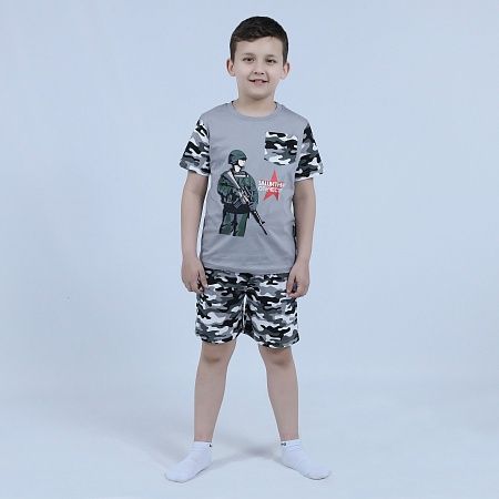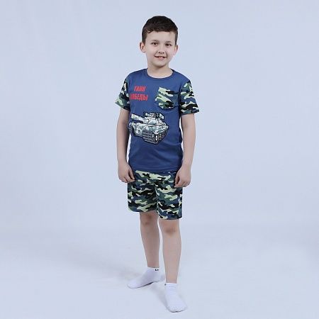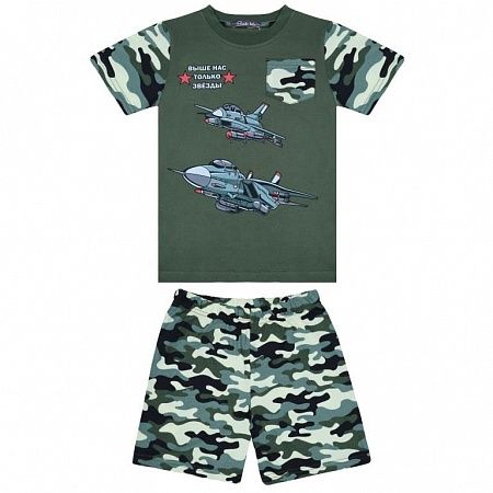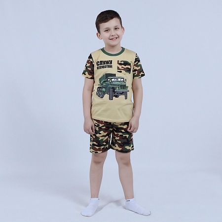 Комплект для мальчика от 6 до 9 лет. Модель состоит из футболки и шорт. Материал ткани хлопковое полотно кулирка ярких цветов с принтом военной тематики. Прекрасный комплект для лета. Цвета в ассортименте.