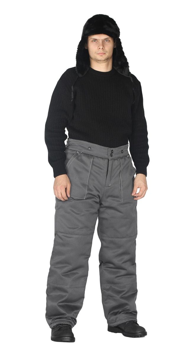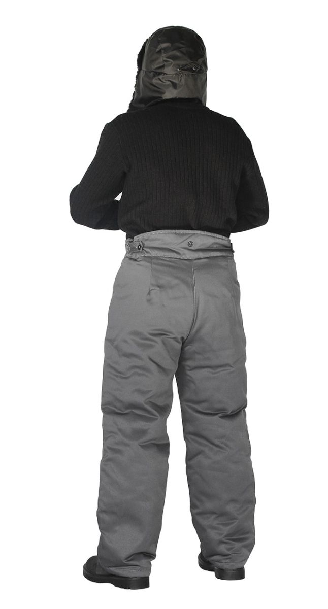 Брюки прямые, на широком утепленном поясе, завышенным со стороны спины, на съемных бретелях на пуговицах, регулируется по ширине с помощью хлястиков на пуговицах в боковых швах. Накладные карманы со складкой в верхней части брюк. По низу кулиса со шнуром-резинкой и фиксаторами.