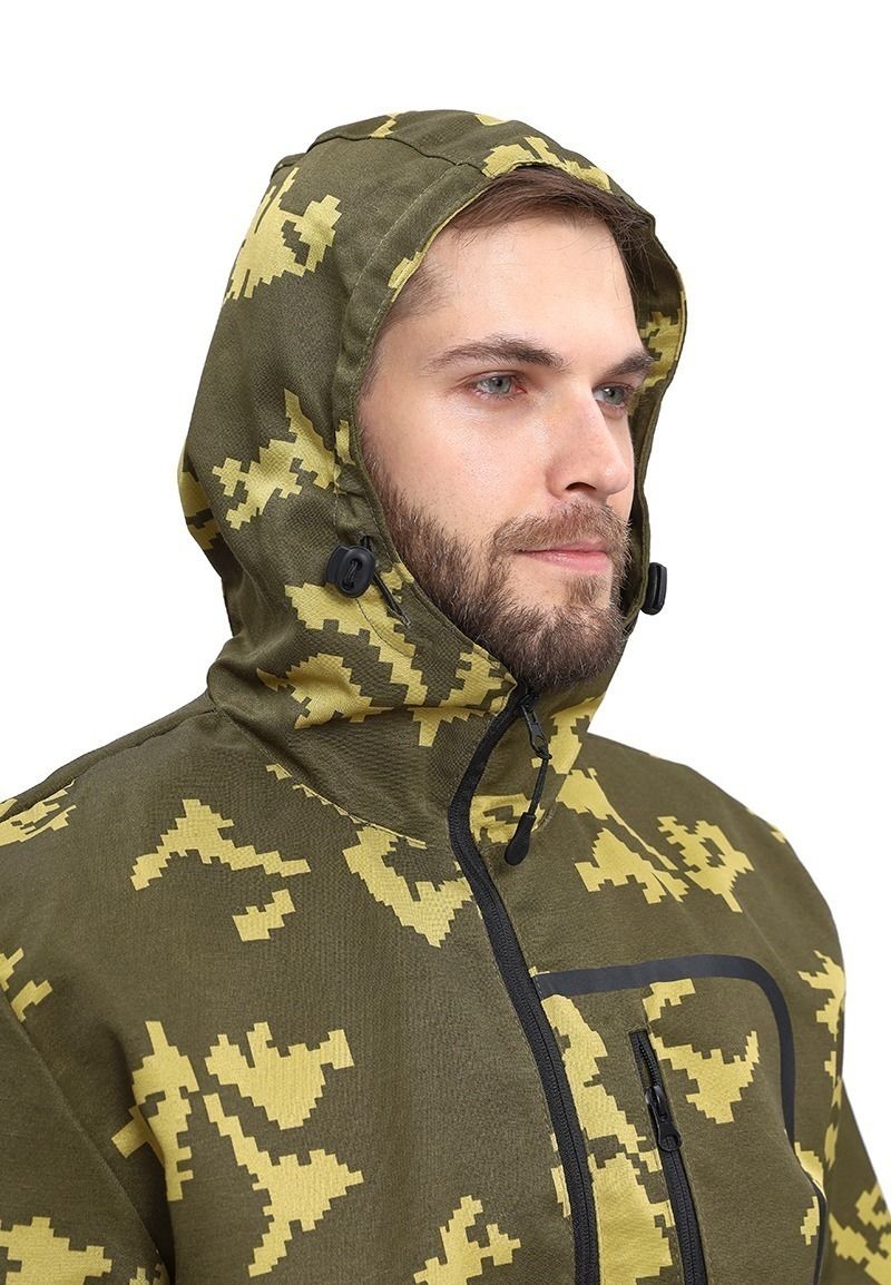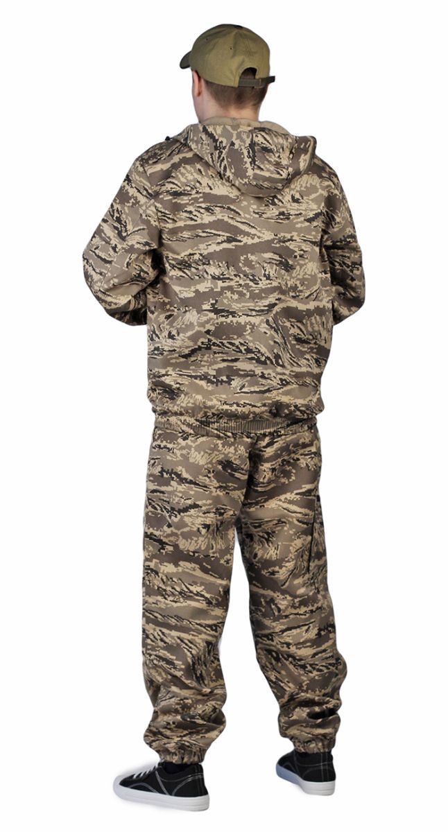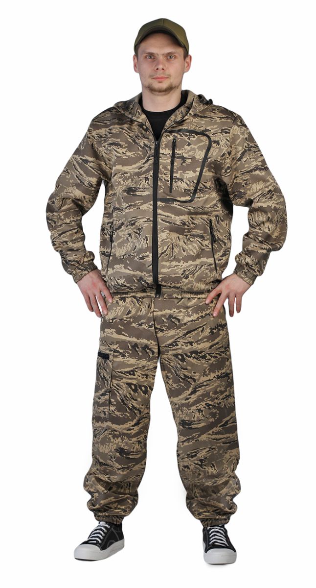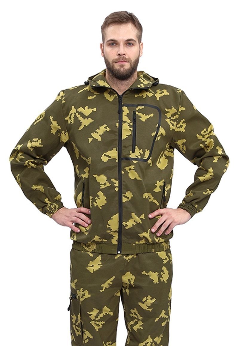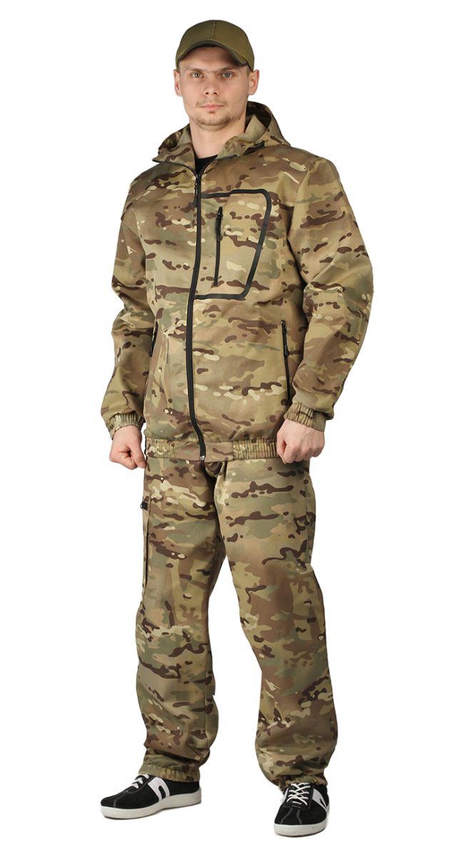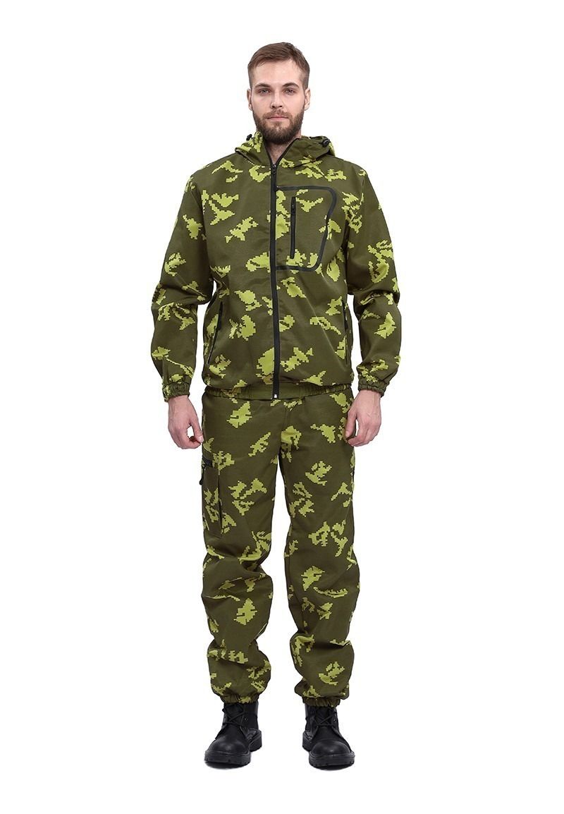 Камуфлированный унверсальный летний костюм для охоты, рыбалки и активного отдыха . Состоит из куртки с капюшоном и брюк. Куртка: • Регулируемый по лицевой части капюшон. • Центральная застежка-молния. • Боковые и нагрудный прорезные карманы на молнии, нагрудный карман выделен термонаклейкой • Низ куртки и манжеты на эластичной тесьме "резинка". Брюки: • Два боковых кармана и накладной объемный карман на молнии. • Пояс и низ брюк на эластичной тесьме "резинка".
