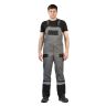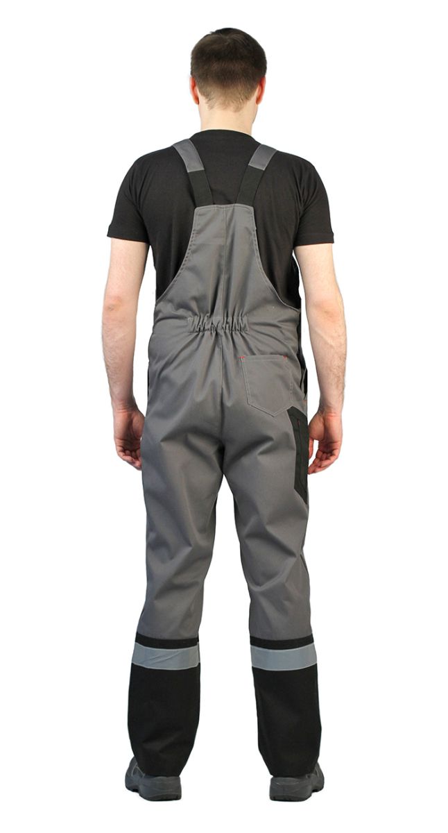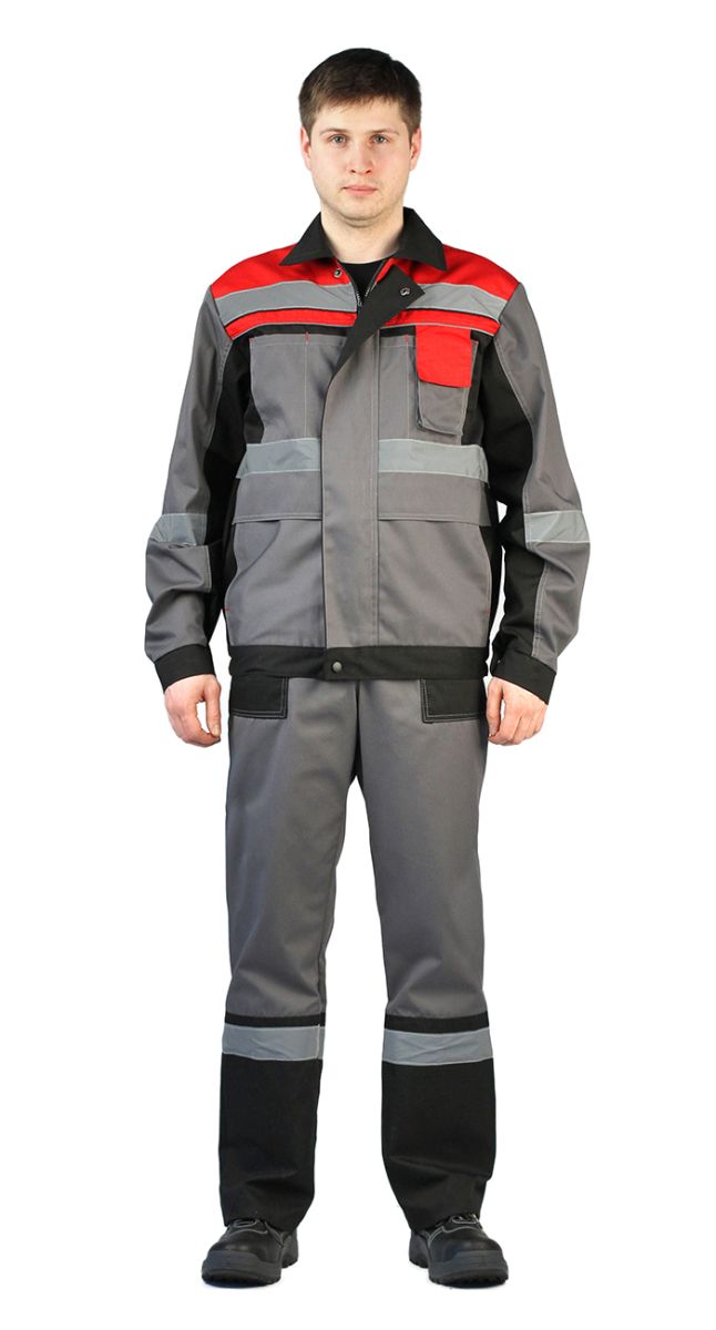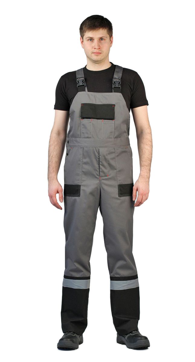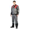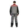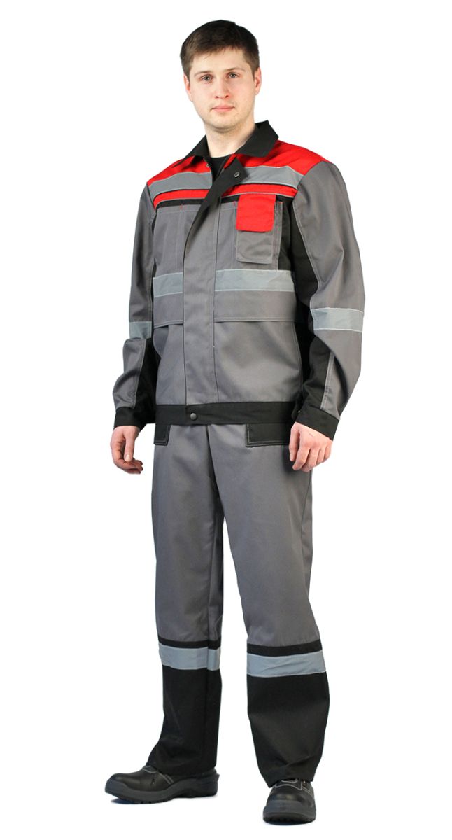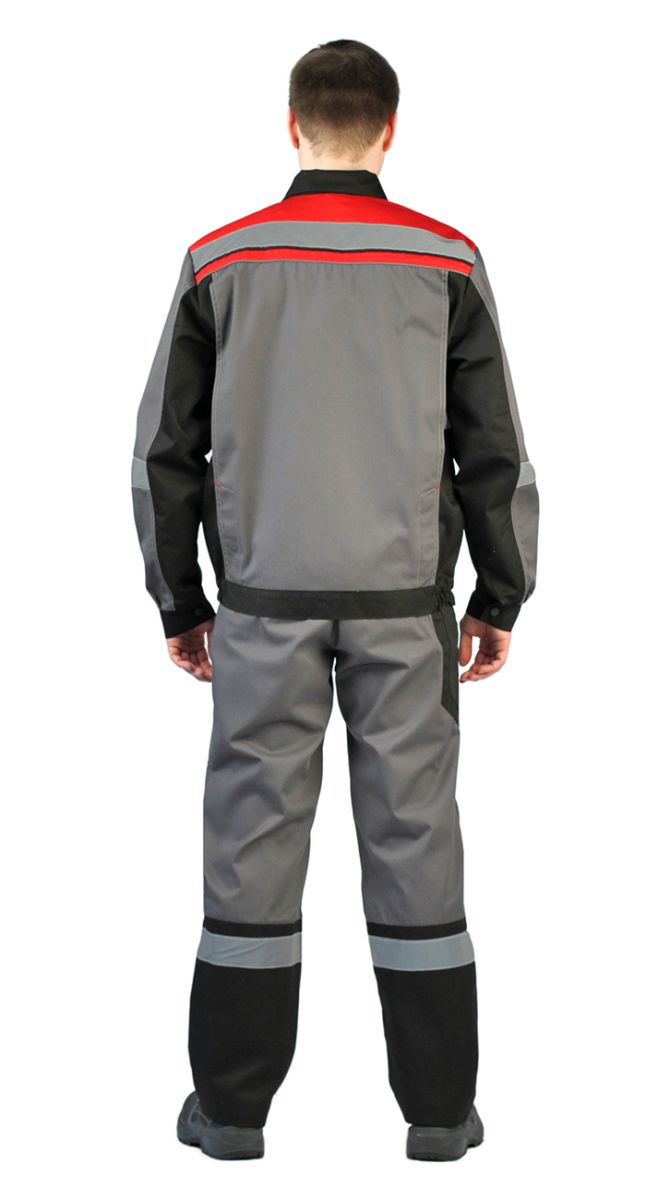 Костюм трехцветный, состоит из куртки и полукомбинезона. Куртка укороченная с притачным поясом на резинке с супатной застежкой на молнию. По кокеткам, полочкам, спинке, рукавам и брючинам расположены световозвращающие полосы, что позволяет использовать костюм в условиях плохой видимости. На куртке множество функциональных карманов, в том числе карман для средств связи с клапаном на липучке. Полукомбинезон с боковыми накладными карманами с усилениями. По талии и в бретелях эластичная лента. Интересное цветовое решение и наличие световозвращающей полосы выделяет костюм из множества.