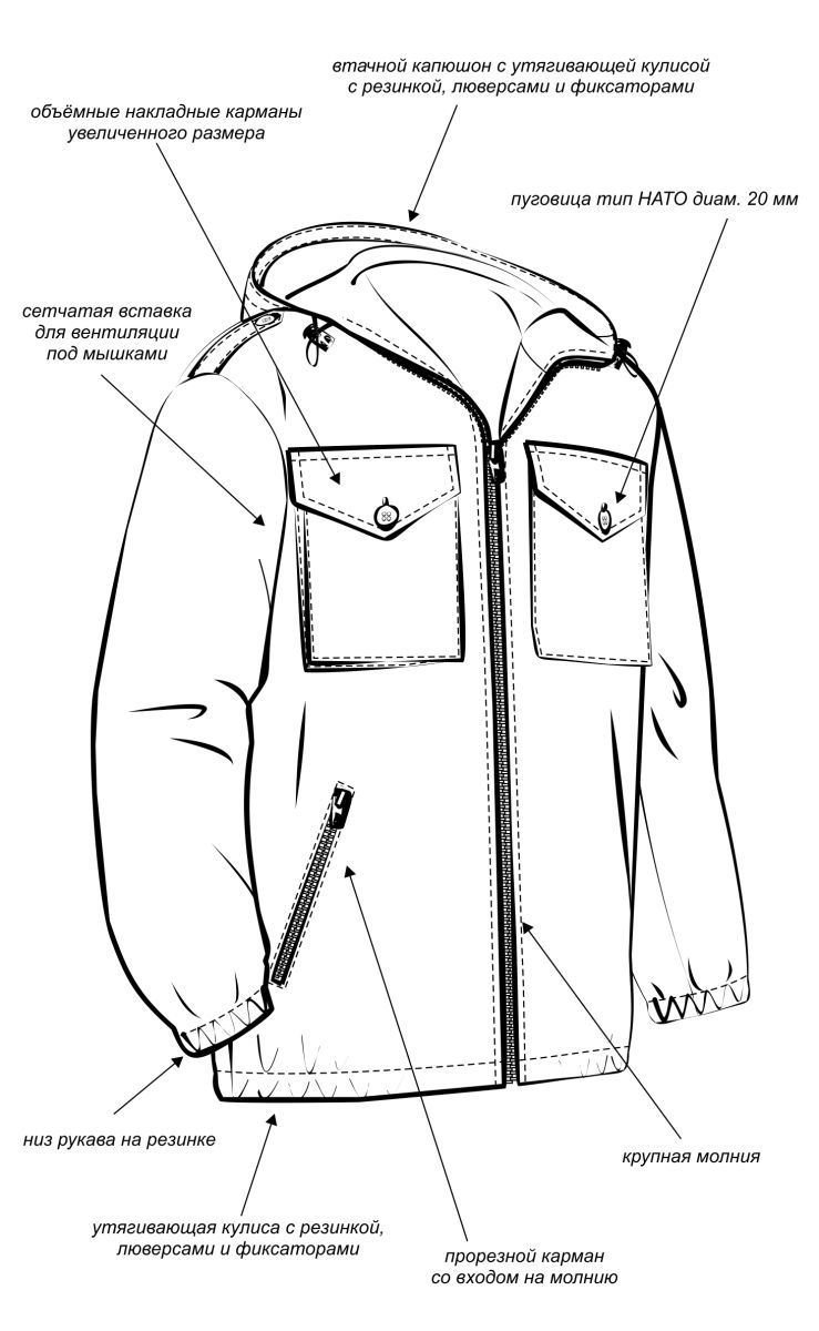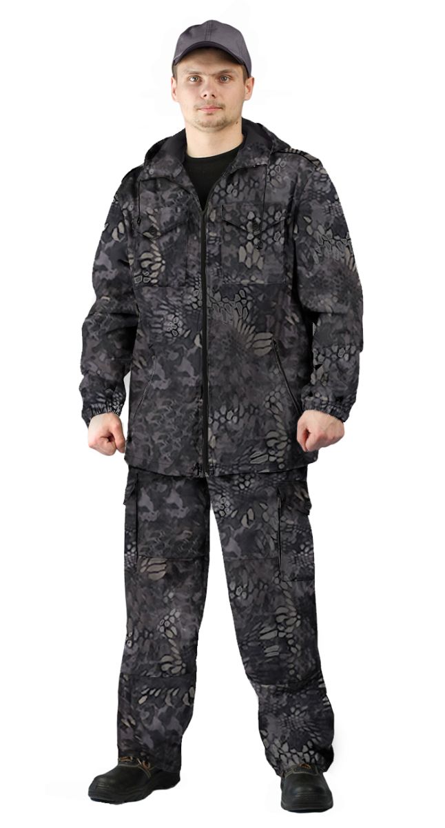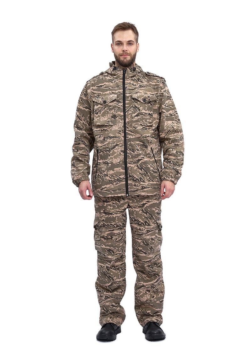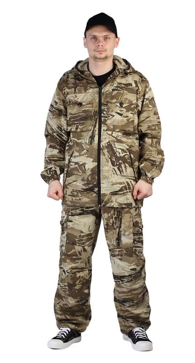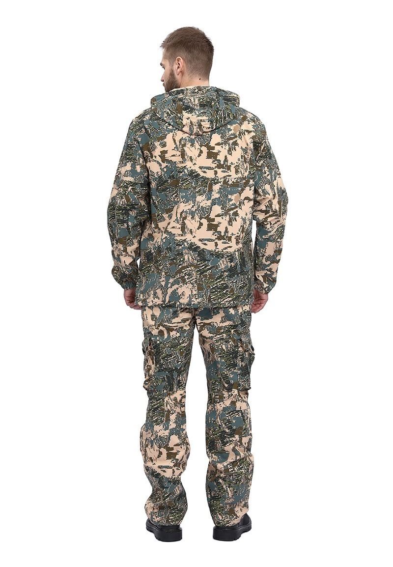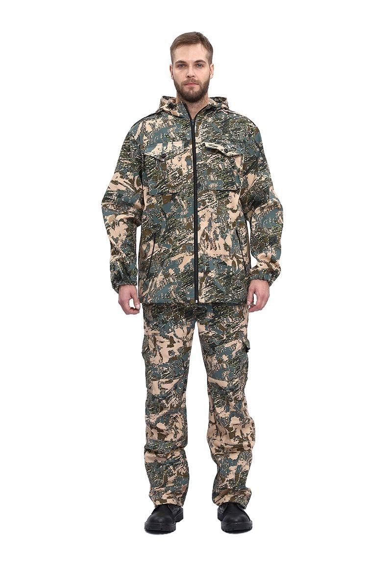 Универсальный летний костюм для охоты, рыбалки и активного отдыха, состоит из куртки и брюк. Куртка: - куртка с центральной застежкой на молнию - верхние объемные накладные карманы полупортфель с клапаном, застегивающимся на петлю и пуговицу - нижние прорезные карманы на молнии - декоративные погоны на пуговицах в области плечевого шва - рукава прямые на фиксированной резинке - по низу - кулиса со шляпной резинкой и фиксаторами для утяжки с держателем шнура в боковом шве - капюшон втачной с регулировкой по высоте и объему с помощью лицевой кулисы, шнура и фиксаторов, и хлястика на липучке в затылочной части Брюки: - брюки прямые на притачном поясе с частичной фиксированной резинкой по боковым сторонам - застежка-гульфик на молнии и пуговицей на поясе - верхние карманы с отрезным бочком, вход усилен закрепками - объемные боковые накладные карманы - полупортфель с клапаном, застегивающимся на петлю и пуговицу - вытачки для придания объема в области колена - по низу – кулиса со шляпной резинкой и фиксаторами для утяжки с держателем шнура в боковом шве