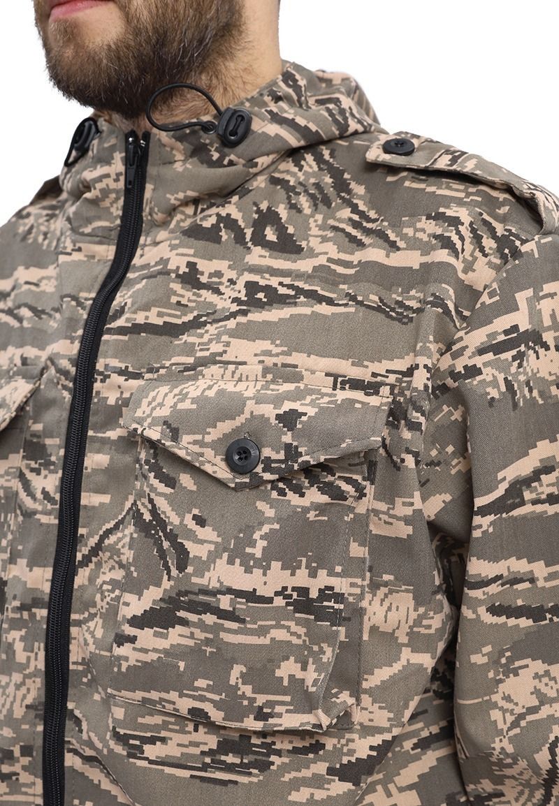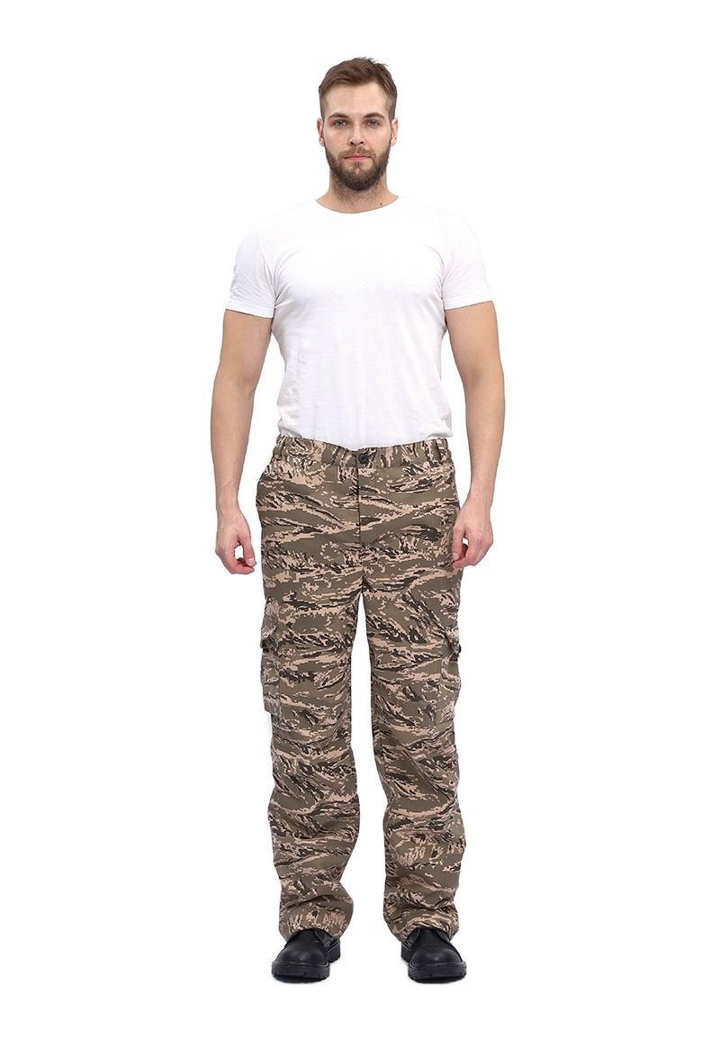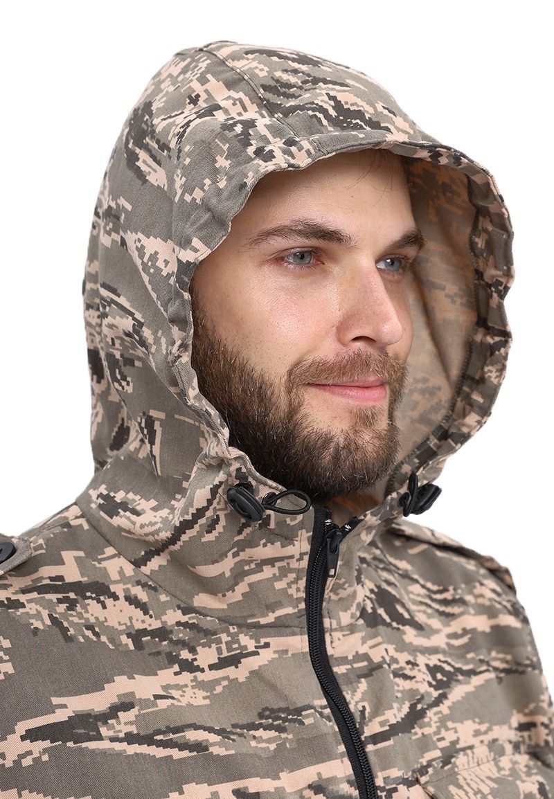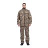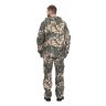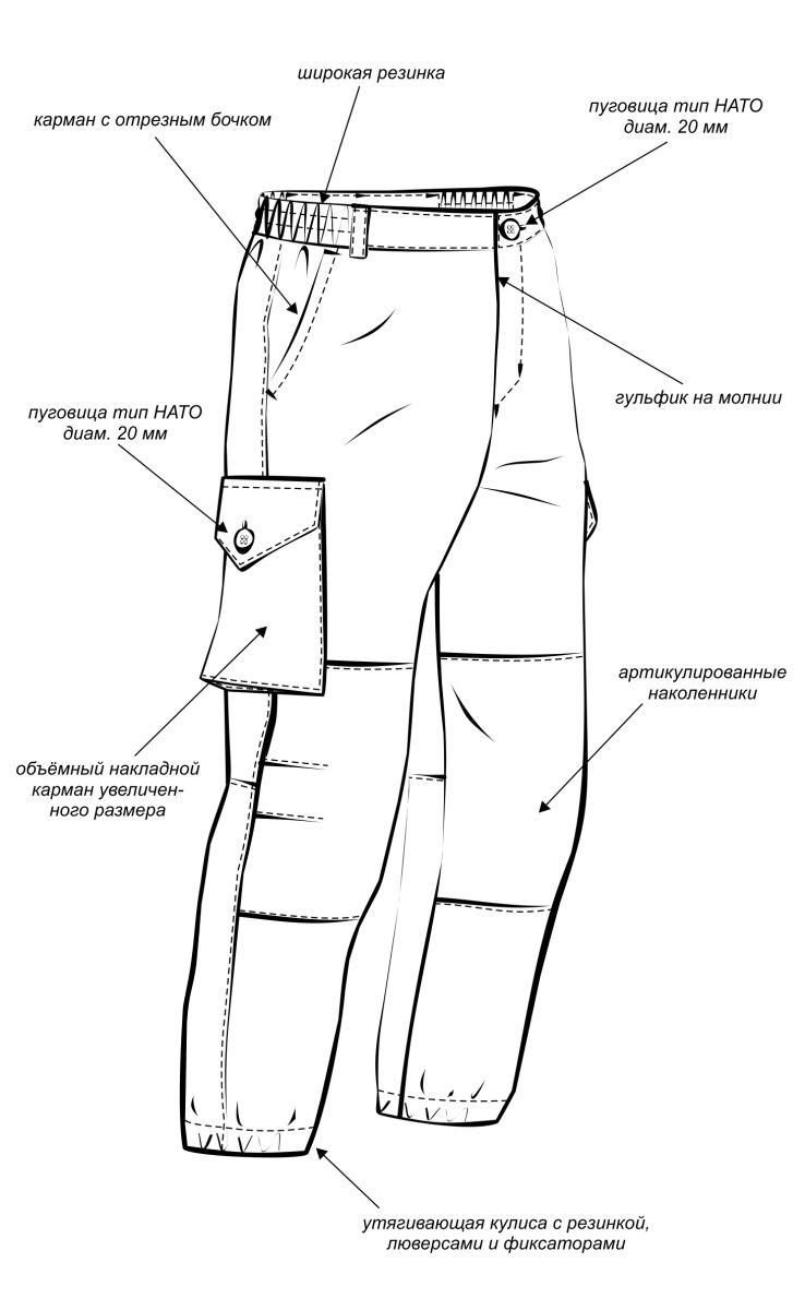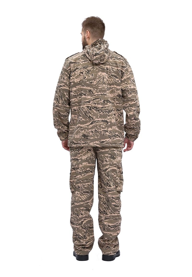 Универсальный летний костюм для охоты, рыбалки и активного отдыха, состоит из куртки и брюк. Куртка: - куртка с центральной застежкой на молнию - верхние объемные накладные карманы полупортфель с клапаном, застегивающимся на петлю и пуговицу - нижние прорезные карманы на молнии - декоративные погоны на пуговицах в области плечевого шва - рукава прямые на фиксированной резинке - по низу - кулиса со шляпной резинкой и фиксаторами для утяжки с держателем шнура в боковом шве - капюшон втачной с регулировкой по высоте и объему с помощью лицевой кулисы, шнура и фиксаторов, и хлястика на липучке в затылочной части Брюки: - брюки прямые на притачном поясе с частичной фиксированной резинкой по боковым сторонам - застежка-гульфик на молнии и пуговицей на поясе - верхние карманы с отрезным бочком, вход усилен закрепками - объемные боковые накладные карманы - полупортфель с клапаном, застегивающимся на петлю и пуговицу - вытачки для придания объема в области колена - по низу – кулиса со шляпной резинкой и фиксаторами для утяжки с держателем шнура в боковом шве