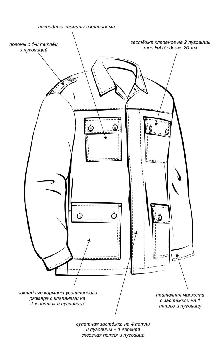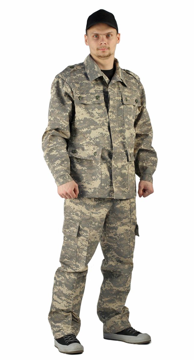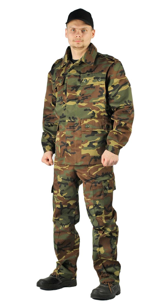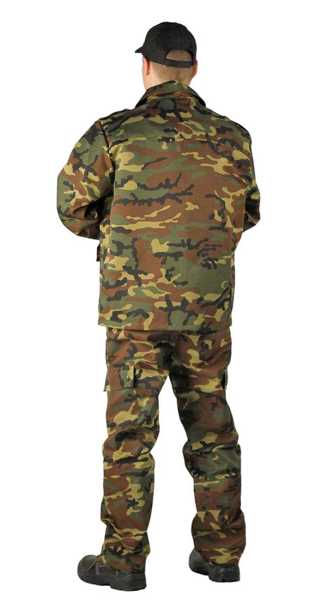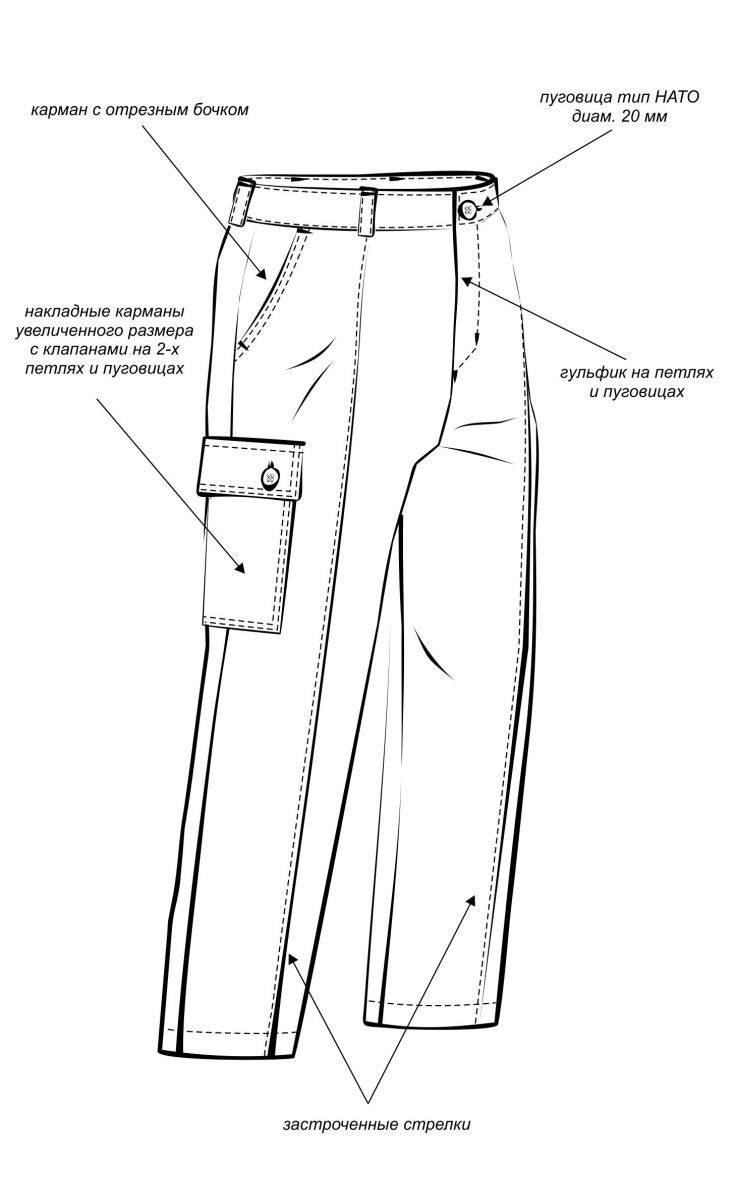 Костюм мужской, летний, прямого силуэта, состоит из куртки и брюк. Куртка: - центральная супатная застежка на пуговицы; - отложной воротник; - декоративные погоны с петлей и пуговицей; - нагрудные и нижние накладные карманы с защитным клапаном, застегивающимся на петлю и пуговицу; - рукав на притачной манжете с застежкой на пуговицу; Брюки: - карманы с отрезным бочком и объемные боковые накладные карманы с защитным клапаном, застегивающимся на петлю и пуговицу; - центральная застежка гульфик на петли и пуговицы; - притачной пояс со шлевками под ремень; - передняя часть брюк выделена застроченными стрелками.