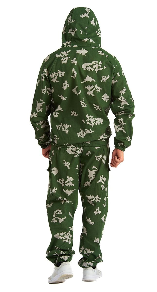 Куртка свободного кроя: -Регулируемый капюшон; -Антимоскитная сетка на молнии с защитным клапаном, внизу на "липучке" -Центральная застежка молния; -Боковые прорезные карманы на молнии; -Низ куртки на резинке, трикотажные манжеты; Брюки свободного кроя: - Два накладных кармана на липучке; - Пояс и низ брюк на резинке