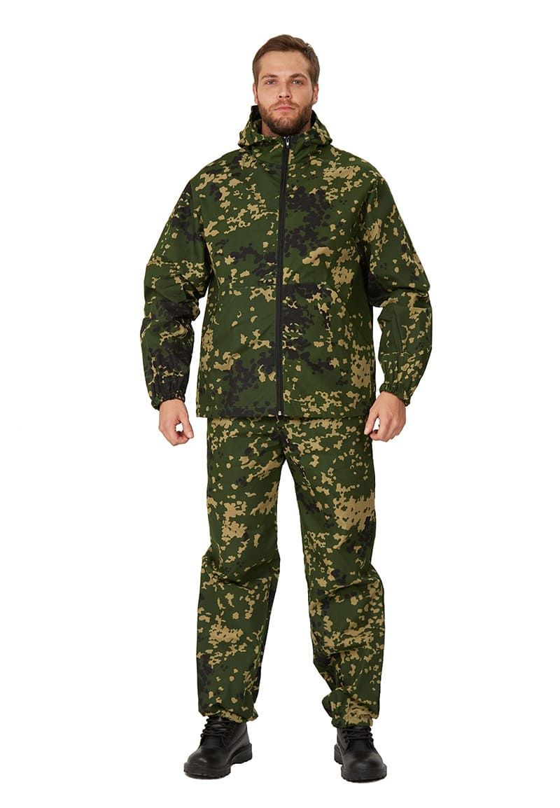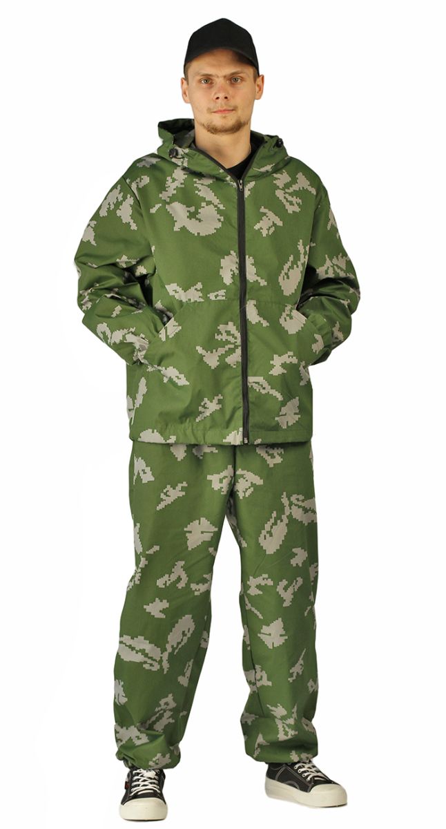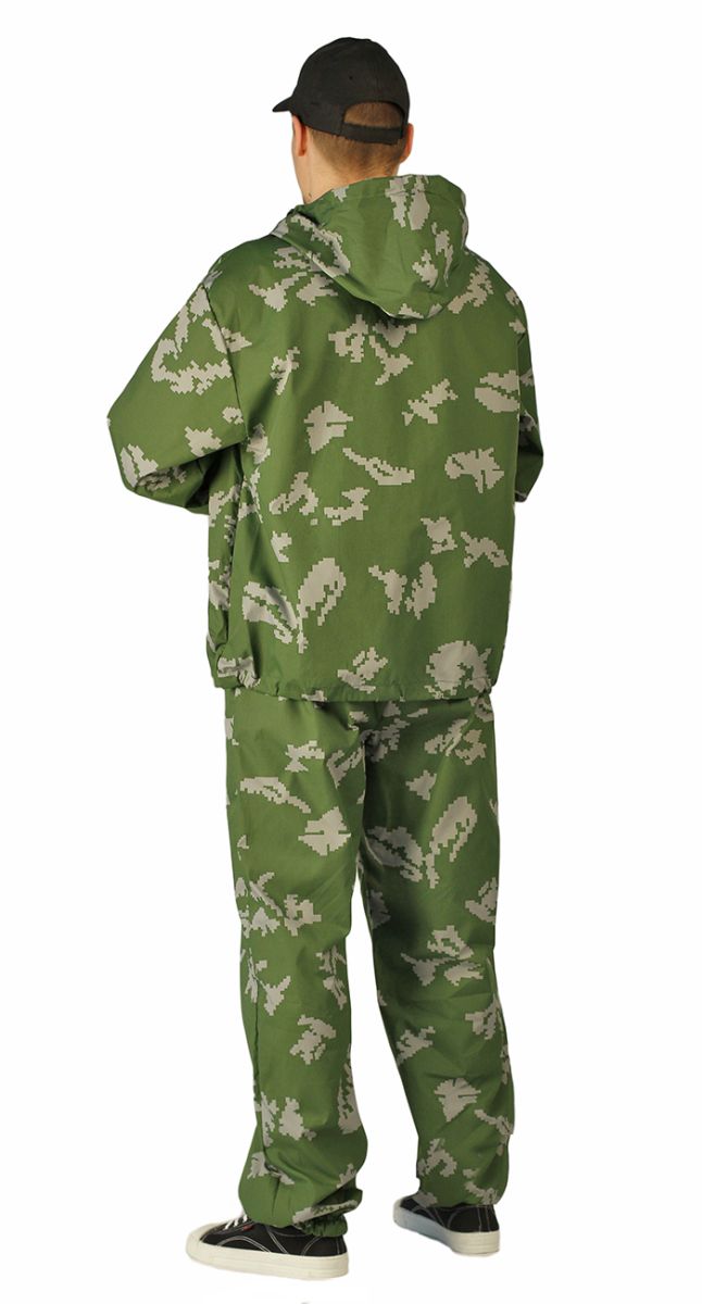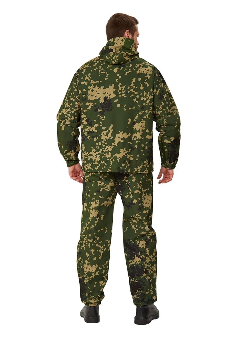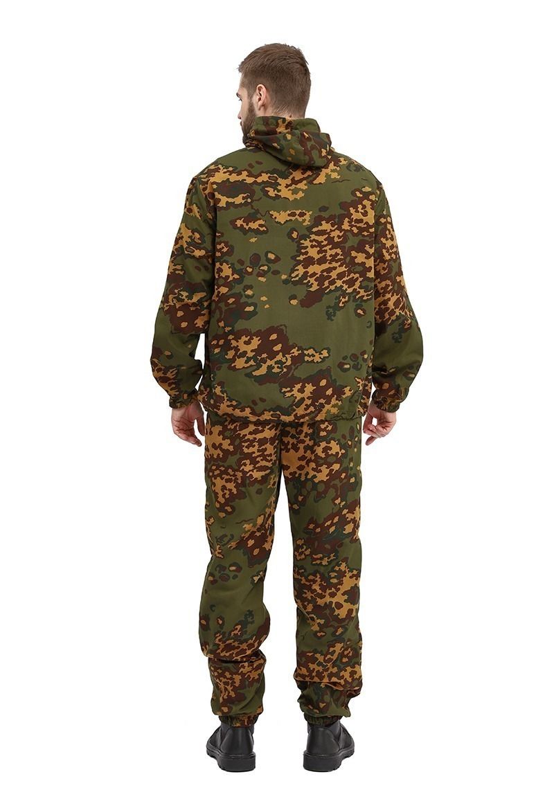 Костюм “Маскхалат” используется в качестве маскировочного костюма, состоящего из куртки и брюк. Куртка - центральная бортовая застежка на молнию - нижние фигурные накладные карманы с наклонным входом - спинка прямая, цельнокроеная - рукава прямые, низ собран с помощью эластичной резинки - по низу куртки расположена кулиса, утяжкой служит шляпная резинка с фиксаторами, проходящая через держатель шнура, расположенного в боковом шве куртки - капюшон втачной с кулисой по лицевому срезу, утяжкой служит шляпная резинка с фиксаторами Брюки: - прямые на притачном поясе, собранном фиксированной эластичной резинкой - в верхней части расположены карманы, с отрезным бочком - низ брюк собран фиксированной эластичной резинкой