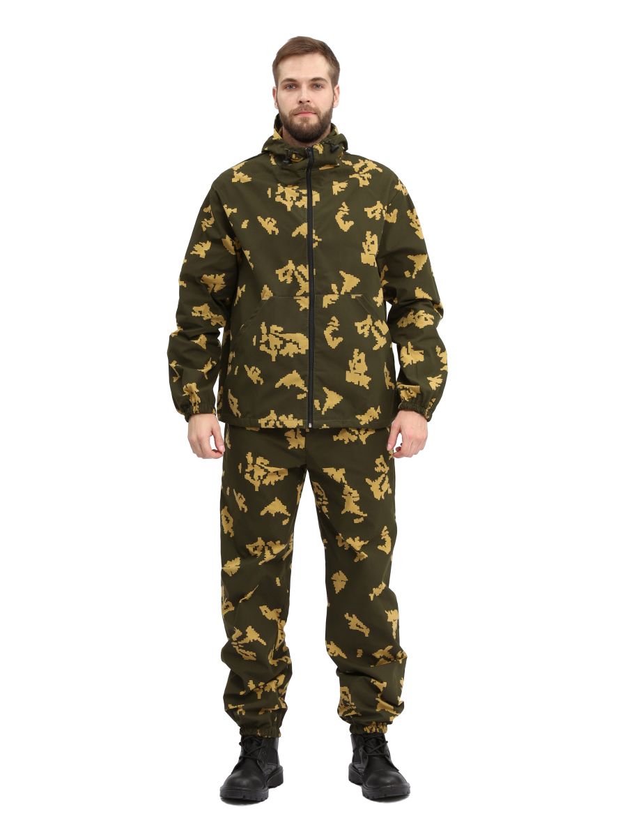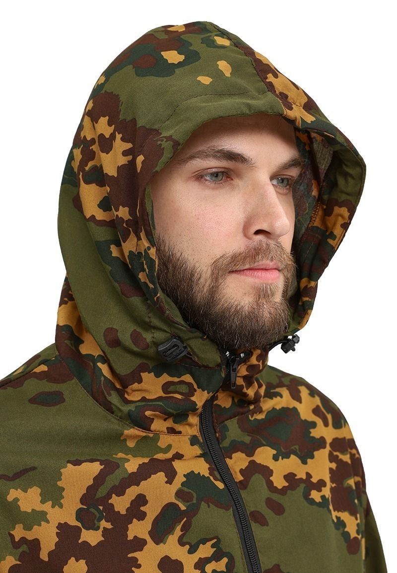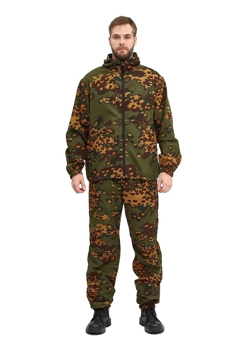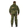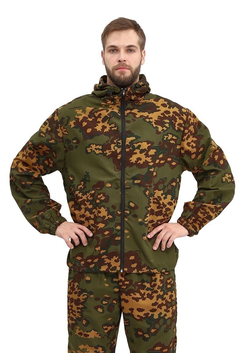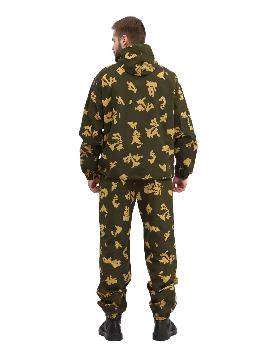 Костюм “Маскхалат” используется в качестве маскировочного костюма, состоящего из куртки и брюк. Куртка - центральная бортовая застежка на молнию - нижние фигурные накладные карманы с наклонным входом - спинка прямая, цельнокроеная - рукава прямые, низ собран с помощью эластичной резинки - по низу куртки расположена кулиса, утяжкой служит шляпная резинка с фиксаторами, проходящая через держатель шнура, расположенного в боковом шве куртки - капюшон втачной с кулисой по лицевому срезу, утяжкой служит шляпная резинка с фиксаторами Брюки: - прямые на притачном поясе, собранном фиксированной эластичной резинкой - в верхней части расположены карманы, с отрезным бочком - низ брюк собран фиксированной эластичной резинкой