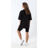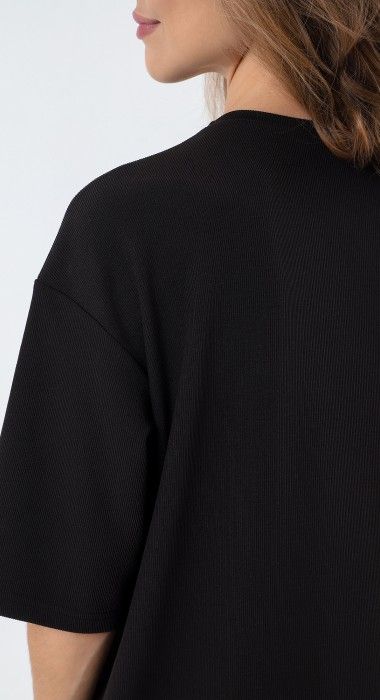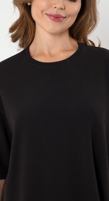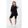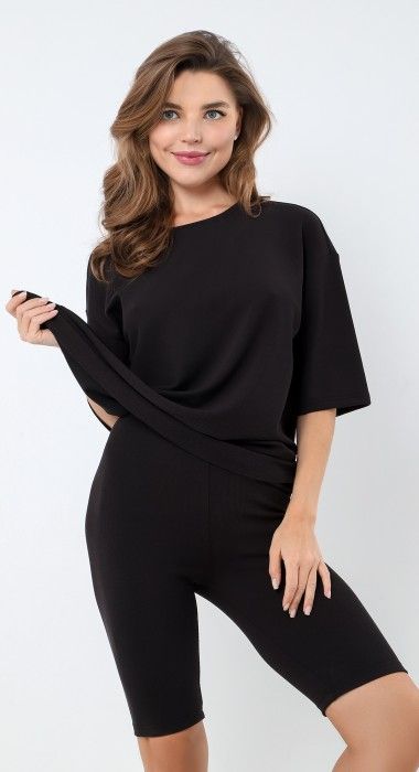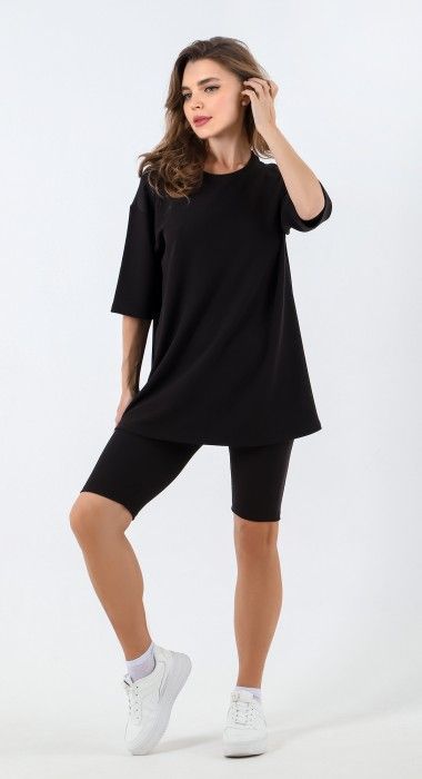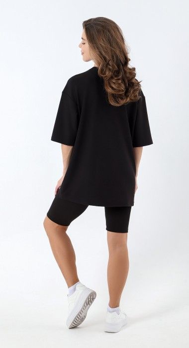 Костюм женский из гладкокрашенного трикотажного полотна в рубчик («лапша»), состоящий из футболки и леггинсов. Футболка – удлиненная, свободного покроя, со спущенной, линией плеча, короткими втачными рукавами, горловиной овальной формы, обработанной втачной планкой.Леггинсы – длиной до колен, с эластичной тесьмой по талии.