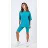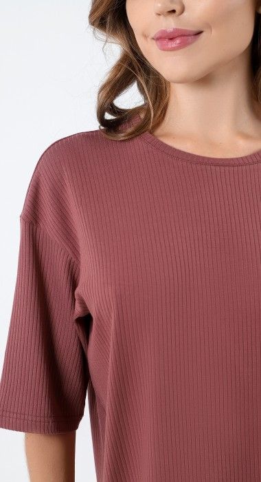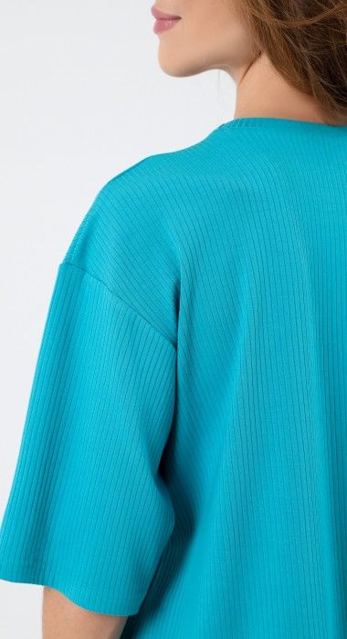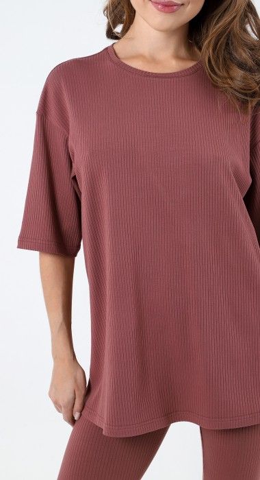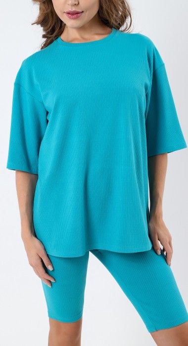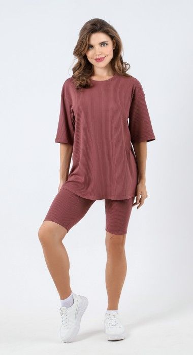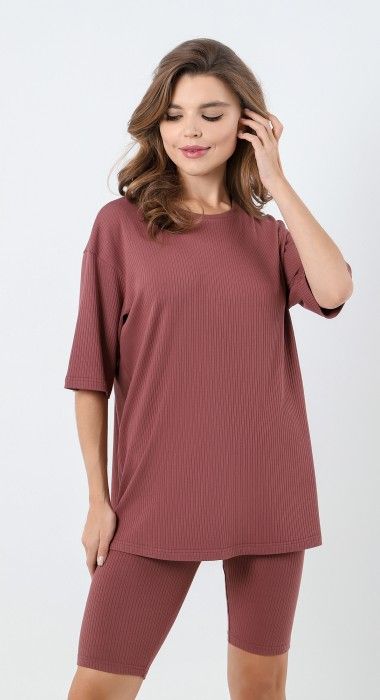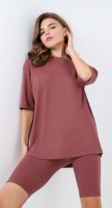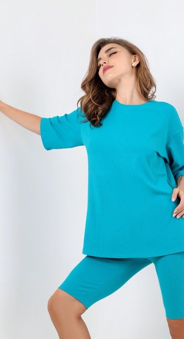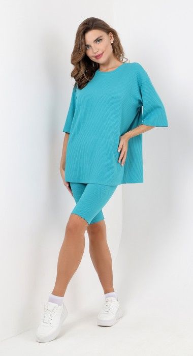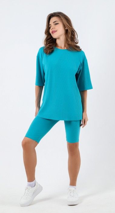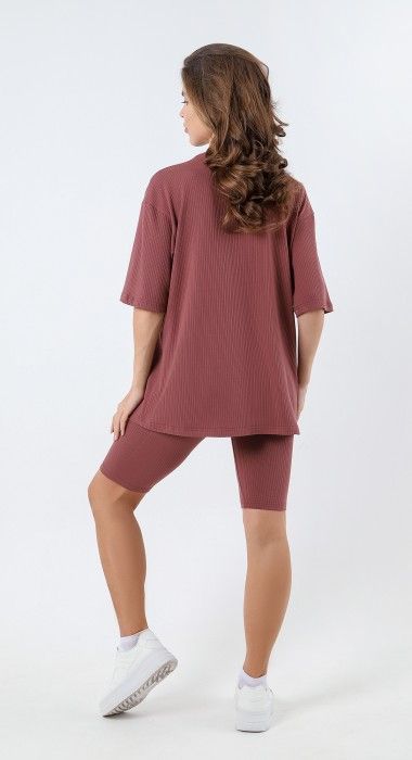Костюм женский из гладкокрашенного трикотажного полотна в рубчик («лапша»), состоящий из футболки и леггинсов. Футболка – удлиненная, свободного покроя, со спущенной, линией плеча, короткими втачными рукавами, горловиной овальной формы, обработанной втачной планкой.Леггинсы – длиной до колен, с эластичной тесьмой по талии.
