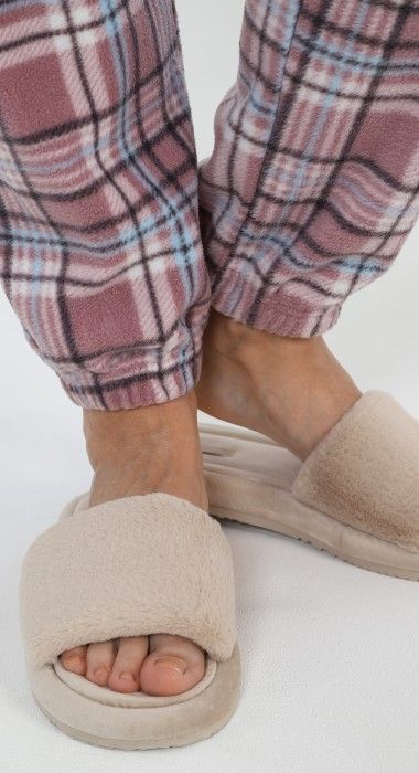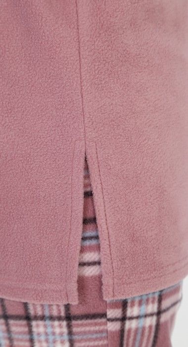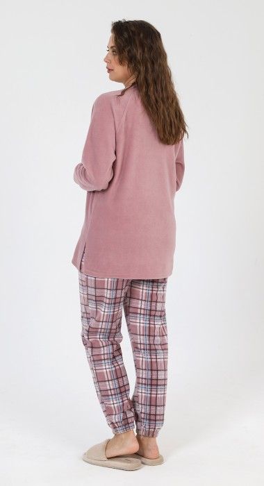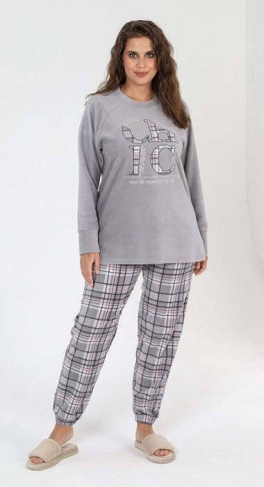 Костюм из трикотажного полотна «флис» в комбинации двух видов в единой цветовой гамме: гладкокрашеного и с рисунком в клетку, состоящий из джемпера и брюк. Джемпер – из гладкокрашеного полотна, с длинными рукавами покроя «реглан», горловиной овальной формы, обработанной втачной бейкой, разрезами в боковых швах и вышивкой на полочке. Рукава – с притачными манжетами. По горловине отделочная строчка. Брюки – из полотна с рисунком в клетку, длинные, на поясе с эластичной тесьмой внутри.