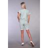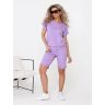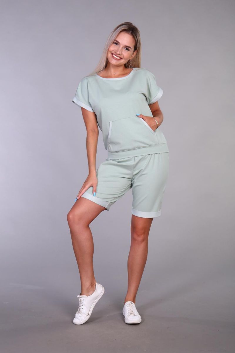 Костюм женский из футера двунитки с лайкрой. Кофта укороченная на притачном поясе, с коротким рукавом со спущенным плечом, накладной карман - "кенгуру". Шорты удлиненные, пояс на резинке, по низу - отложные манжеты.